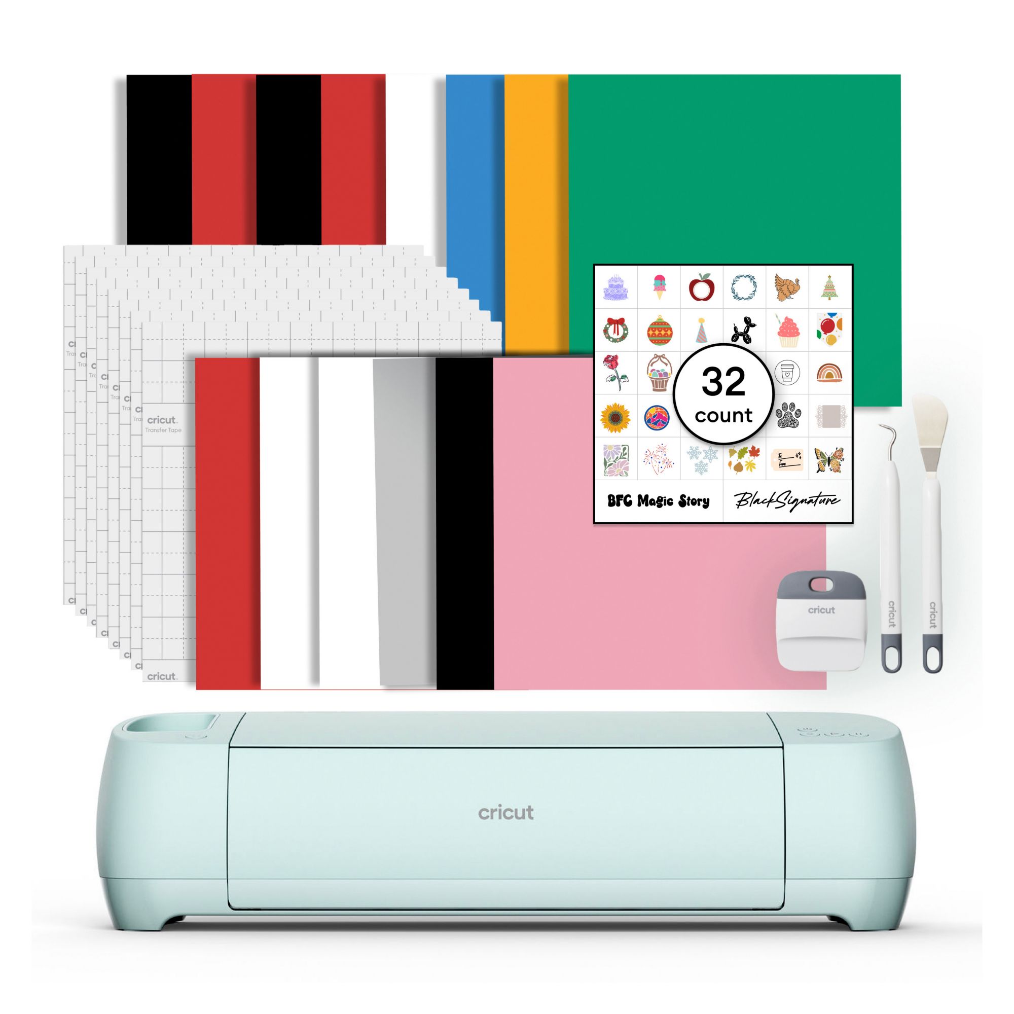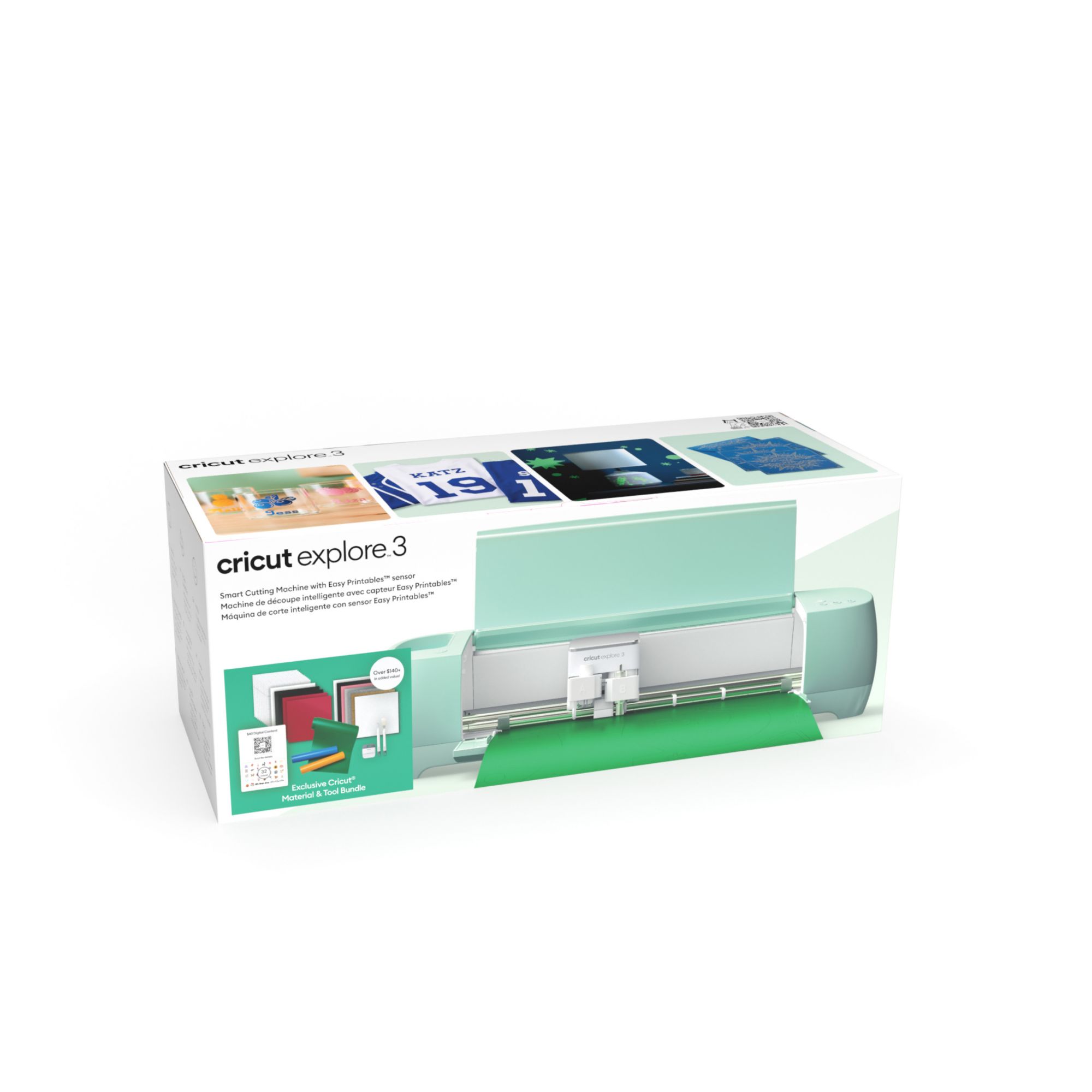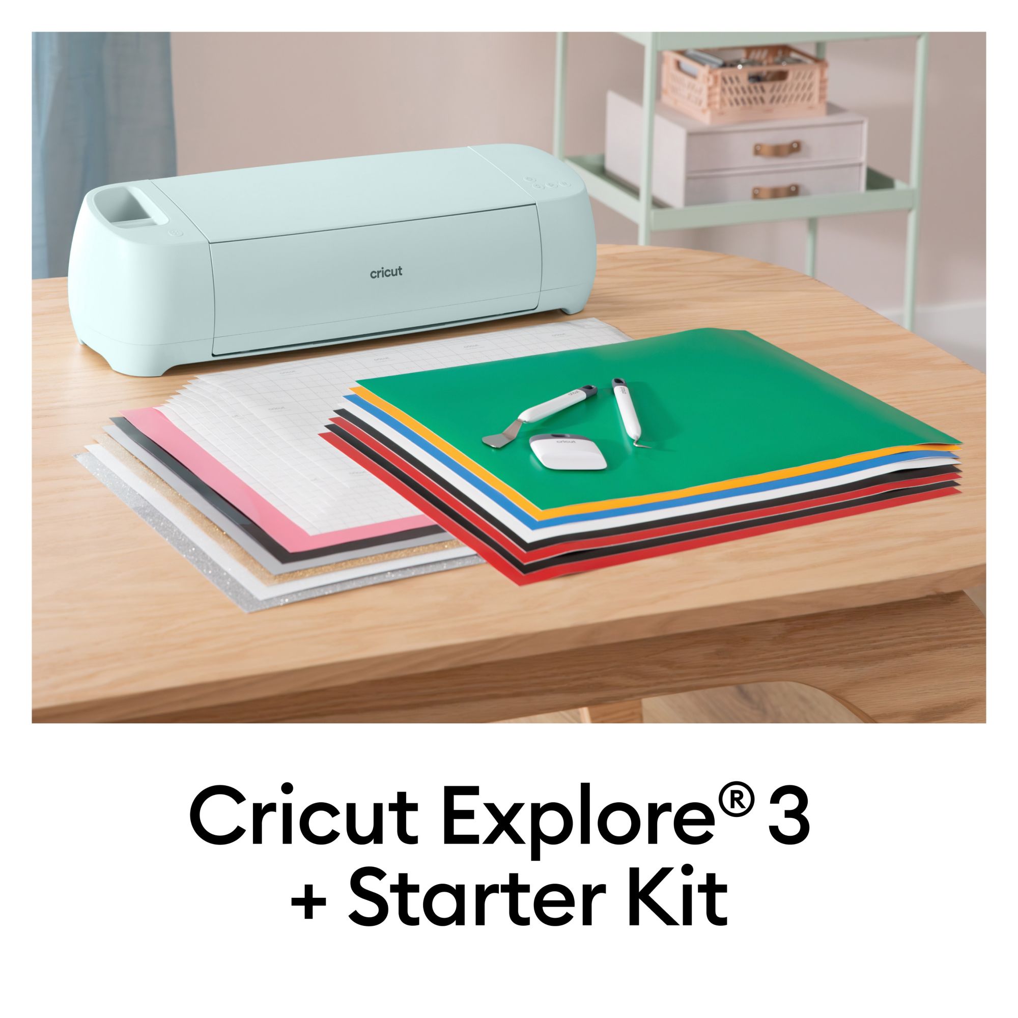 Includes Cricut Explore 3 machine, Cricut weeder tool, Cricut spatula tool, Cricut scraper tool, Cricut smart materials 13"x18", Cricut transfer tape 12"x18"