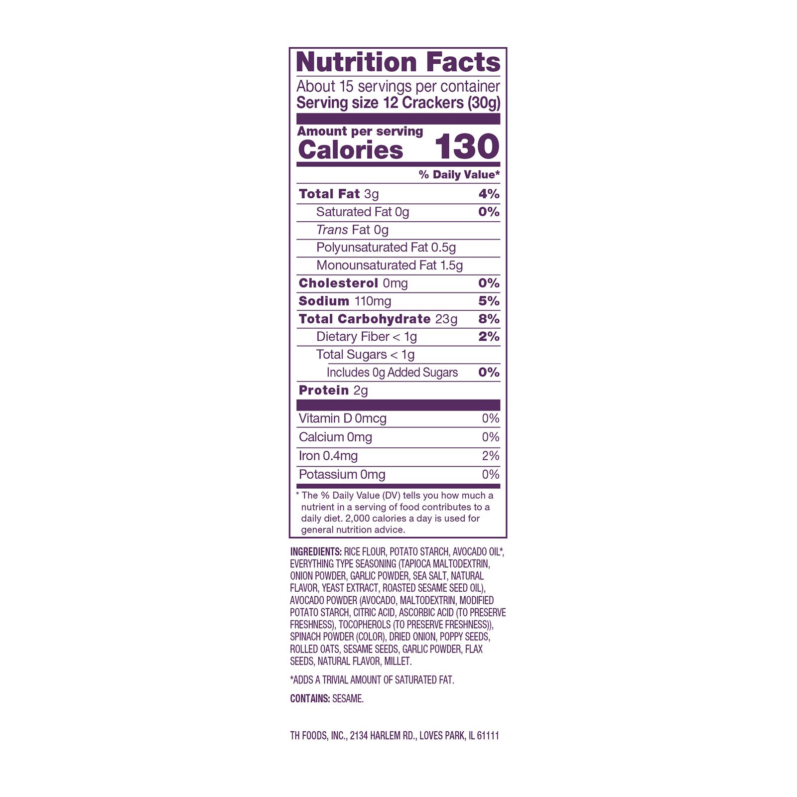 Ingredients: Rice Flour, Potato Starch, Avocado Oil*, Everything Type Seasoning (Tapioca Maltodextrin, Onion Powder, Garlic Powder, Sea Salt, Natural Flavor, Yeast Extract, Roasted Sesame Seed Oil), Avocado Powder (Avocado, Maltodextrin, Modified Potato Starch, Citric Acid, Ascorbic Acid [to preserve freshness], Tocopherols [to preserve freshness]), Spinach Powder (COLOR), Dried Onion, Poppy Seeds, Rolled Oats, Sesame Seeds, Garlic Powder, Flax Seeds, Natural Flavor, Millet. *Adds A Trivial Amount of Saturated Fat.