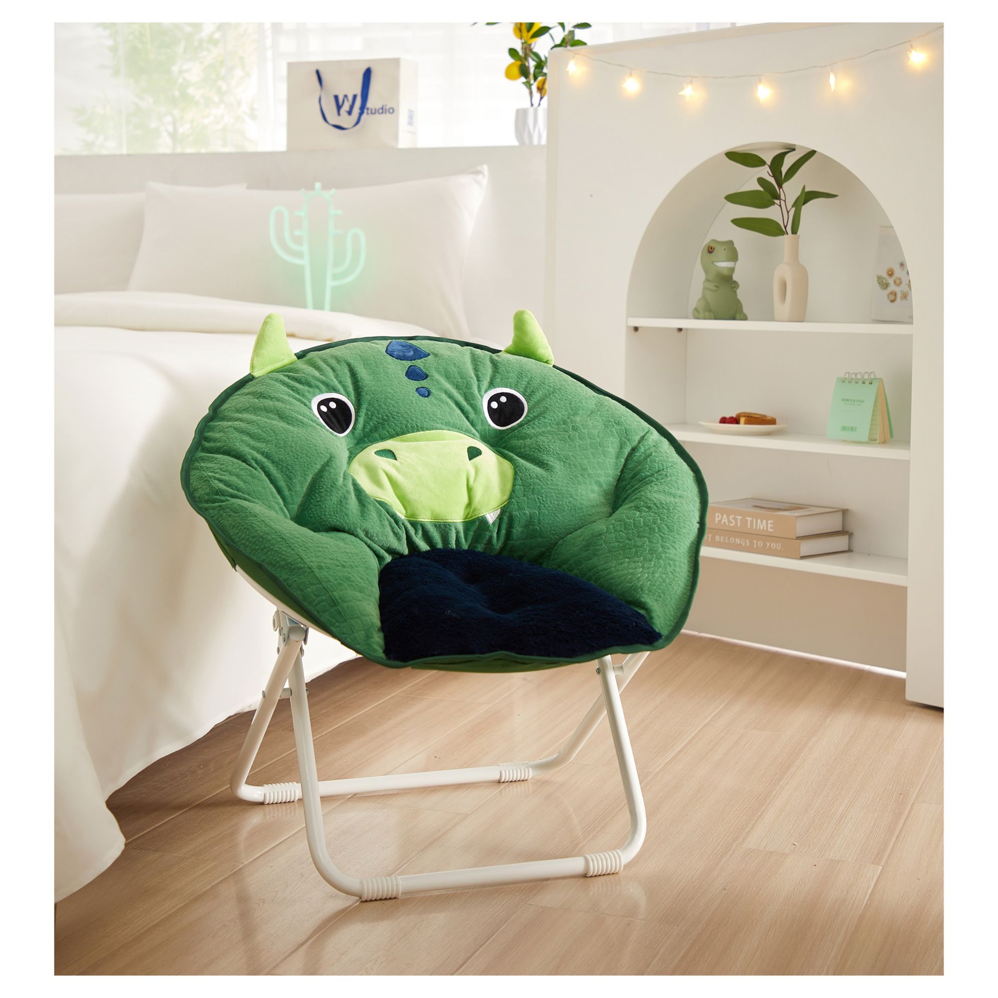 Kids fun furry character saucer chair. Adds fun flair to any kids room. The super soft saucer chair folds conveniently for easy storage. The chair measures 23" and made with Polyester material with a sturdy metal frame.