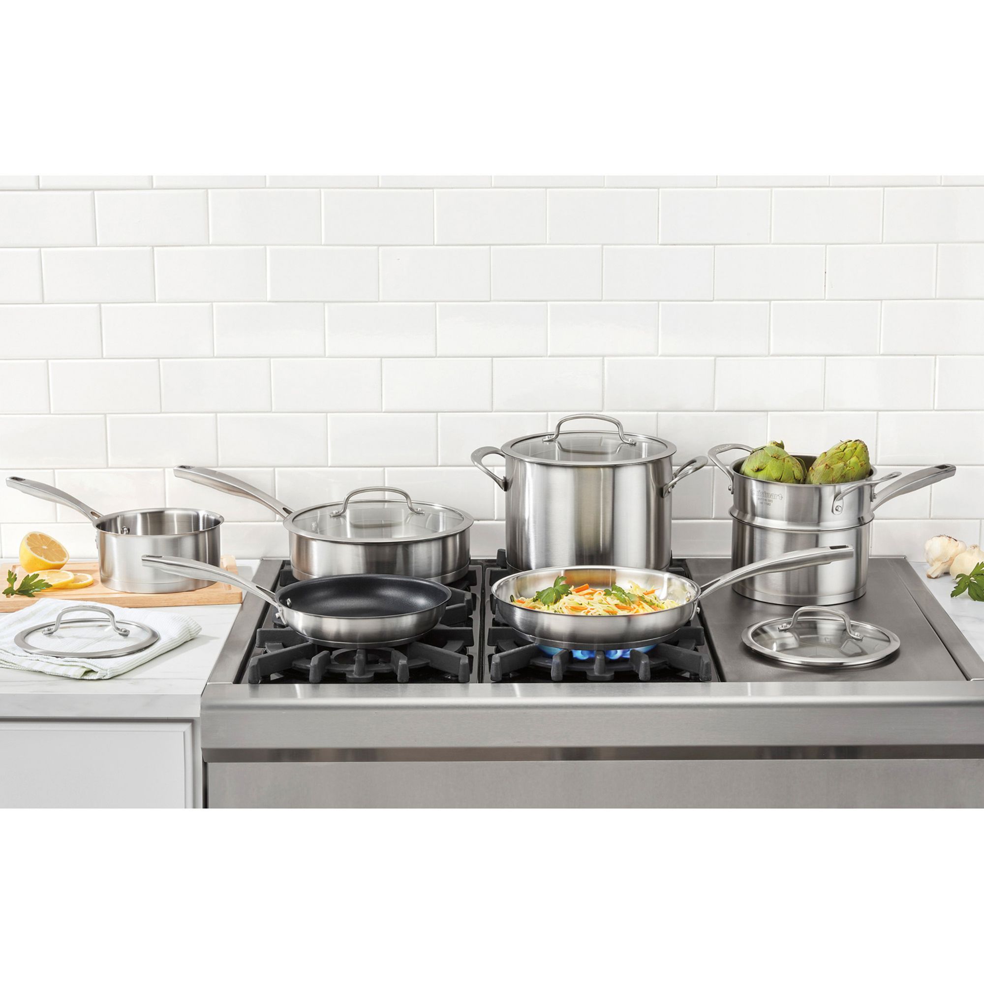 The Cuisinart 11 Piece Professional Stainless Steel Set is composed of premium Stainless Steel construction, with brushed stainless exterior. This set features the Cuisinart exclusive PowerBond High Impact Bonded Base. These products offer unsurpassed heat distribution, cool grip stainless stick handles, tempered flavor lock glass lids, measurement markings, and drip free rims for mess-free pouring. This set is induction ready and dishwasher safe. The set includes a 1.5 qt. saucepan with cover, 2.5 qt. saucepan, 3 qt. sauté pan with cover, 6 qt. stockpot with cover, 8" nonstick skillet, 10" stainless skillet, and 18 cm steamer insert.