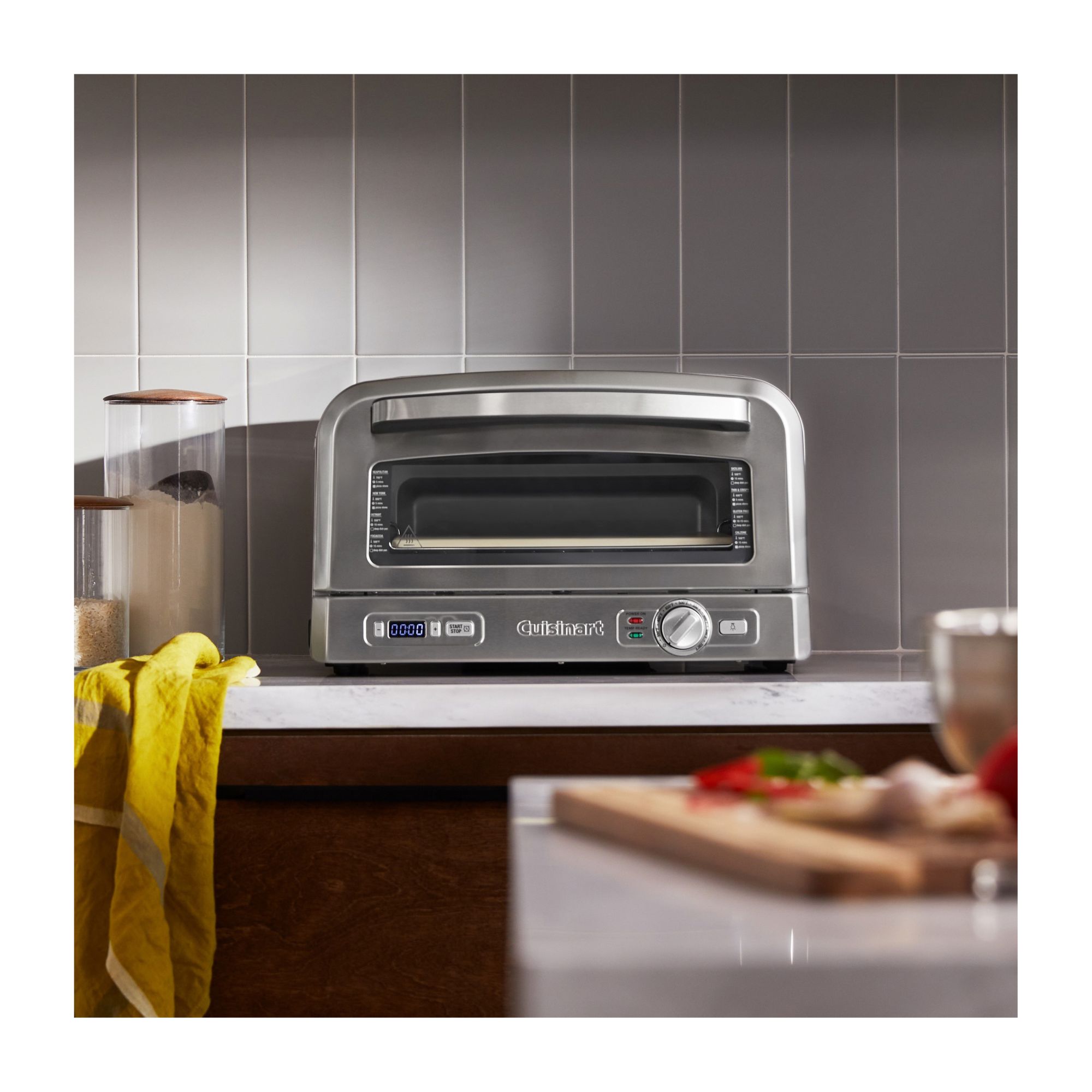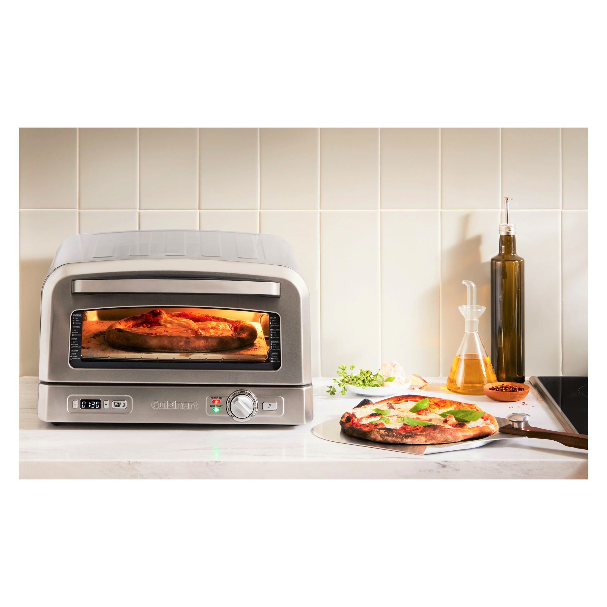 Do pizza night right with the Cuisinart Indoor Pizza Oven - a must-have for making artisanal 12” pizzas right in your kitchen. Cook authentic Neapolitan pizza in 5 minutes or less and explore other regional favorites like deep dish, Detroit style, and New York style pizzas, all customized with your favorite toppings. This countertop oven uses radiant heat to reach 700° - the ideal temperature for cooking the crispy crust and bubbling cheese you love for the tastiest, most authentic flavor. Engineered with active cooling technology, ideal for indoor use. Includes a 12.5” heat-conducting pizza stone for a delectably crispy crust, a deep dish pan, and a pizza peel for sliding pies in and out of the oven. Slice through the ordinary with the Cuisinart Indoor Pizza Oven.