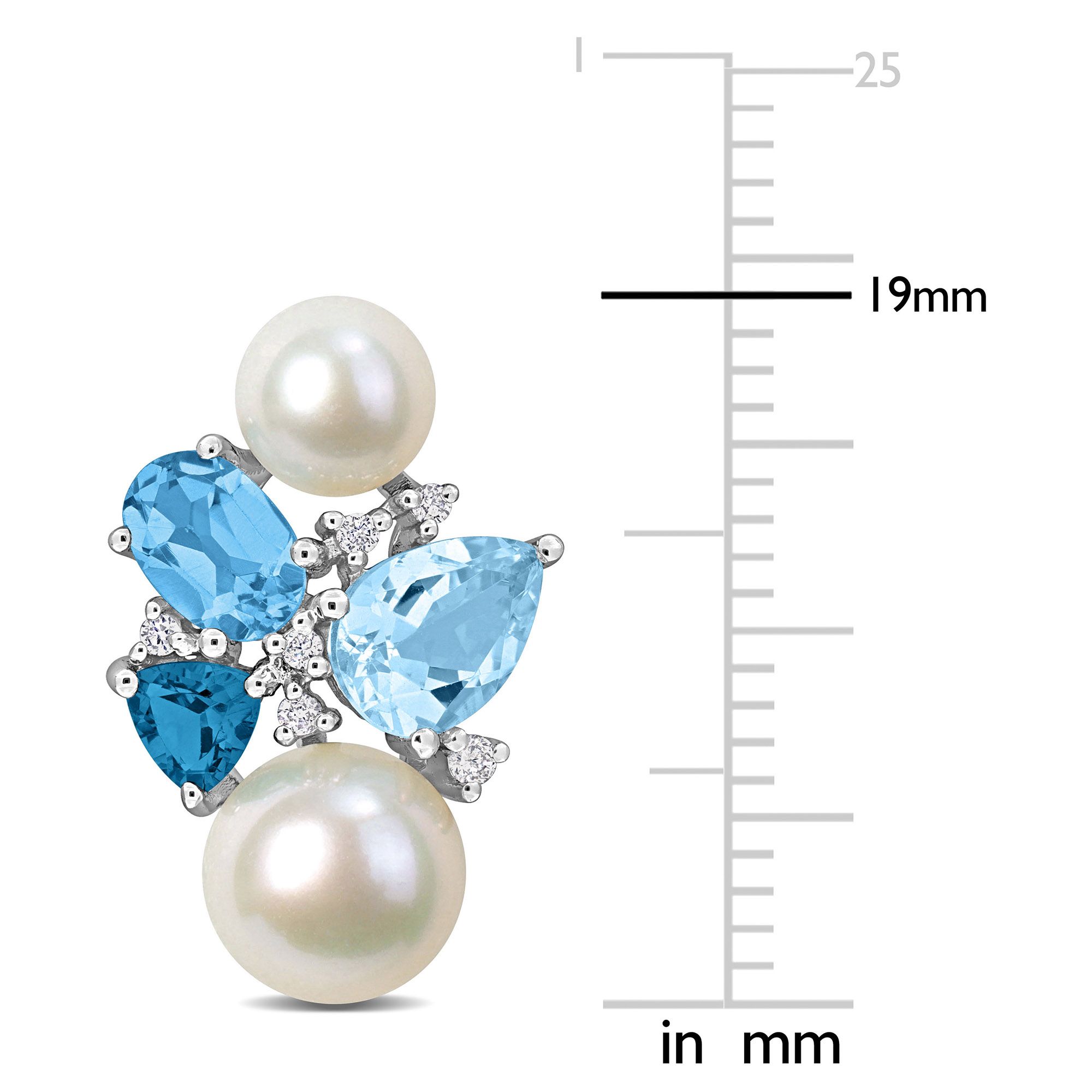 Cultured Freshwater Pearl Blue Topaz and Diamond Cluster Earrings in 14k White Gold