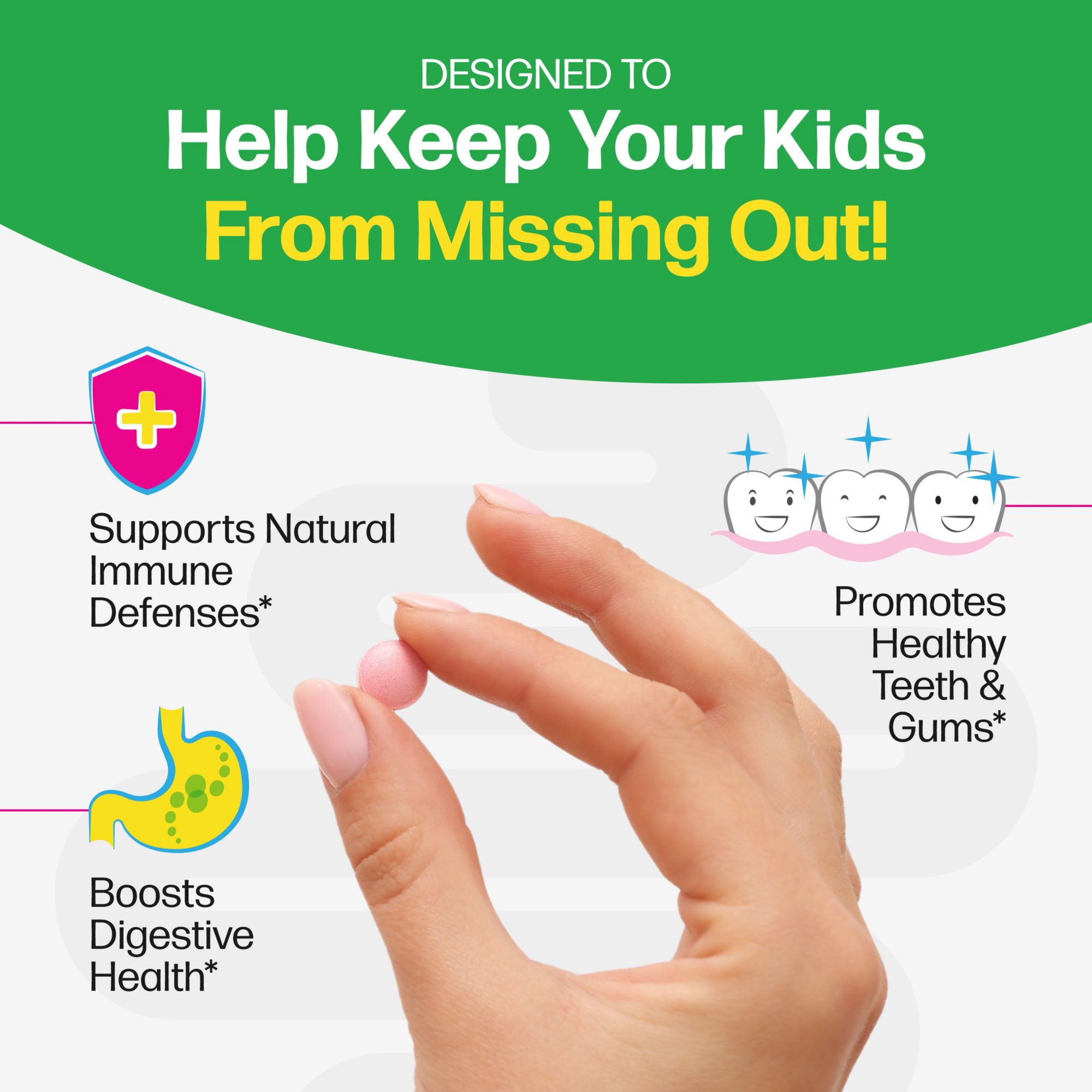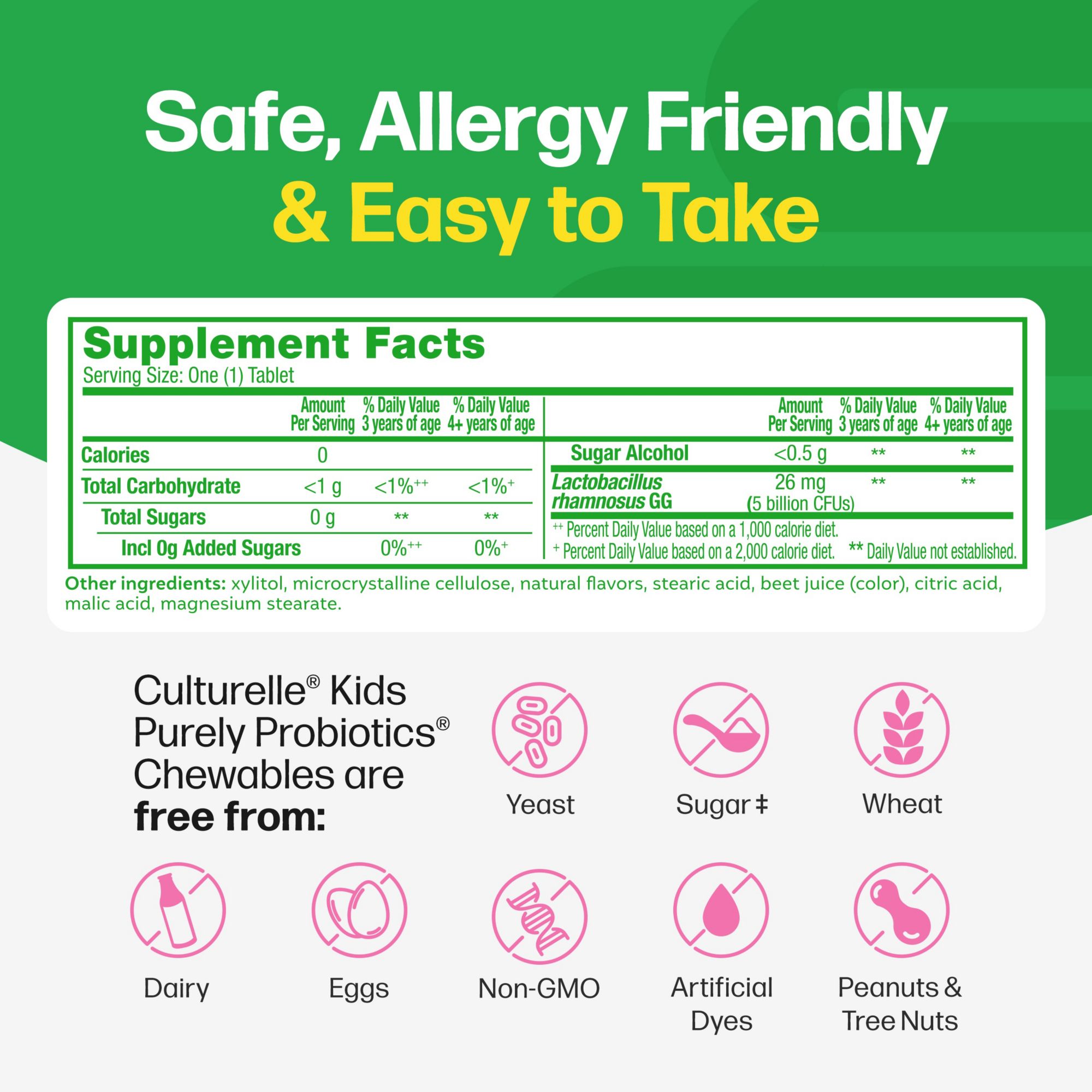 Contains 100% naturally-sourced Lactobacillus GG Helps restore the natural balance of good bacteria in your child's digestive tract* Helps support kids' immune systems* Contains none of the following: gluten, dairy, lactose, milk, synthetic colors, preservatives, yeast or soy Bursing berry flavor Sugar-free Great for kids 3 and up Includes 60 tablets* These statements have not been evaluated by the Food and Drug Administration. This product is not intended to diagnose, treat, cure, or prevent any disease.
