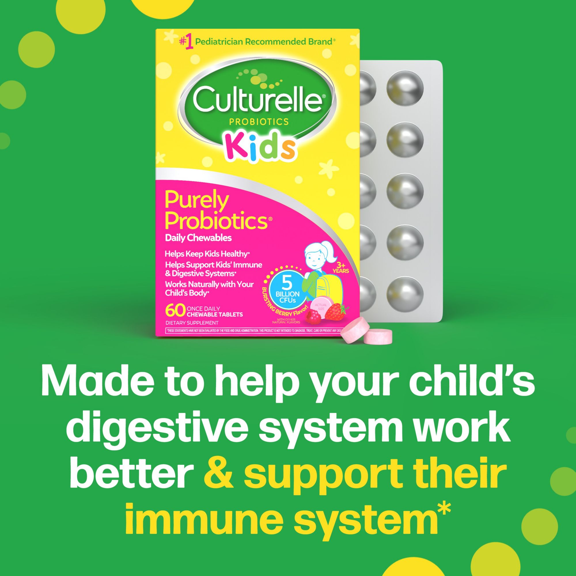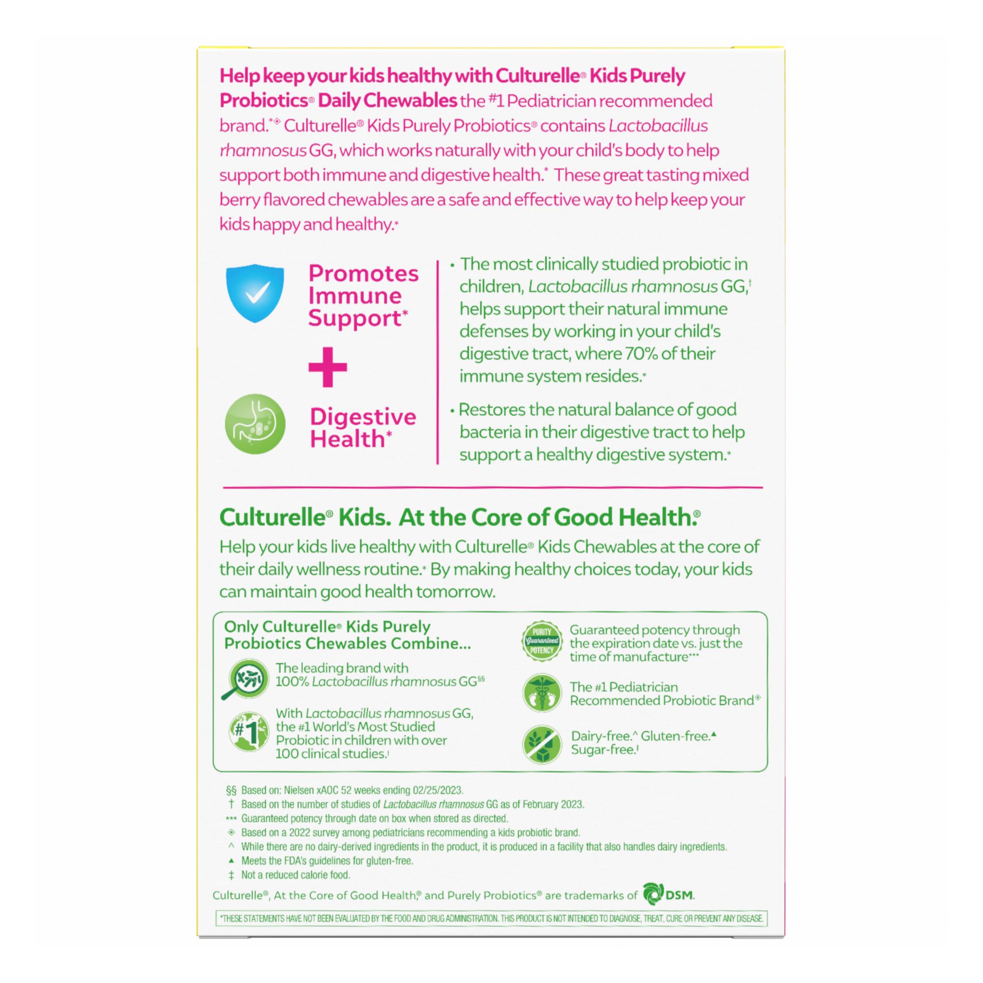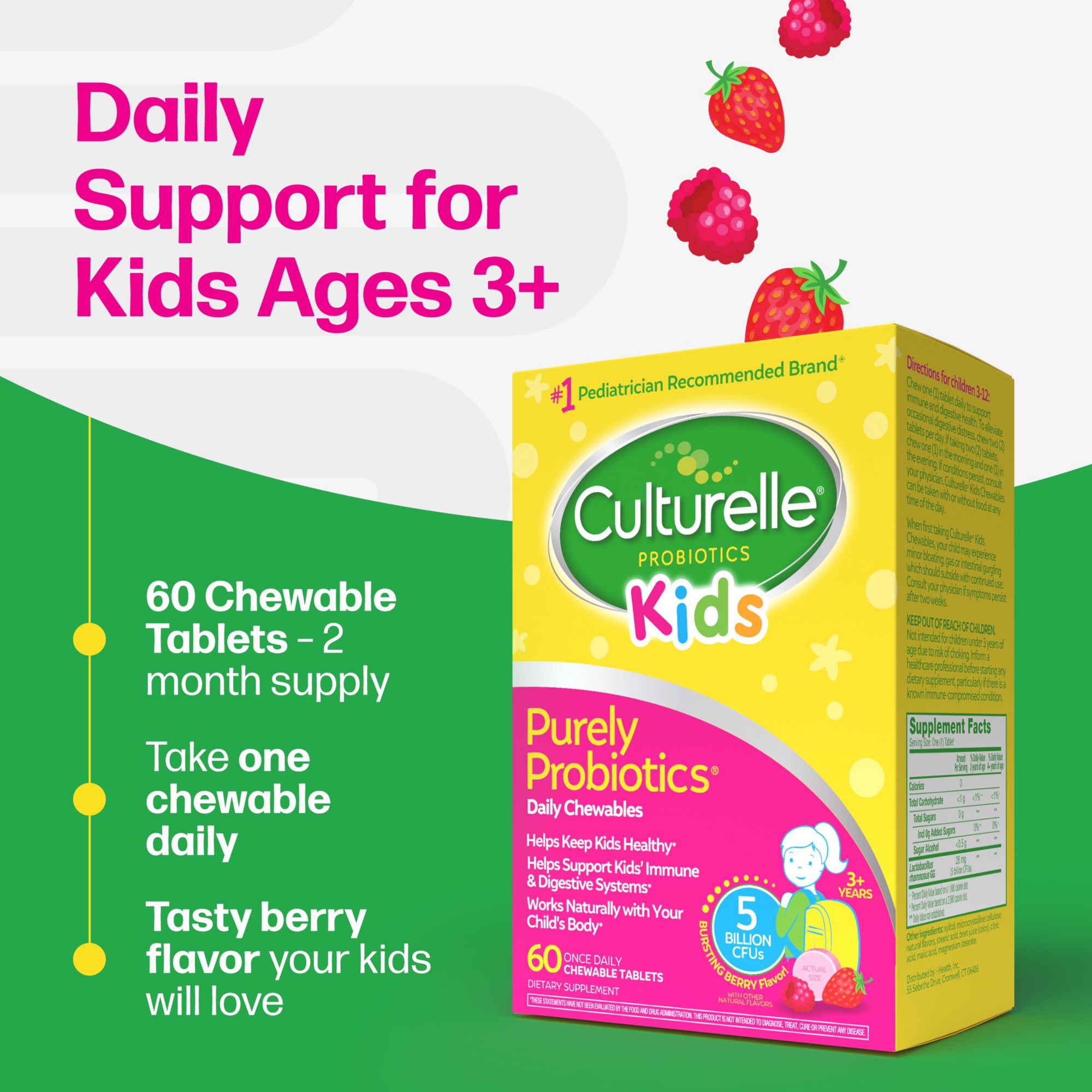 Help keep your kids healthy with Culturelle Kid Chewables. Culturelle Kids daily probiotic contains Lactobacillus GG, which works naturally with your child's body to help support both immune and digestive health.* These great tasting mixed berry flavored chewables are a safe and effective way to help keep your kids happy and healthy.*