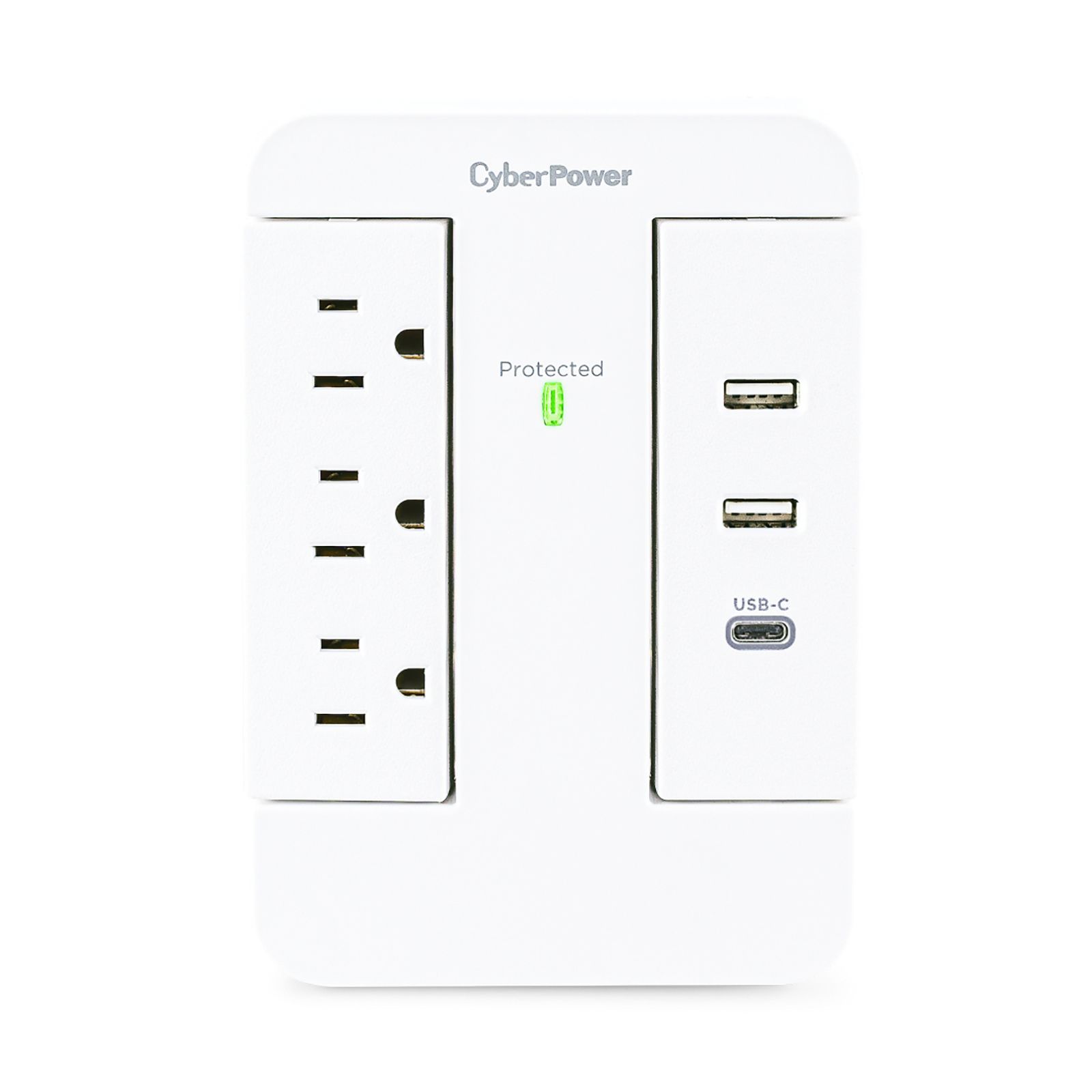 The Cyber Power three-pack safeguards common home and office devices by diverting excess voltage away from sensitive electronic equipment. Two surge-protected strips include five outlets, one USB-A (2.4-amp), and one USB-C port. The three-outlet wall tap provides one USB-A (3.6-amp shared) and one USB-C (15W) port. Perfect for charging multiple devices using AC power and USB charging.
