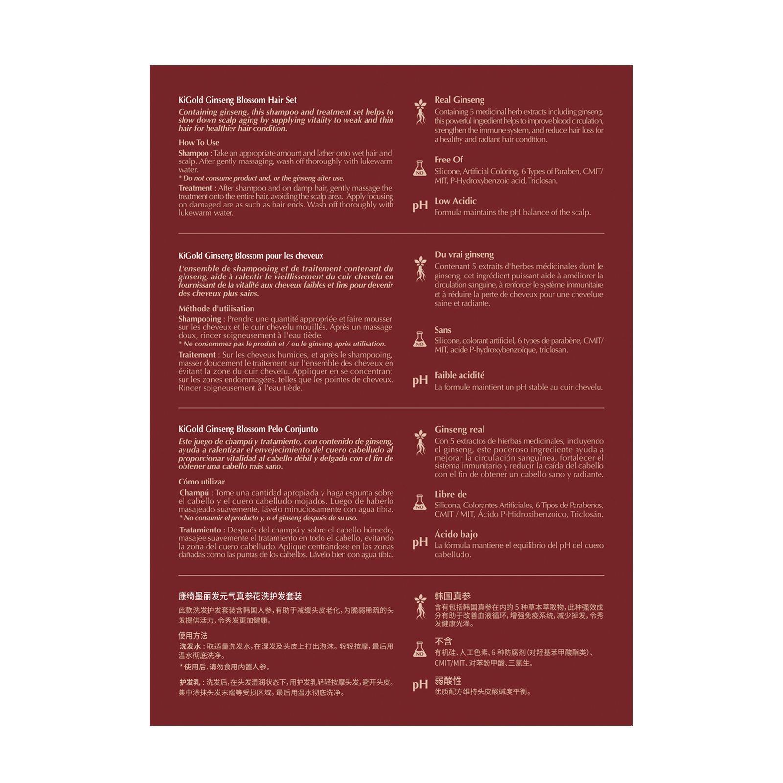 The real ginseng in KiGold Ginseng Blossom Shampoo & Conditioner is a Korean ginseng with a 1,500-year history. The ginseng is specially cultivated for higher potency effects. Enjoy the benefits of pure extracts of 11 active medicinal plants decocted with a high concentration of Korean Ginseng. The products contain a fresh, soft, herbal scent. KiGold Ginseng Blossom Shampoo & Conditioner moisturizes and nourishes the scalp, hair root and hair. It restores and maintains maximal moisture level, leaving the hair feeling smooth and fresh.
