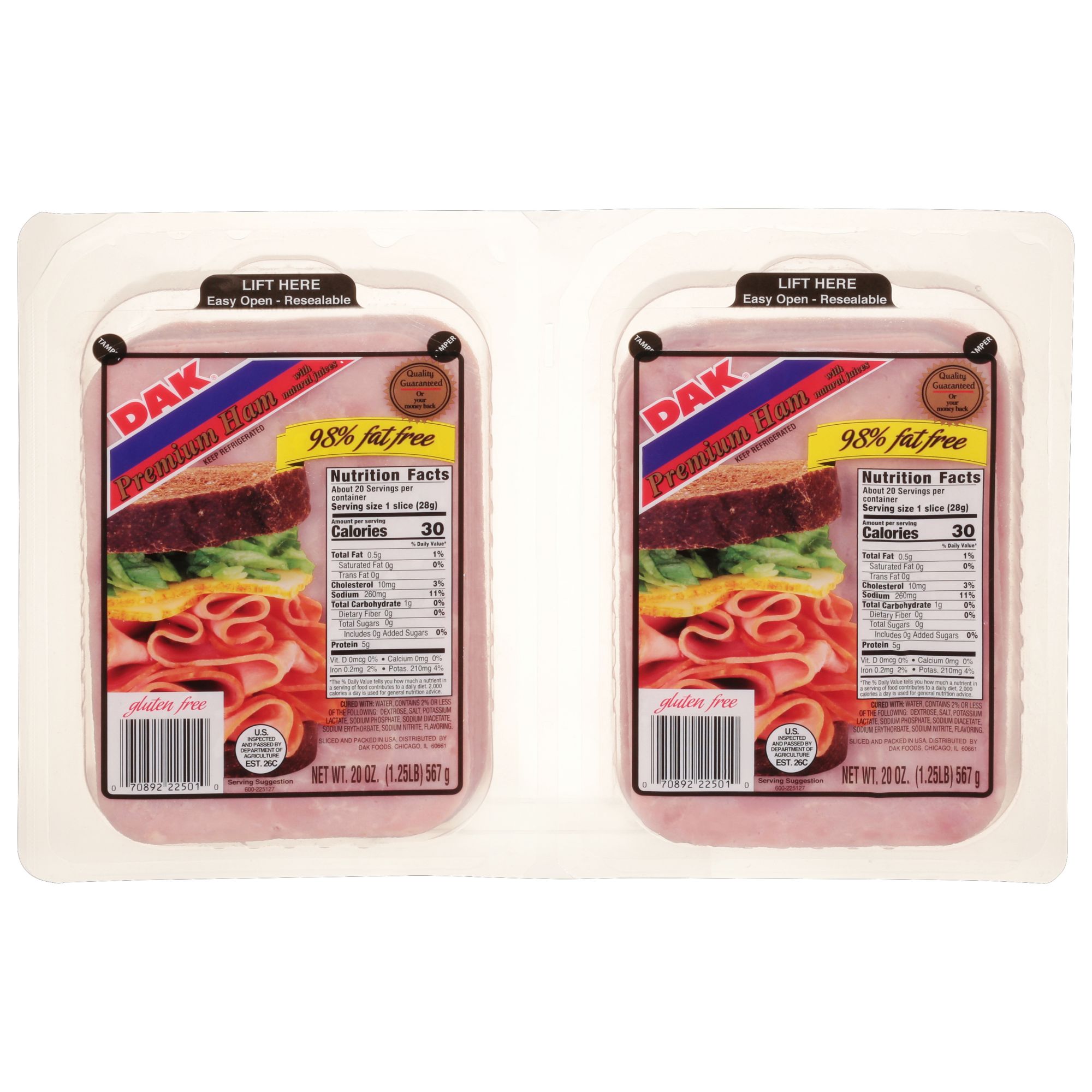 Enjoy high-quality cuts on every sandwich with DAK 20 Oz. 98% Fat-Free Premium Ham. Sliced in its natural juices, this ham packs delicious flavor into every bite and is 98% fat free.