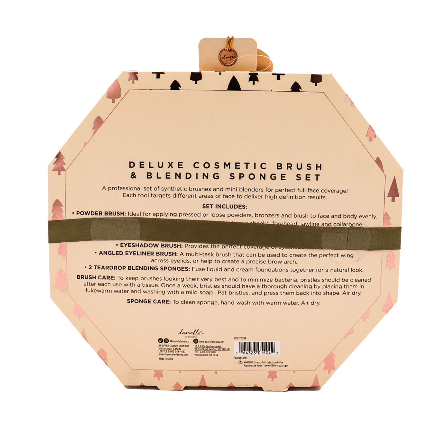 Set includes a Powder Brush, Blush Brush, Foundation Brush, Eyeshadow Brush, Angle Eyeliner Brush and two Teardrop Blending Sponges