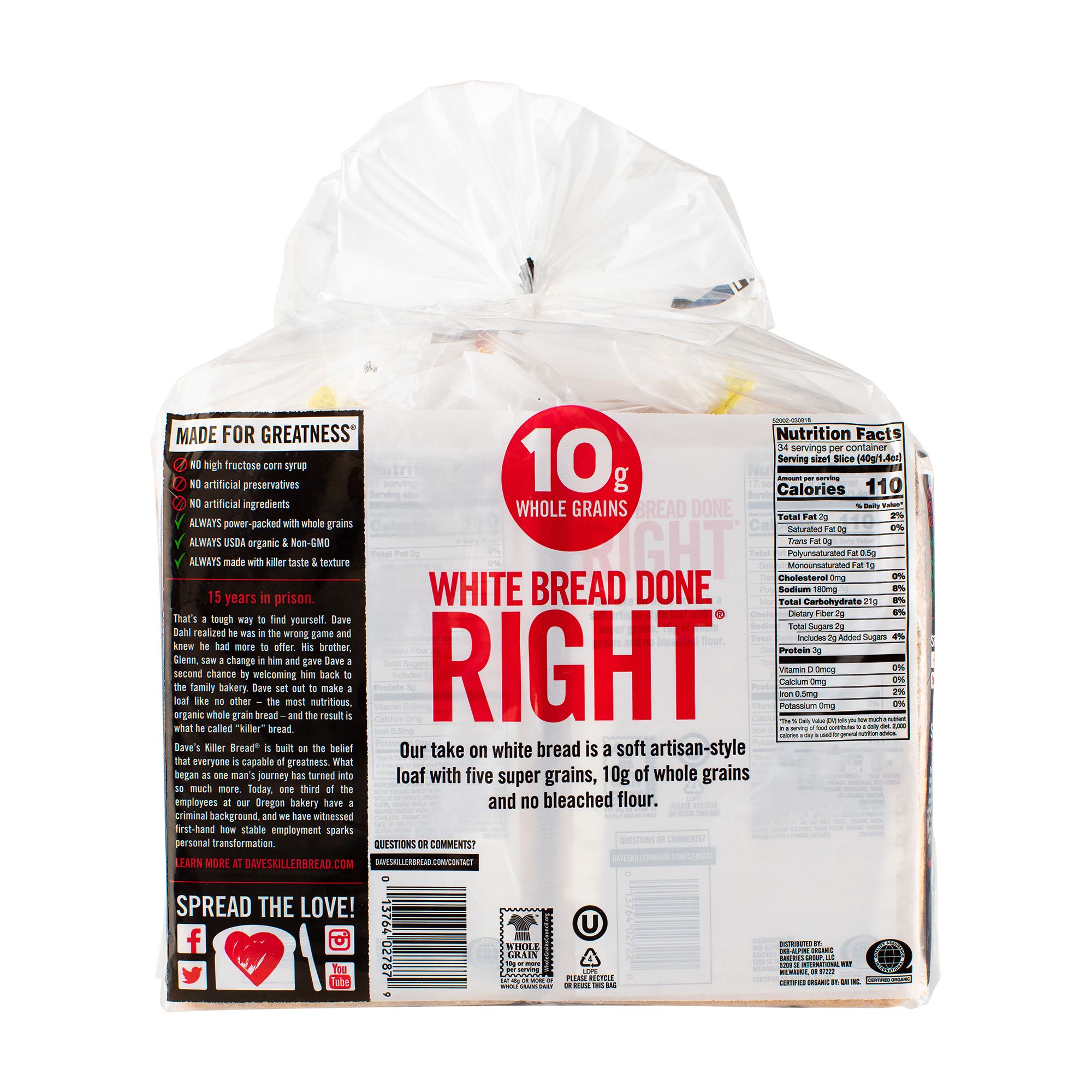 Dave's Killer Bread White Bread Done Right is USDA certified organic, and Non-GMO product verified. There are 3 grams of protein in each serving, no high fructose corn syrup, no artificial preservatives, and no artificial ingredients. Dave's Killer Bread believes that everyone is capable of greatness. Every Dave's product is hearty, flavorful, full of protein and whole grains. You never have to sacrifice killer taste for power packed organic nutrition. Dave's proudly challenges societal norms by championing second chance employment of people with criminal backgrounds, and educates other companies on the value of intentionally employing this part of our population. Dave's goal is to reach the right consumer, at the right time, in the right place, with the right message.