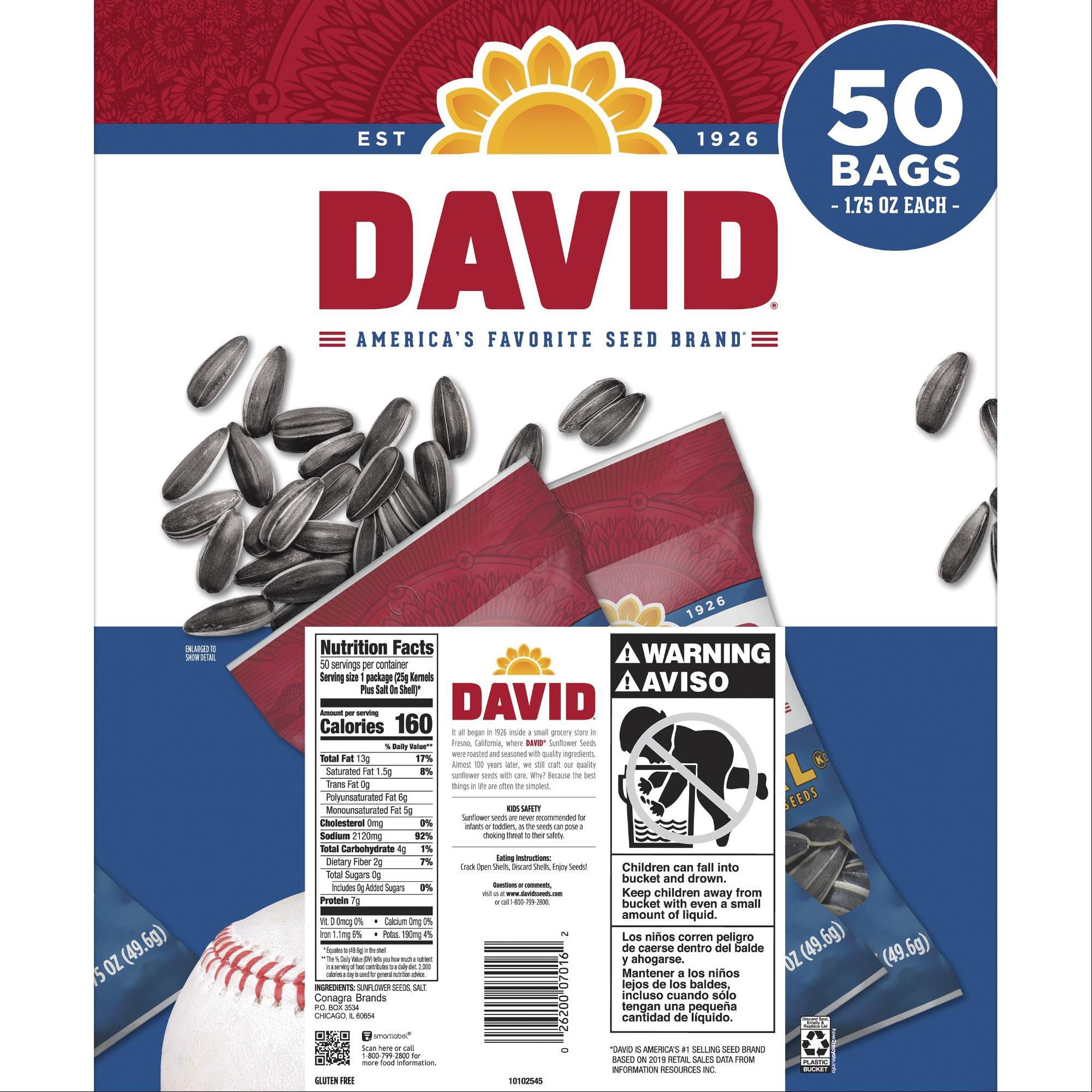 Whether you’re needing a boost of energy or you want to add some flavor to your meal, enjoy the delightful and satisfying crunch of David Seeds Original Sunflower Seeds. They’re easy to eat and fun to share. Packed with nutritious unsaturated fats, fiber, and protein in up to 6 grams per ounce, they’ll keep your energy up and your hunger satisfied. With a robust and salty flavor, it’s a classic snack you’ll always want to crunch on.