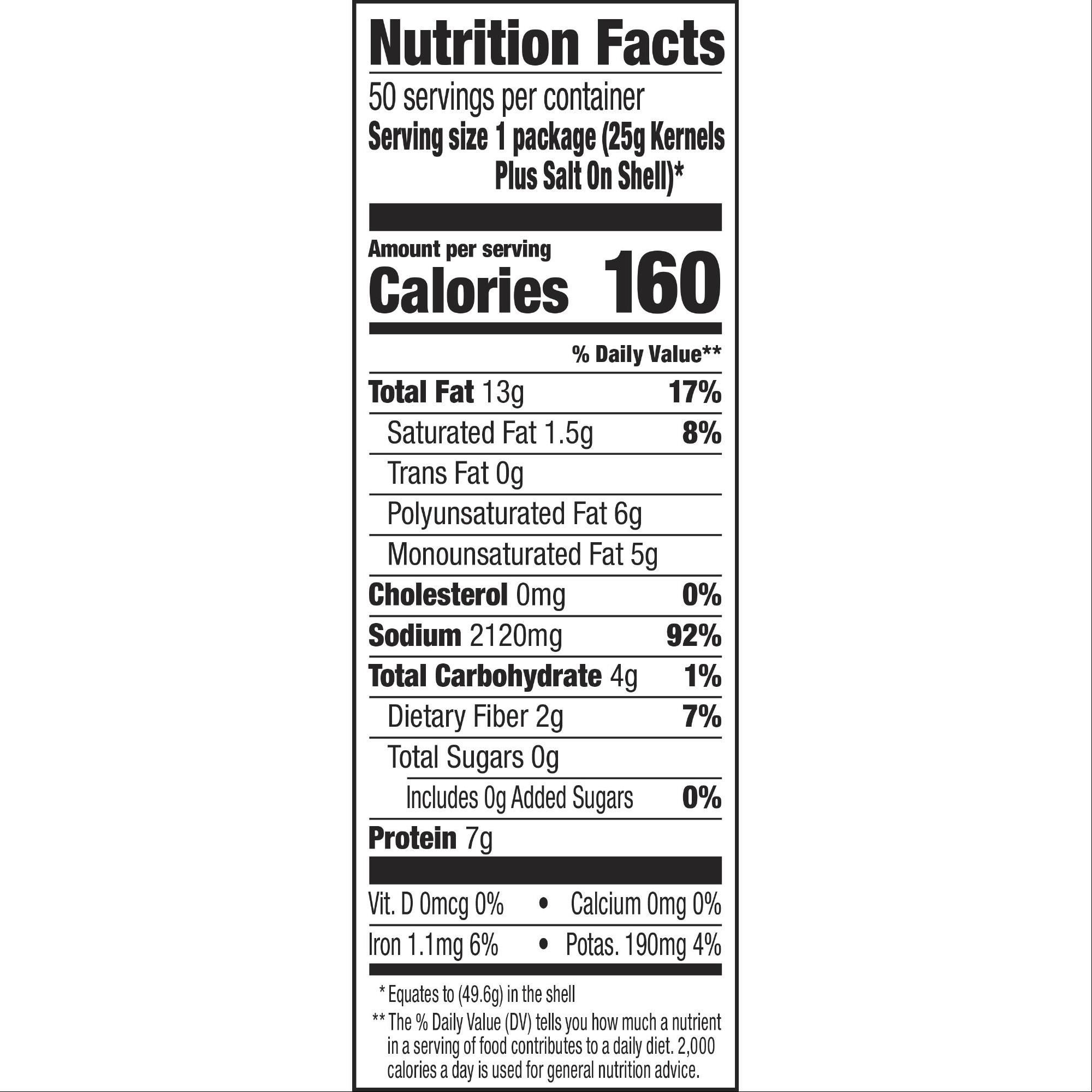 Contains (50) 1.75 oz. bags for easy, on-the-go snack time All-natural ingredients and nutrients with vitamins and minerals for a healthier alternative snack Packed with nutritious unsaturated fats, fiber, and protein Great source of fiber and vitamin E Original lightly salted, robust shell for a satisfying crunch and taste
