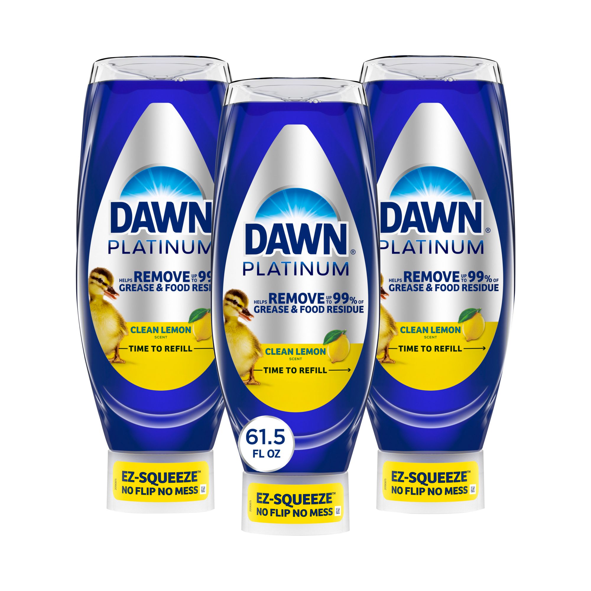 Dawn Platinum gives you a squeaky clean you can see and feel, and helps remove up to 99% of Grease and Food Residue With Dawn EZ-Squeeze it's easier to get the amount you want, where you want it Don't waste a drop of soap with the upside-down EZ-Squeeze bottle The only brand trusted by rescue workers to save wildlife Save money & reduce waste by refilling your EZ-Squeeze bottle from a large bottle of Dawn Dawn dishwashing liquid can be used to clean items beyond the kitchen sink Use Dawn Platinum to pre-treat laundry stains, to clean greasy tools and car wheels, and to remove grease and grime from around the house Dawn Ultra's powerful formula helps you get through more dishes with less* dishwashing liquid (*vs. Dawn Non-Concentrated) Includes Dawn Platinum EZ-Squeeze Dish Soap Dishwashing Liquid with Grease Removal - Clean Lemon, 3 ct./20.5 oz. each