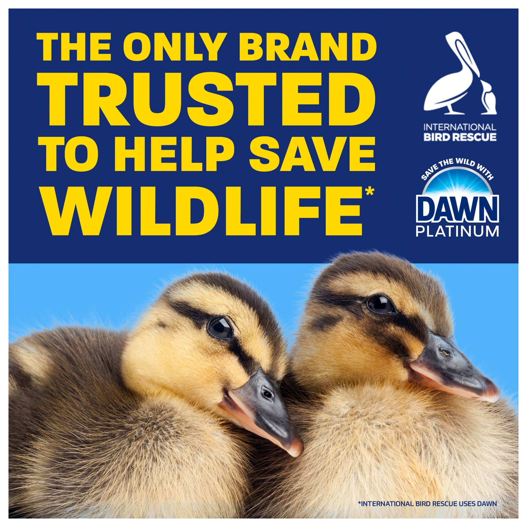 Dawn Platinum gives you a squeaky clean that you can see and feel. Dawn Platinum's improved formula easily removes 99% of grease and food residue. Dawn helps save wildlife. For more than 40 years, Dawn has helped save wildlife both at the sink, with products designed to get dishes cleaner faster, using less water*, and at the shore, where we work with wildlife rescue experts to protect and care for aquatic wildlife (*vs. running the tap with Dawn Non-Concentrated). Dawn is the only brand of dish soap trusted by rescue workers to clean wildlife impacted by oil spills. Dawn dishwashing liquid can even be used to clean items beyond the kitchen sink. Use Dawn Platinum dish soap to pre-treat greasy laundry stains, remove grease and grime from kitchen counters and appliances, and to clean external car surfaces and the outer shroud of a gas grill. Dawn Ultra's powerful formula helps you get through more dishes with less* dishwashing liquid (*vs. Dawn Non-Concentrated). Made with Biodegradable surfactants.