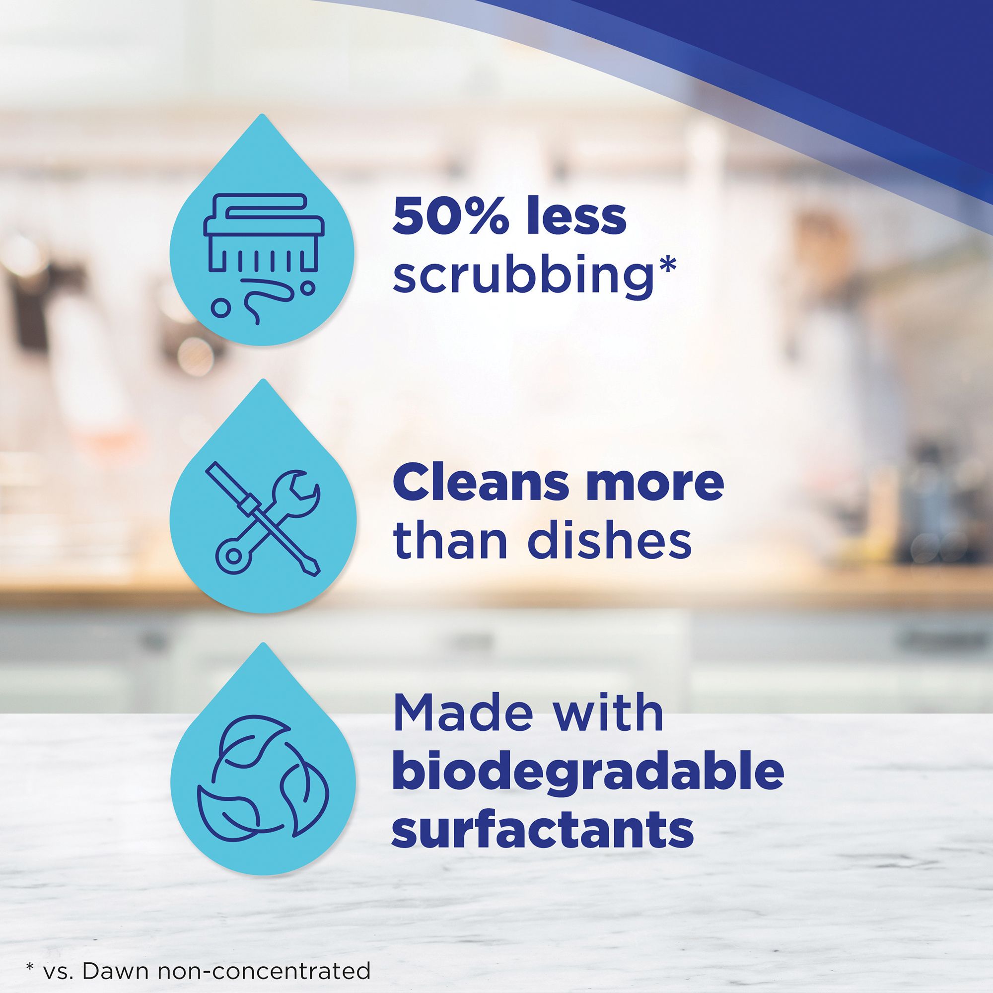 Dawn Ultra's powerful formula helps you get through more dishes with less dishwashing liquid vs. Dawn Non-Concentrated