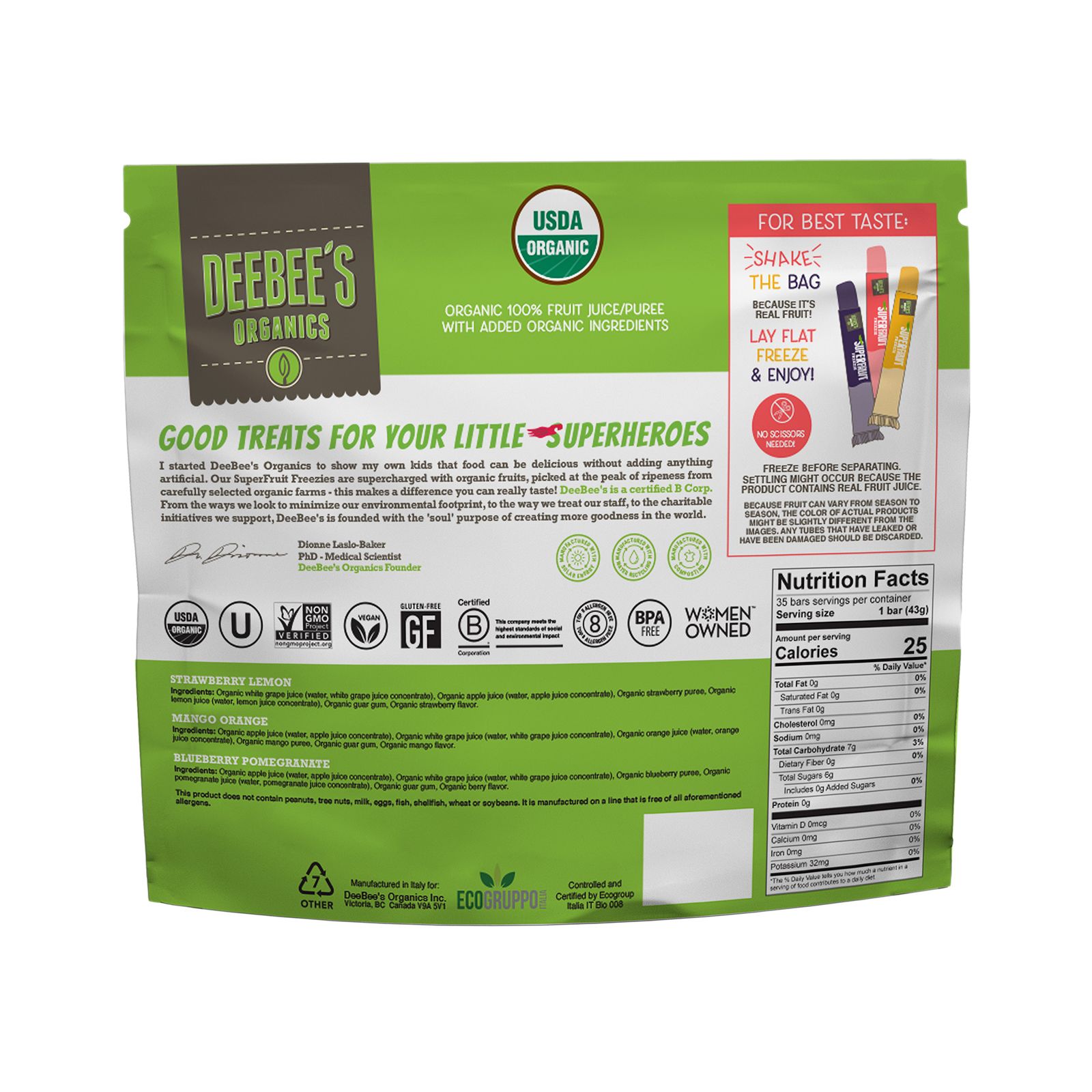 DeeBee's Organics SuperFruit Freezies are a delicious, clean-label nostalgic treat the whole family can enjoy! Our freezies are made with all natural ingredients, nothing artificial, gluten, soy, wheat & dairy free, Non-GMO & contain all organic fruit juice and fruit puree! They make delicious, clean-label takes on your favorite nostalgic treats. Their mission is to help make ‘conscious’ snacking really fun. Joyful treats without compromise – treats they feel great about sharing with their own families, and tha they hope to honor how much you care about yours.