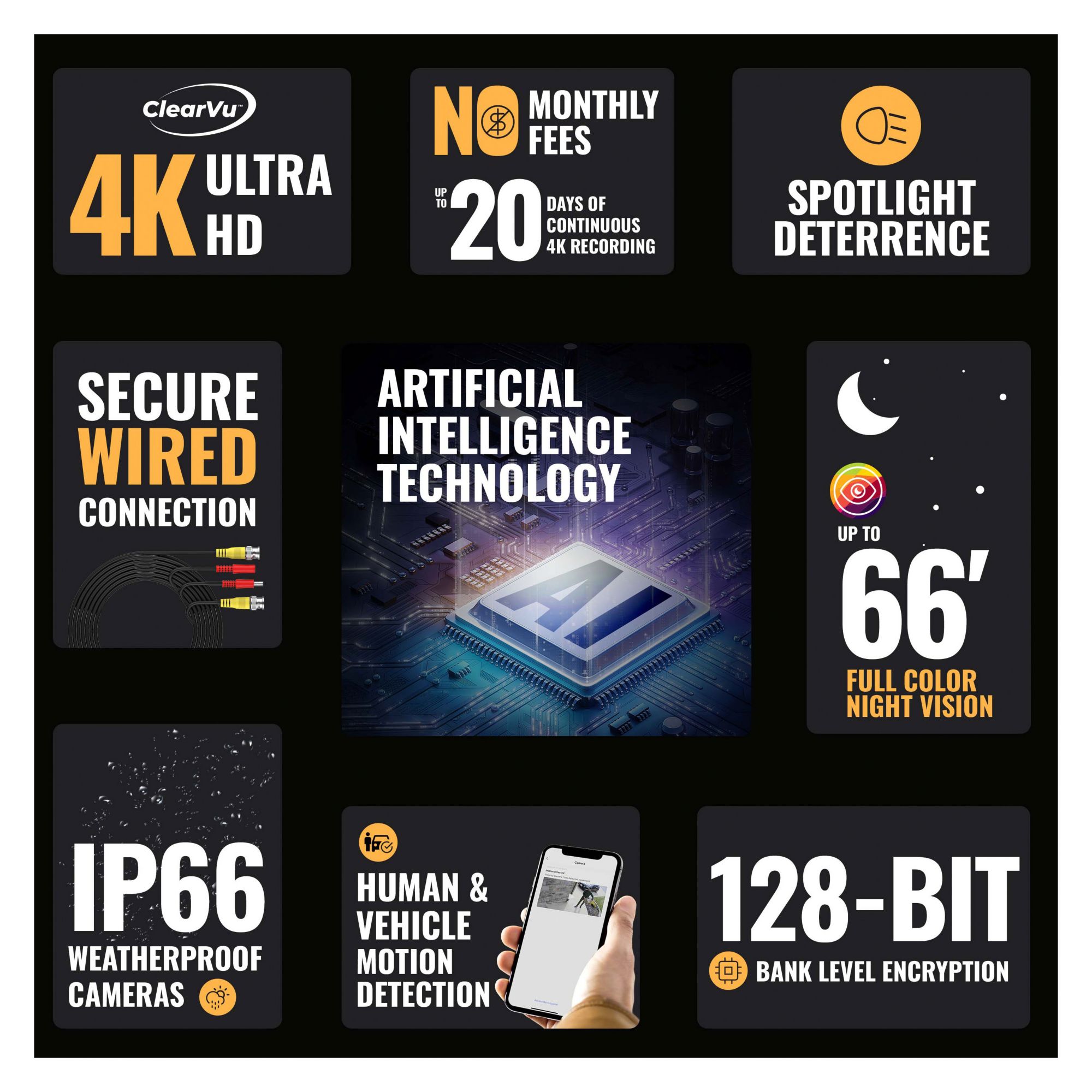 - ClearVu Brilliant 4k Resolution: Four-times the resolution of standard 1080P. Deep color and sharp visuals ensure that you are getting an accurate read on fine details like faces or license plates