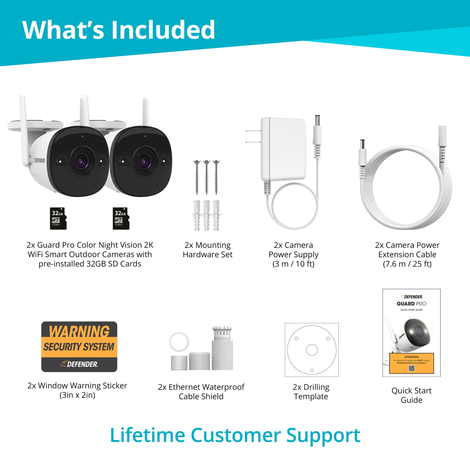 Includes two Guard Pro color night vision 2K Wi-Fi smart outdoor camera with pre-installed 32GB SD card, two mounting hardware sets, two camera power supplies (10'), two extension cables (25'), two window warning stickers (3" x 2"), two Ethernet waterproof cable shields, one quick start guide, and one lifetime live chat support Warranty: 1 year