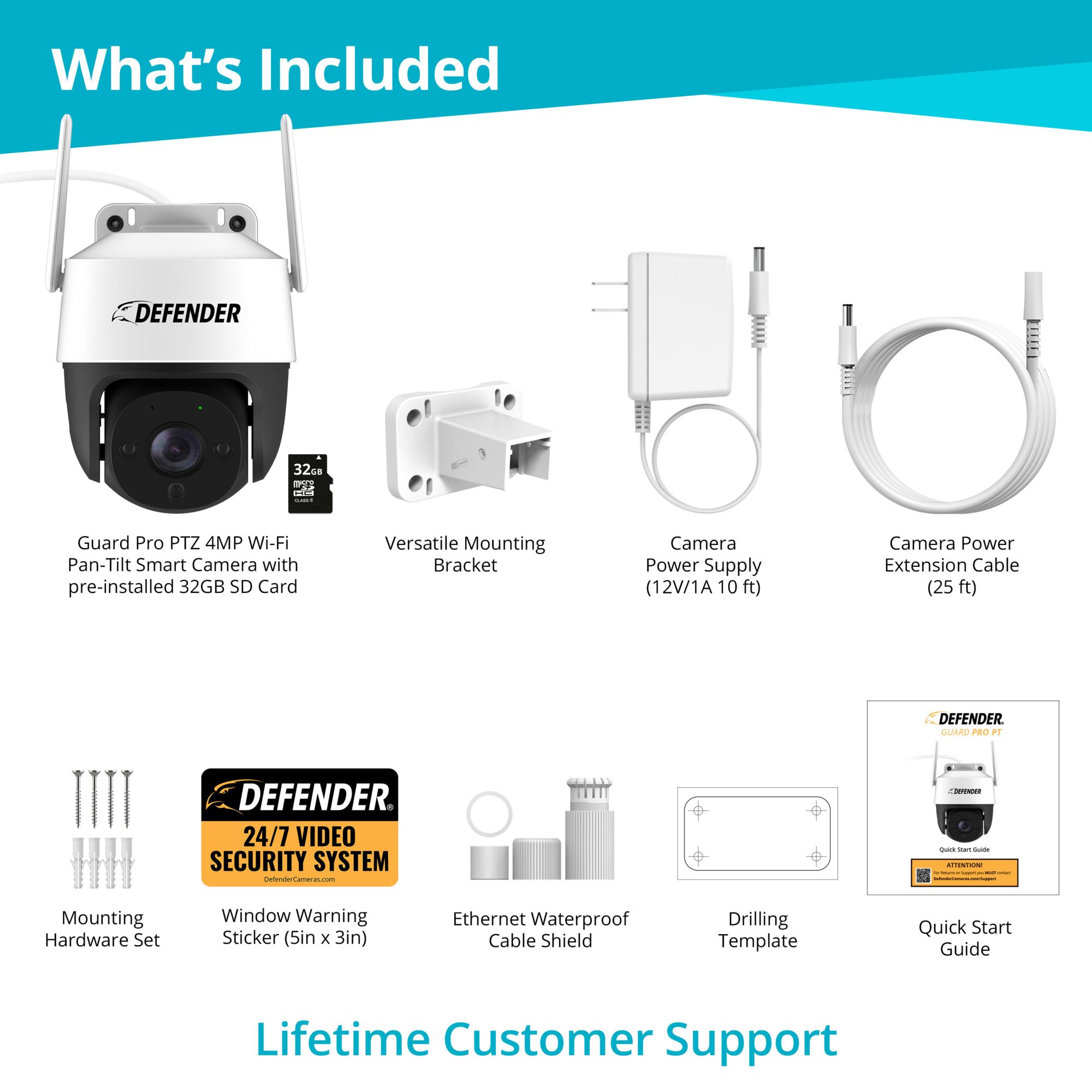 Includes Defender Guard Pro PTZ color night vision 4 MP Wi-Fi pan-tilt smart camera with pre-installed 32GB SD card, mounting hardware set, versatile mounting bracket, camera power supply (12V/1A 10'), extension cable (25'), window warning sticker (5” x 3”), ethernet waterproof cable shield, drilling template, quick start guide, warranty registrations insert, and lifetime live chat support