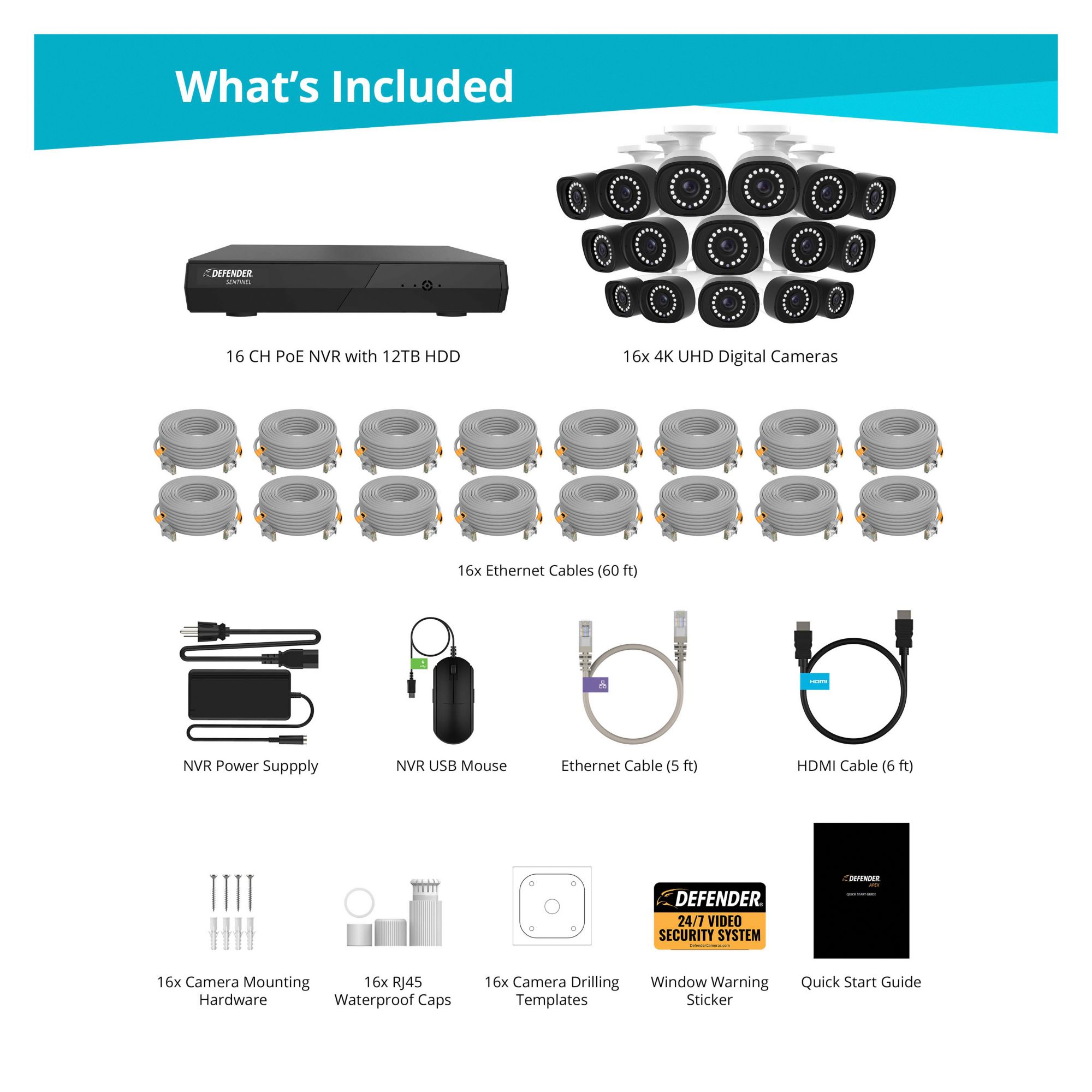 Includes NVR with 12TB HDD, (16) 4K ultra HD POE IP cameras, (16) 60' ethernet cables, HDMI cable, 6.5' ethernet cable, power supply, USB mouse, camera mounting hardware, 16 RJ45 waterproof caps, quick start guide, window warning sticker, 16 templates