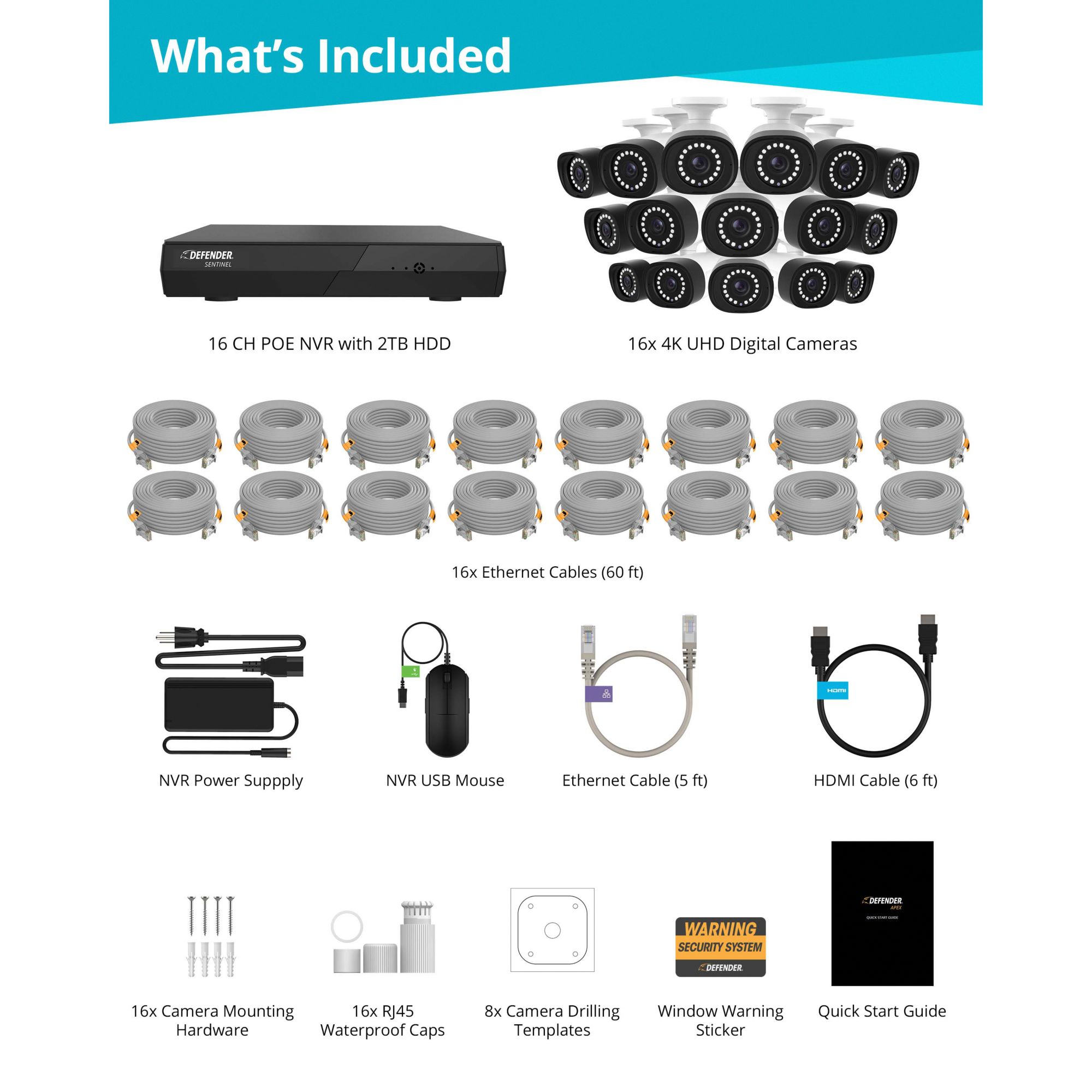 Includes NVR with 2TB HDD, (16) 4K ultra-HD POE IP cameras, (16) 60' ethernet cables, HDMI cable, 6.5' ethernet cable, NVR power supply, USB Mouse, 16 camera mounting hardwares, 16 RJ45 waterproof caps, quick start guide, window warning sticker, 16 drilling templates and lifetime chat customer support