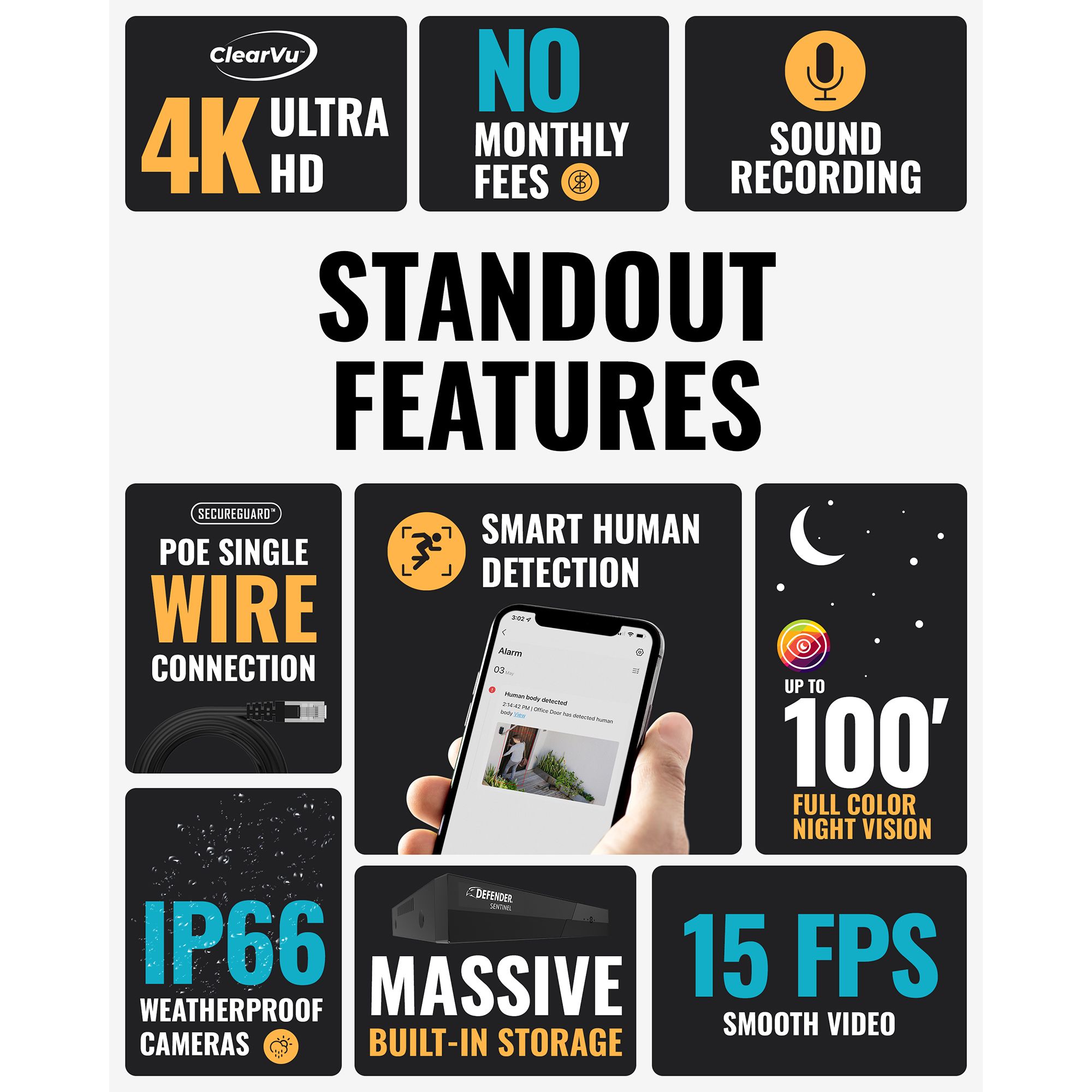 Protect what you value most with the clarity of 4K and the reliability of a power over ethernet (POE)-wired connection. The Sentinel 4K NVR security system offers the power of professional-grade security with a simple DIY setup. Keep your home or business safe, without professional installation costs and monthly service fees. Featuring advanced smart human detection, vivid color night vision, bank-level encryption and a premium viewing app, Sentinel offers robust protection for your property.