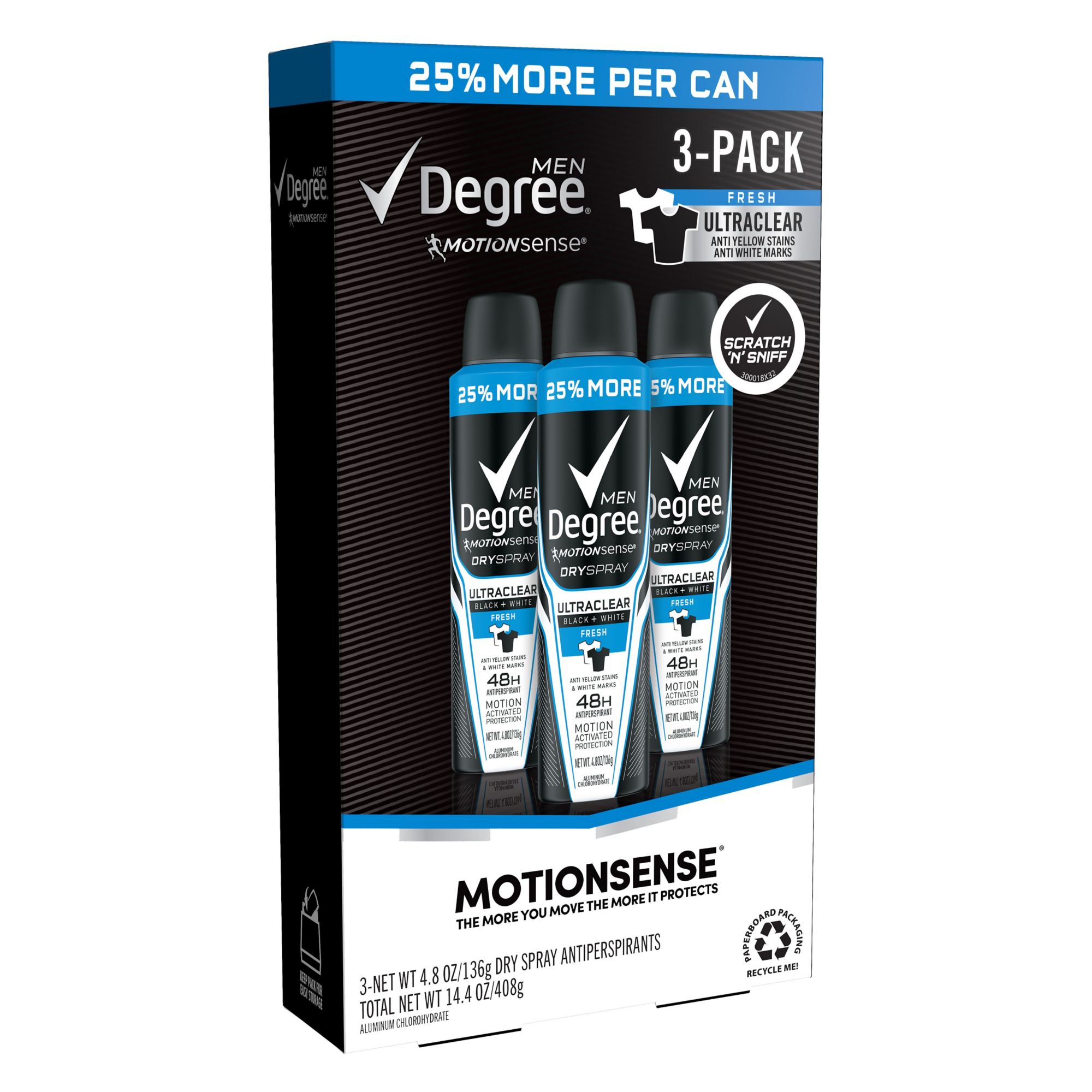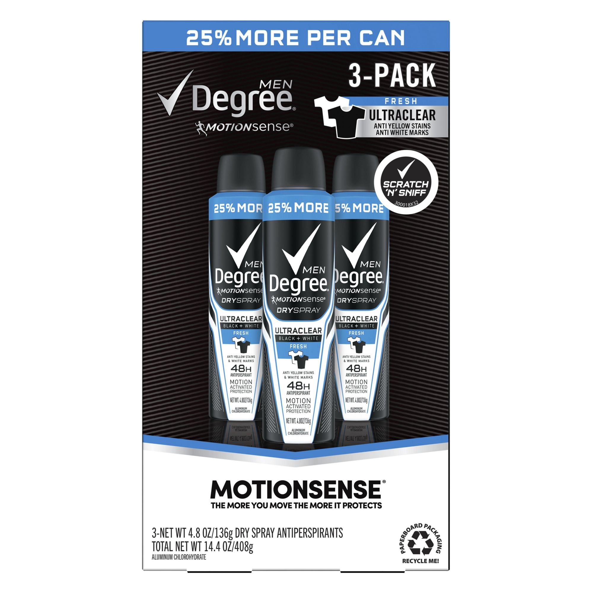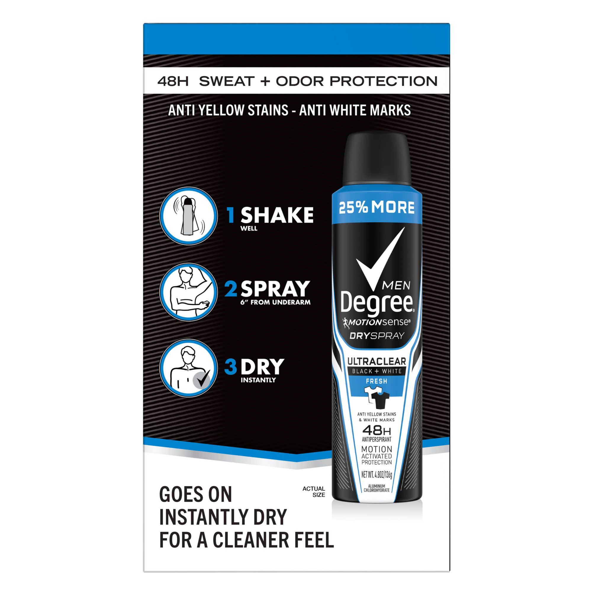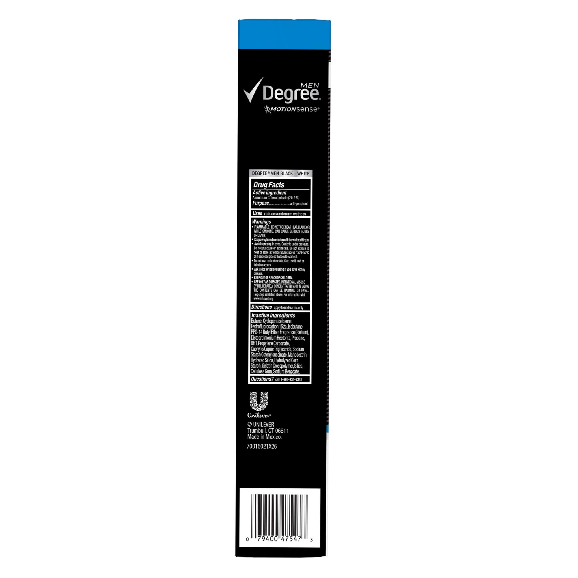 Degree Men MotionSense Antiperspirant Deodorant Dry Spray Black + White Fresh with long lasting motionsense technology goes on instantly dry for a cleaner feel and is specially designed to keep your clothes looking new. No white marks on black clothes and no yellow stains on white clothes. You'll look great all day. Degree Men Antiperspirant Deodorant Dry Spray Black + White Fresh has a formula that cuts down on the stains that some antiperspirants leave behind when they mix sweat and natural oils produced by your body, it will keep you free from body odor and sweat for those moments when life demands more from you. Its 48-hour protection goes on instantly dry, keeps you moving, and helps you stay confident and free to live life to its fullest. It also contains Degree's innovative MotionSense technology. It works like this: unique microcapsules sit on the surface of your skin. When you move, friction breaks those microcapsules and they release more fragrance. So every time you move, MotionSense keeps you fresh and free from odor. Degree Men Antiperspirant Deodorant Dry Spray Black + White Fresh is formulated to give you all the protection you'll need. So you can wear your best clothes, move with freedom, and feel fresh and confident. Degree Men Antiperspirant Deodorant Dry Spray Black + White Fresh. The best protection ever against white marks and yellow stains. Degree. It won't let you down.