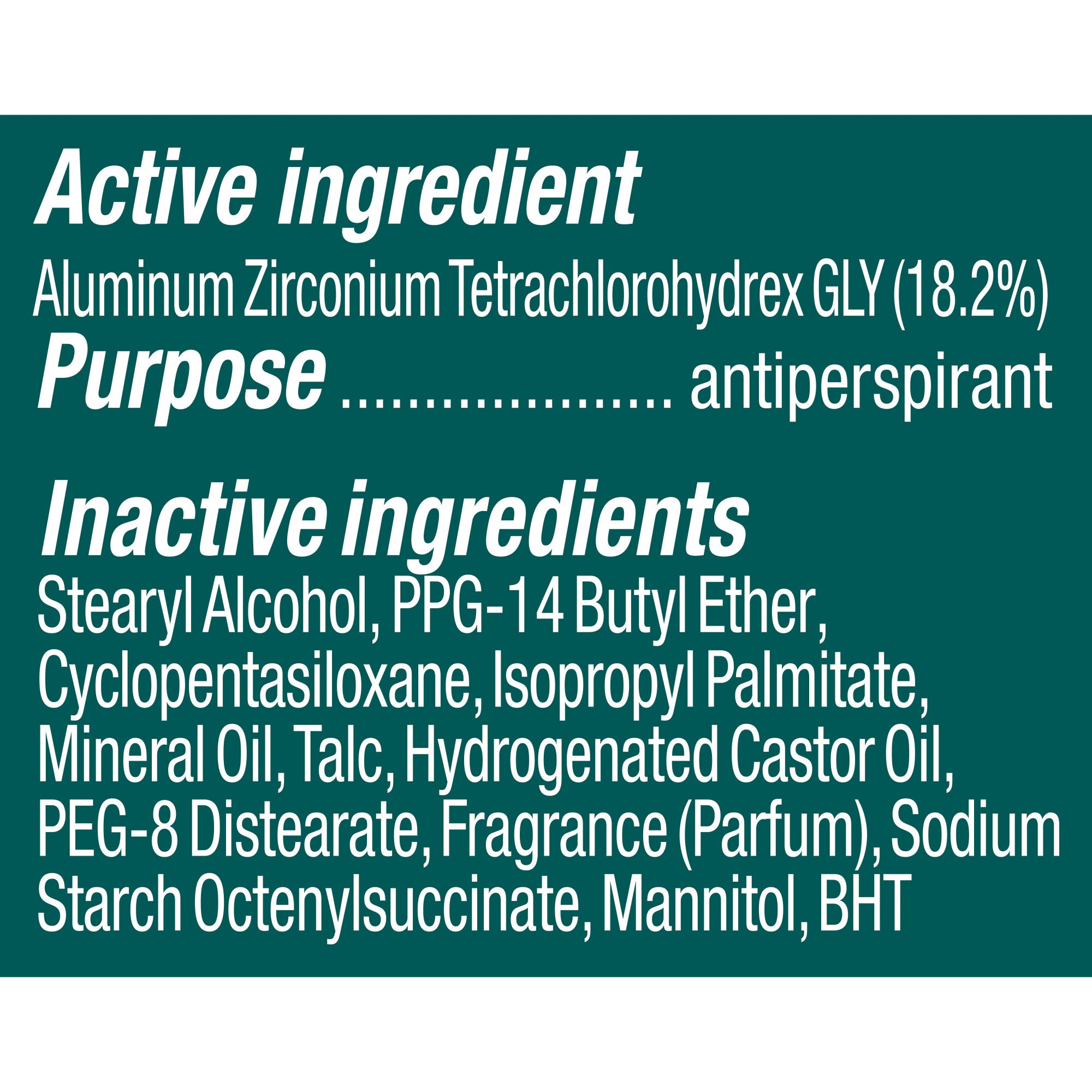 Active Ingredients: 18.2% Aluminum Zirconium Tetrachlorohydrex GLY (Antiperspirant).