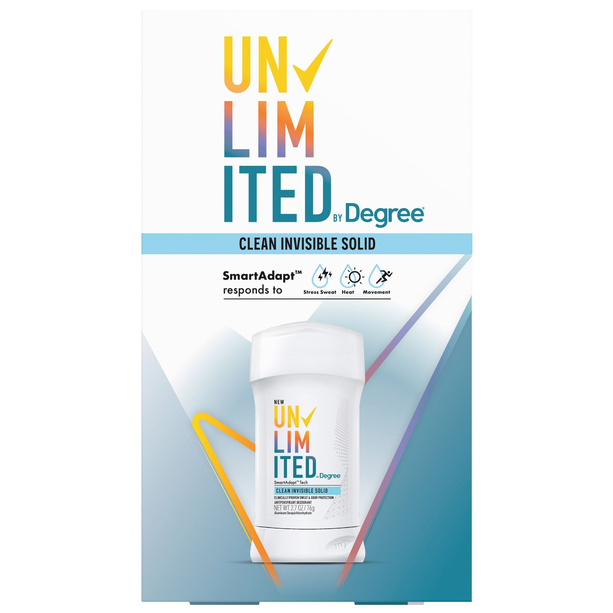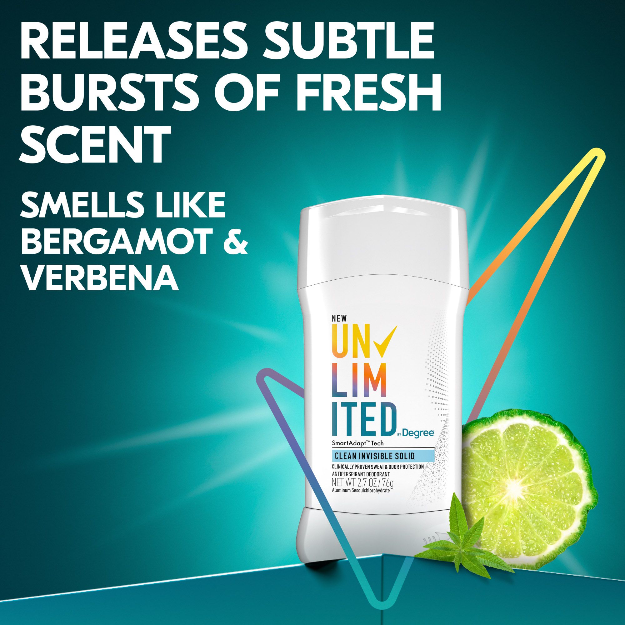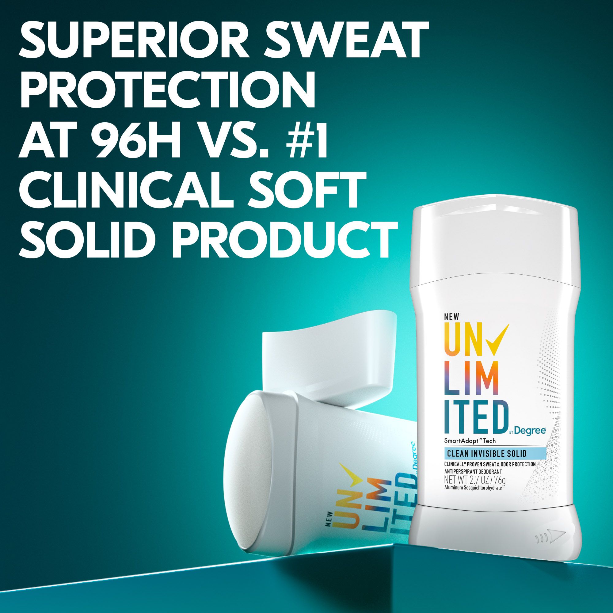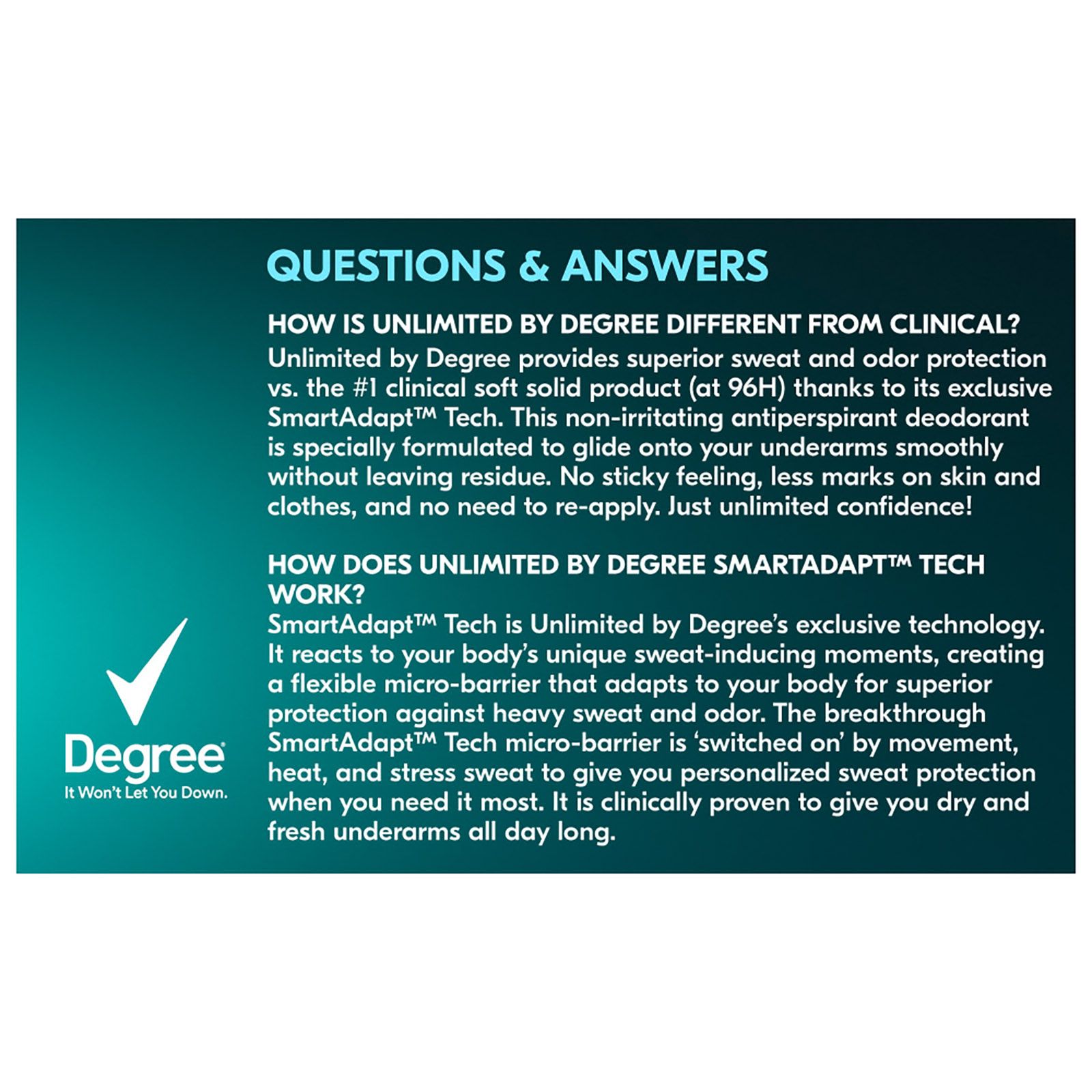 Save up to 25% vs non-club retail price with this value pack of three new Degree Unlimited Clean Invisible Solid with SmartAdapt Technology, for 96 hours of clinically proven protection without irritation or residue. This antiperspirant deodorant provides superior sweat and odor protection versus the #1 clinical soft solid with no sticky feeling, less marks on skin and clothes, and no need to re-apply. Just unlimited confidence! SmartAdapt Tech is Unlimited by Degree's exclusive technology. It reacts to your body's unique sweat-inducing moments, creating a flexible micro-barrier that adapts to your body for superior protection against heavy sweat and odor. The breakthrough body-responsive SmartAdapt Tech is "switched on" by movement, heat, and stress to give you personalized sweat protection when you need it most while providing subtle fresh scent bursts of Bergamont and Verbena. Thanks to SmartAdapt Tech, Unlimited by Degree is clinically proven to provide superior sweat and odor protection vs the #1 clinical soft solid product (at 96 hours) for dry and fresh underarms all day long. Degree wants to inspire the confidence in everyone to move more and go further. They’re here to support your journey through an antiperspirant that moves with you and helps you to live without limits. As well as increasing their use of reusable materials, they’re making it easier for you to recycle their antiperspirant deodorant stick and dry spray packaging.