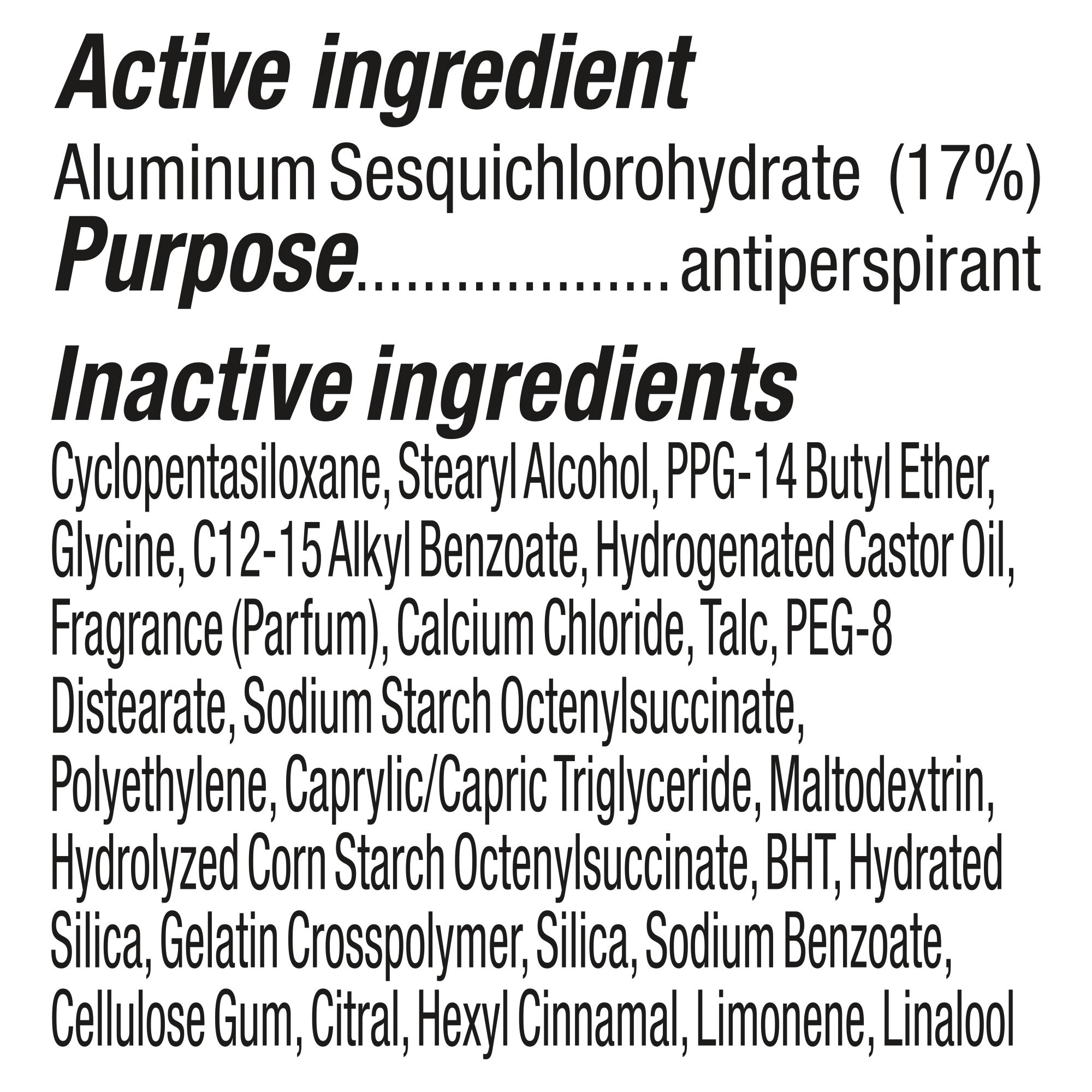 Active Ingredients: 17% Aluminum Sesquichlorohydrate (Antiperspirant).