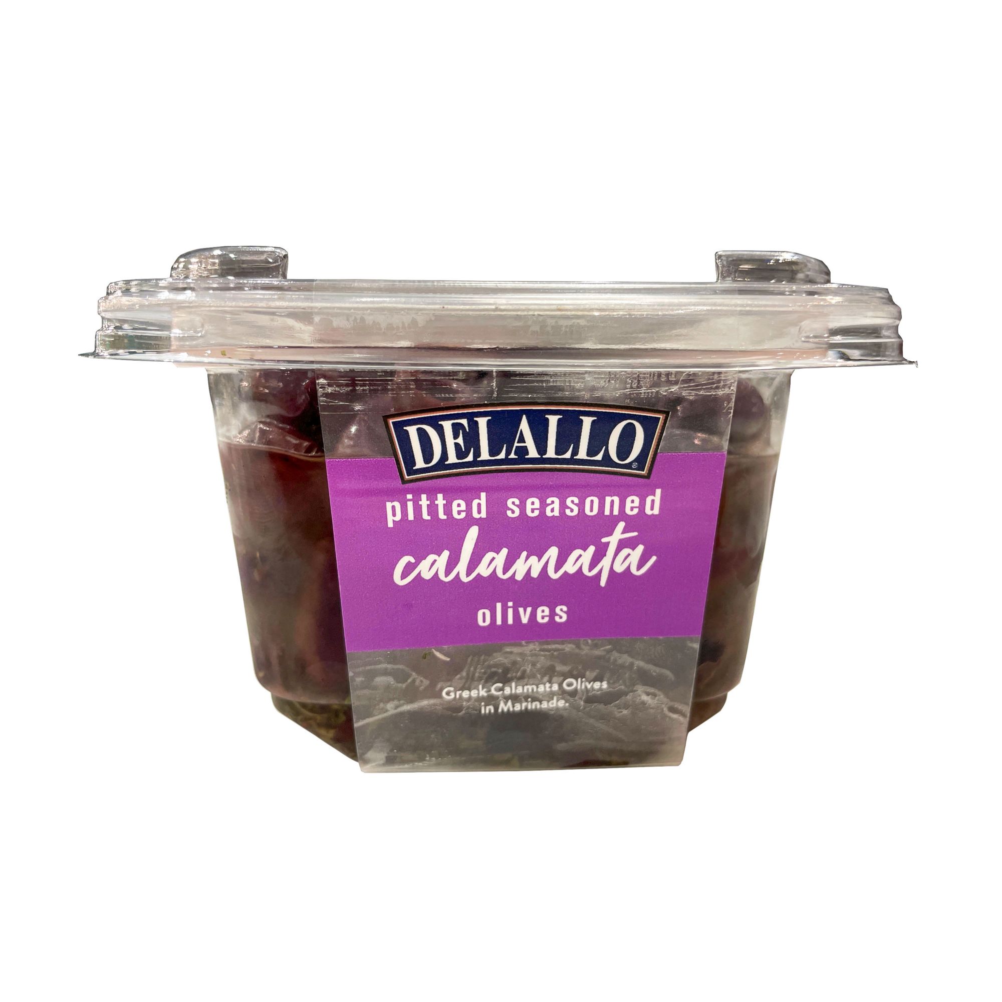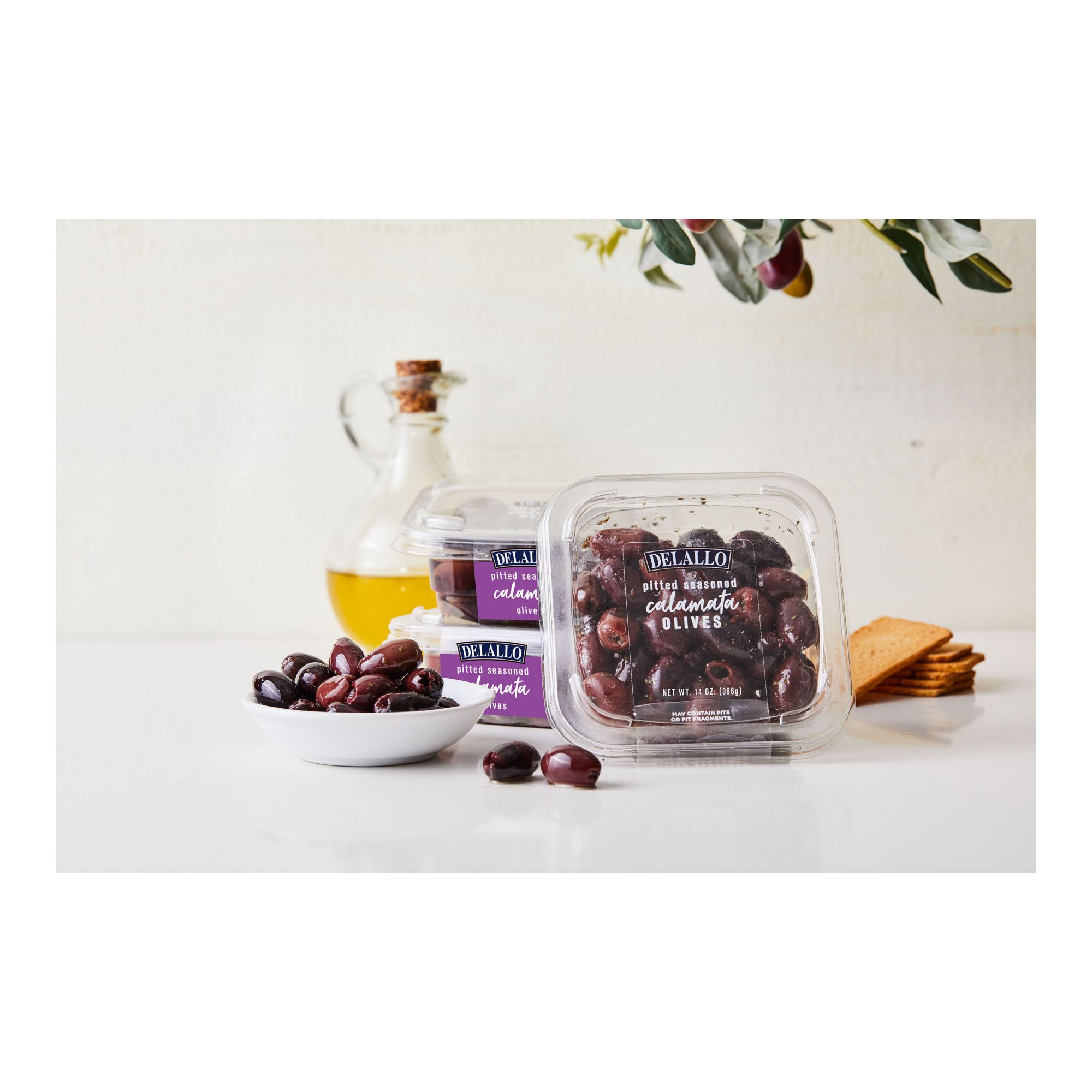 DeLallo Jumbo Seasoned Calamata Olives are prized Greek olives with a distinct purple hue and almond shape, boasting a complex tart and smoky flavor with a semi-firm texture and meaty bite. Pitted and seasoned with select herbs and spices for easy gourmet snacking and entertaining.