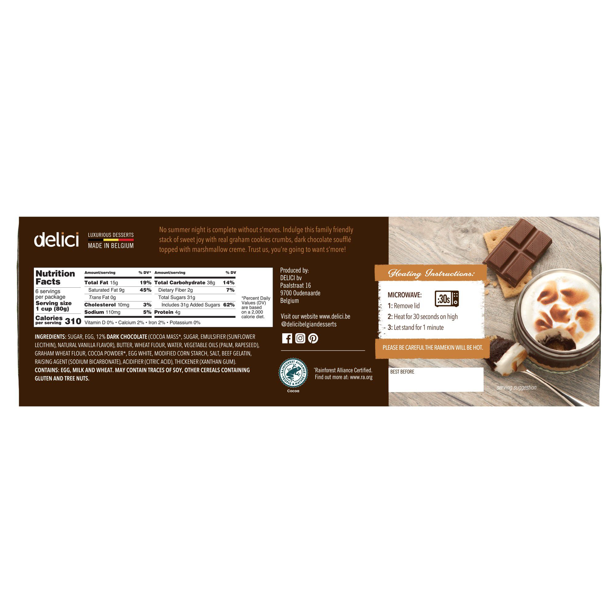 Six-pack souffle dessert made with real graham cracker cookie crumbs, Belgian dark chocolate topped with marshmallow crème in re-usable glass ramekins. Perfect for summer parties, hangouts, BBQ nights, and lazy days. Belgian made and Belgian quality. No artificial flavors and no artificial colors.