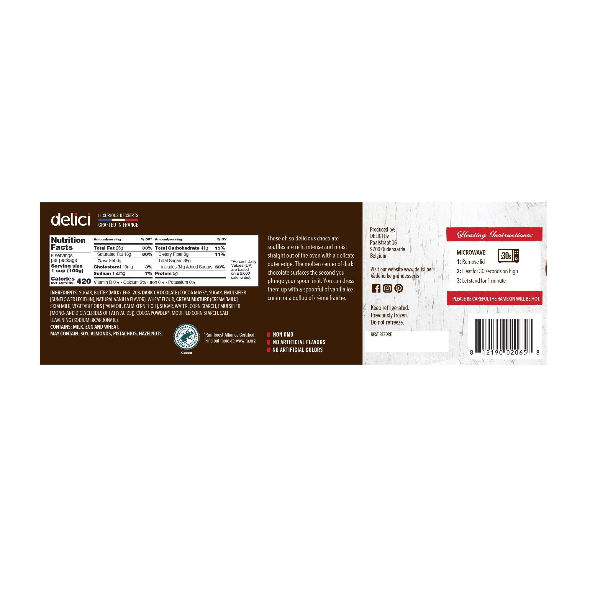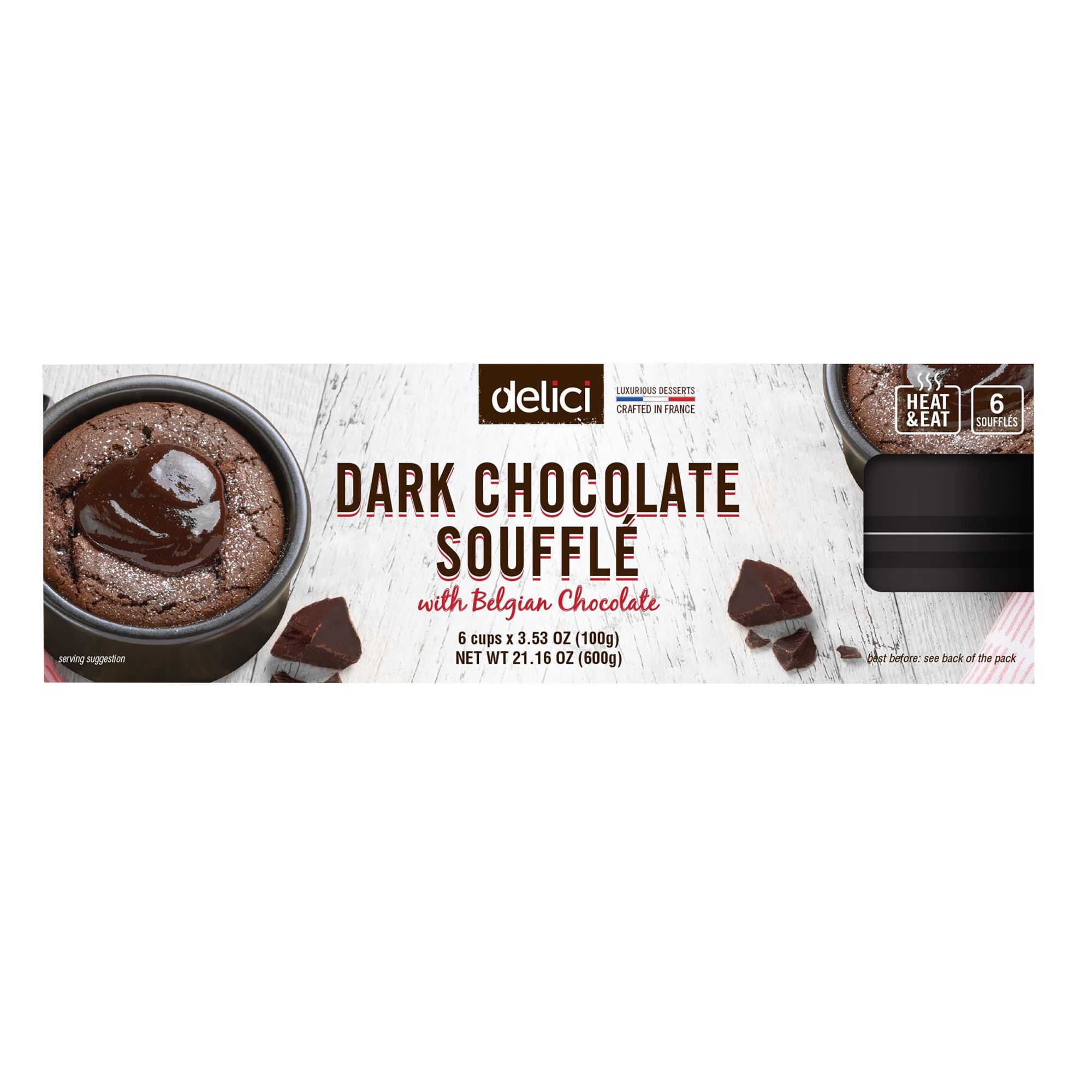 Delici Dark Chocolate Souffles are intensely flavored, straight-out-of-the-oven quality, dark chocolate desserts. Warm the prepared souffles and enjoy the molten dark chocolate center. This pack is perfect to serve as a quick and easy dinner party dessert.