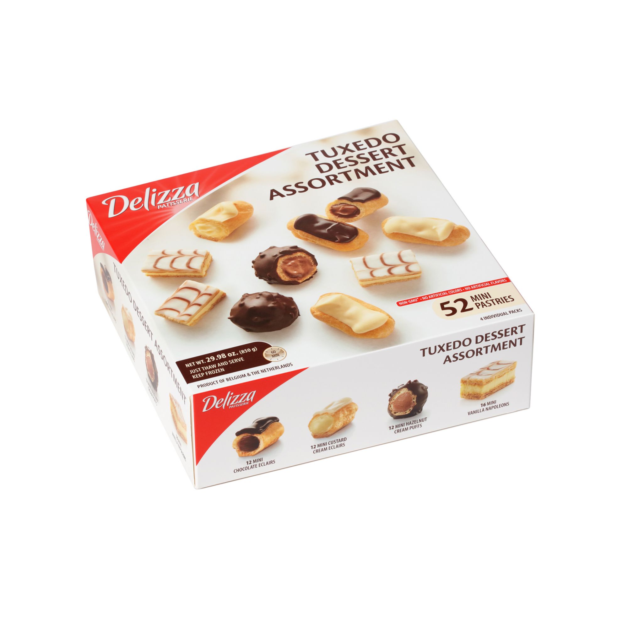 Delizza Tuxedo Assortment is a delicious and indulgent variety of Belgium Mini-Pastries including Mini Eclairs with a chocolate filling, topped with dark chocolate; Mini Eclairs with Bavarian Cream topped with white chocolate; Mini Hazelnut Cream Puffs; Mini Vanilla Napoleons. This assortment is crafted from time-honored recipes and using only the finest ingredients. Bite-size and so easy to prepare! just remove from freezer and let thaw, then enjoy. See package for thawing instructions. The Delizza Tuxedo Dessert Assortment is the perfect pastry dessert to share with family and friends at any gathering, elegant or casual, or for an indulgent snack when you want one.