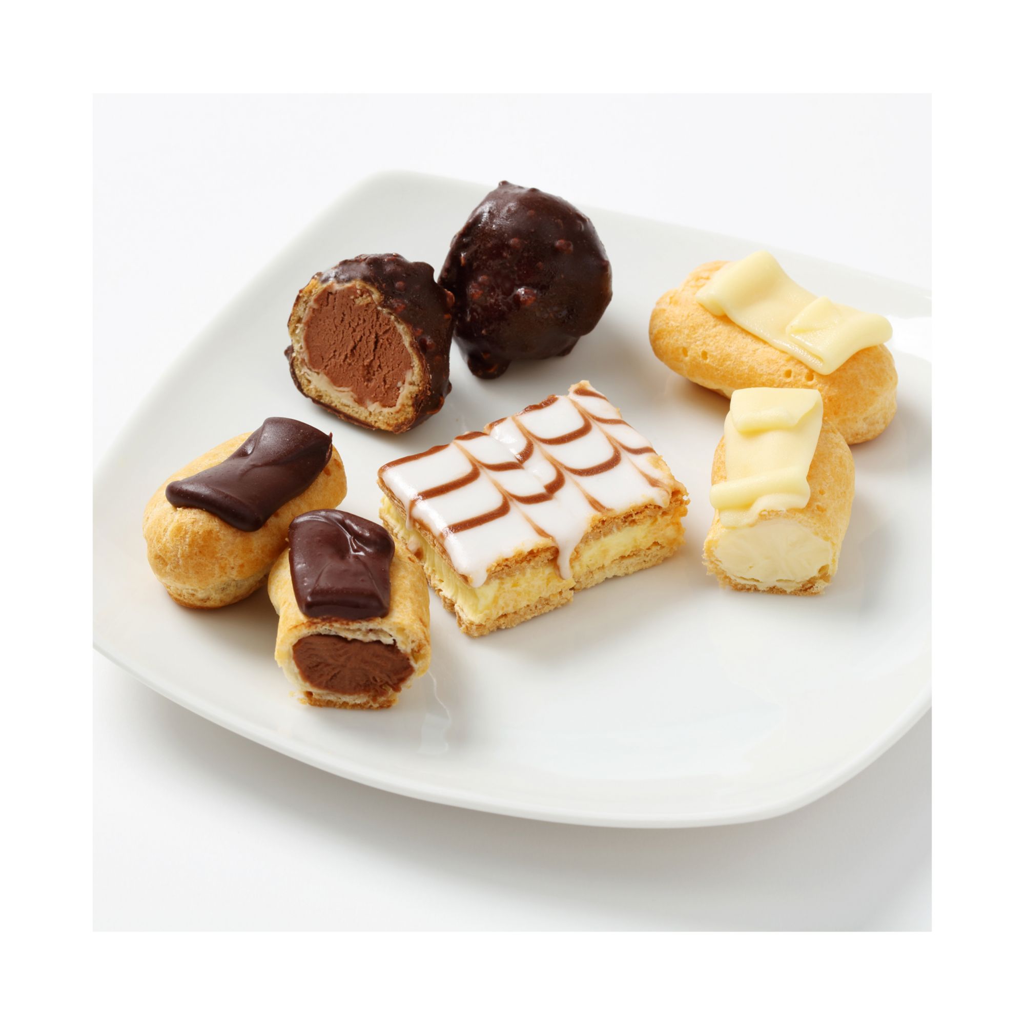 12 Mini Eclairs with a chocolate filling topped with dark chocolate, 12 Mini Eclairs with Bavarian Cream topped with white chocolate, 12 Mini Hazelnut Cream Puffs, 16 Mini Vanilla Napoleans