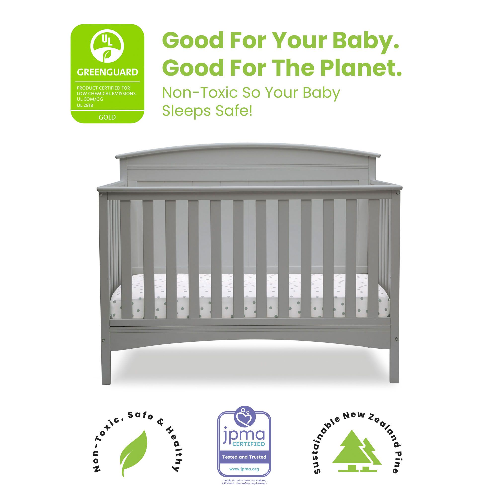 This crib is GREENGUARD Gold Certified, meaning it meets or exceeds stringent chemical emissions standards
