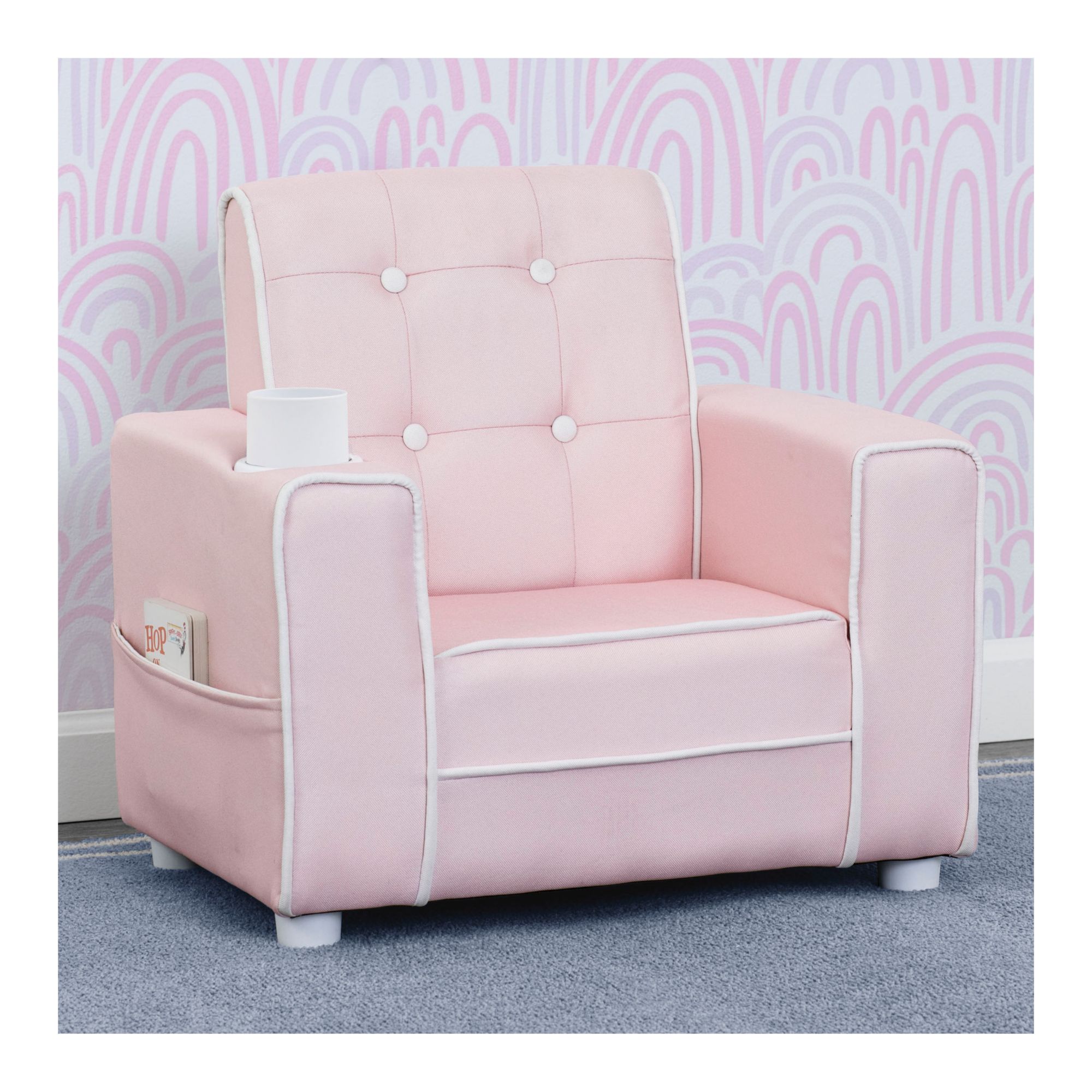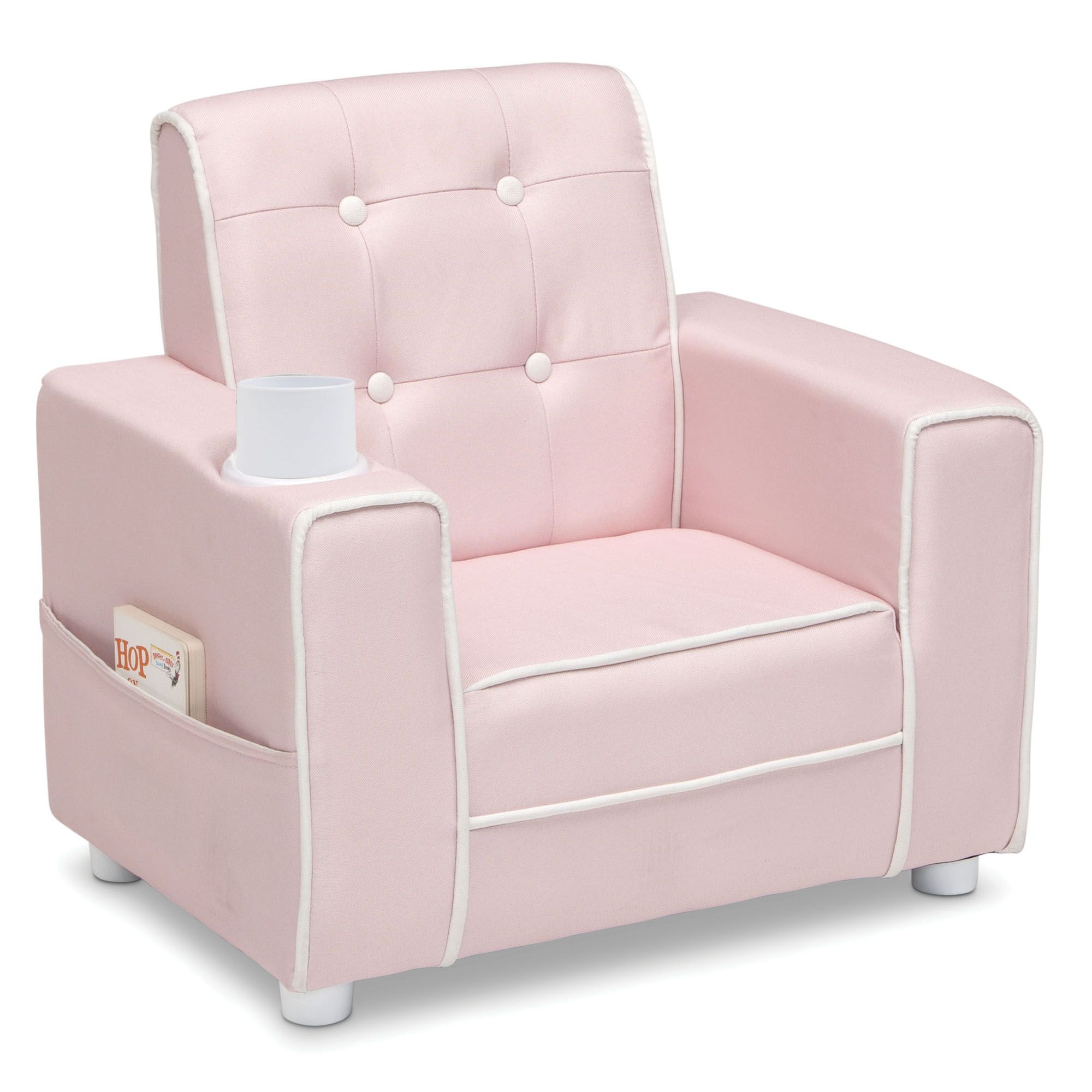 The Chelsea Kids Upholstered Chair with Cup Holder from Delta Children will give your little one a comfy place to read or relax. Button tufting on the back and contrasting piping add grown-up style to this child-size chair while the built-in cup holder and storage pockets on the sides add convenience. A chic addition to any children’s bedroom, playroom, or living room, this chair is crafted with a sturdy wood base and a generous foam fill to ensure it is as comfortable as it is stylish. Chair coordinates with other items in the Chelsea Collection from Delta Children.