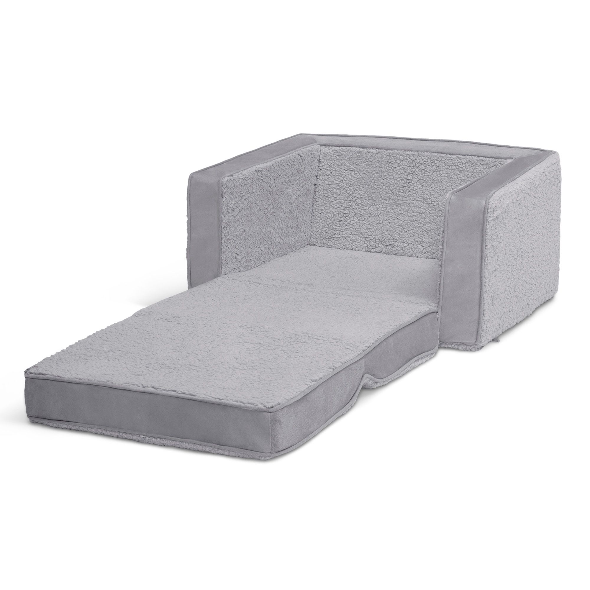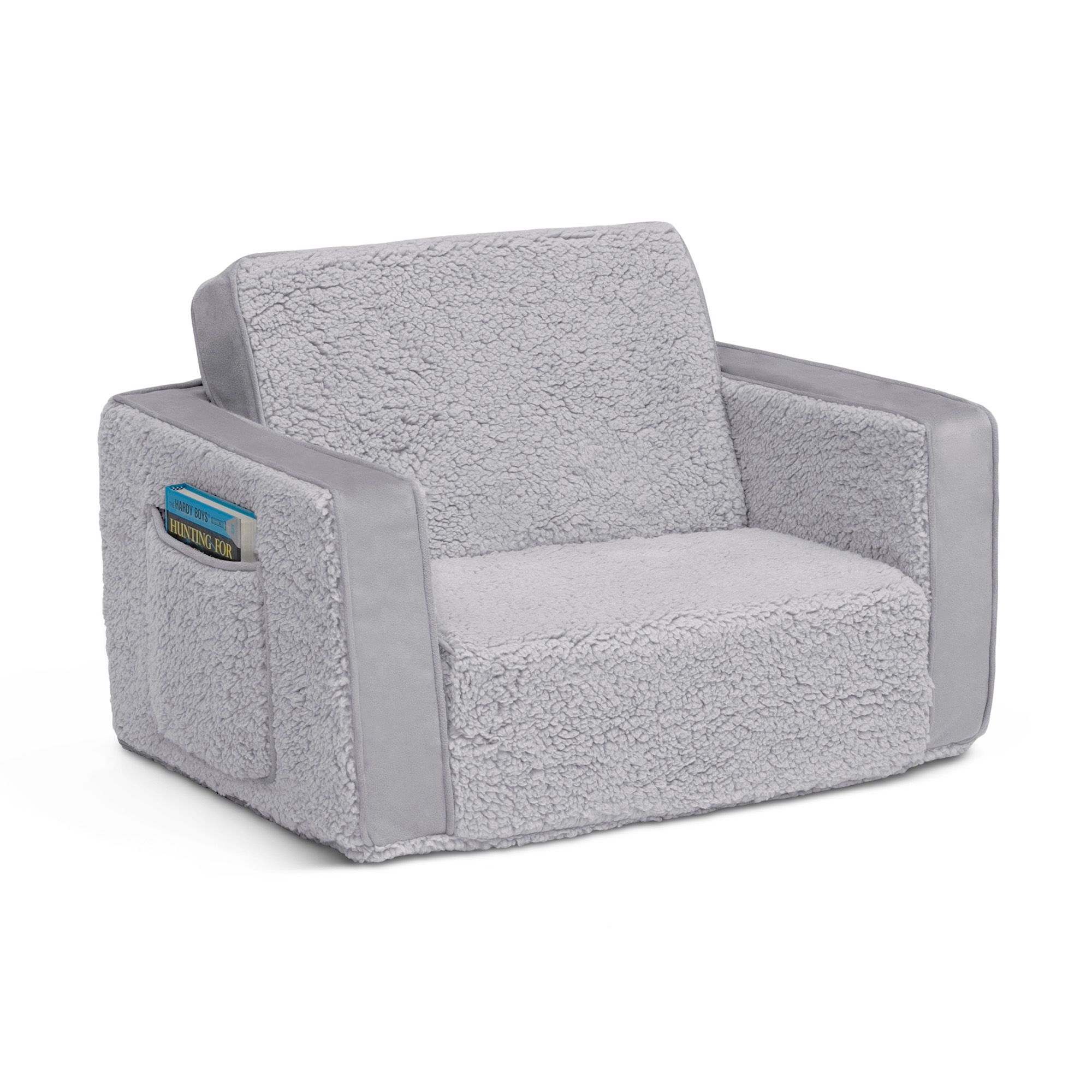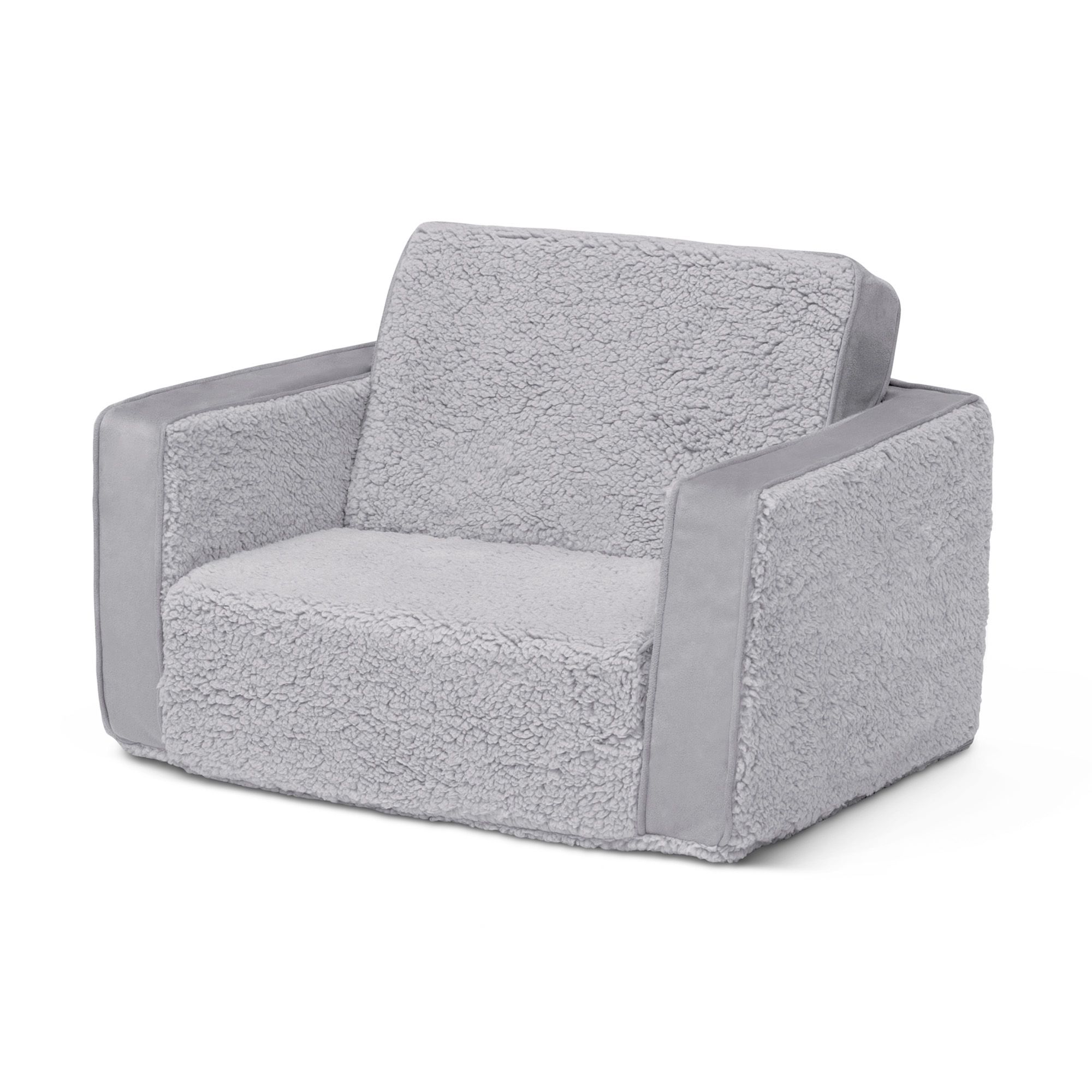 The Cozee Flip-Out Sherpa 2-in-1 Convertible Chair to Lounger by Delta Children is a cozy chair by day, laid-back lounger by night. This convertible seat easily flips open to reveal multiple ways for your child to relax. They’ll love to sit and read or watch their favorite movies on the chair, but when it’s time for a nap, this seat folds out into a comfy sleeper bed. Big enough to fit two small kids comfortably in chair mode, it’s light enough to move around the house and is ideal for your children to share during playtime or sleepovers. The super-soft sherpa and suede slipcover with easy-to-reach side pocket creates the ultimate retreat for your little one. The supportive foam construction will keep its shape and provides all-day comfort. Designed to ship in a super-small box, this lightweight foam kids’ chair and lounger may take up to 24 hours to fully expand once unboxed. Machine-washable slipcover zips off for easy cleaning.