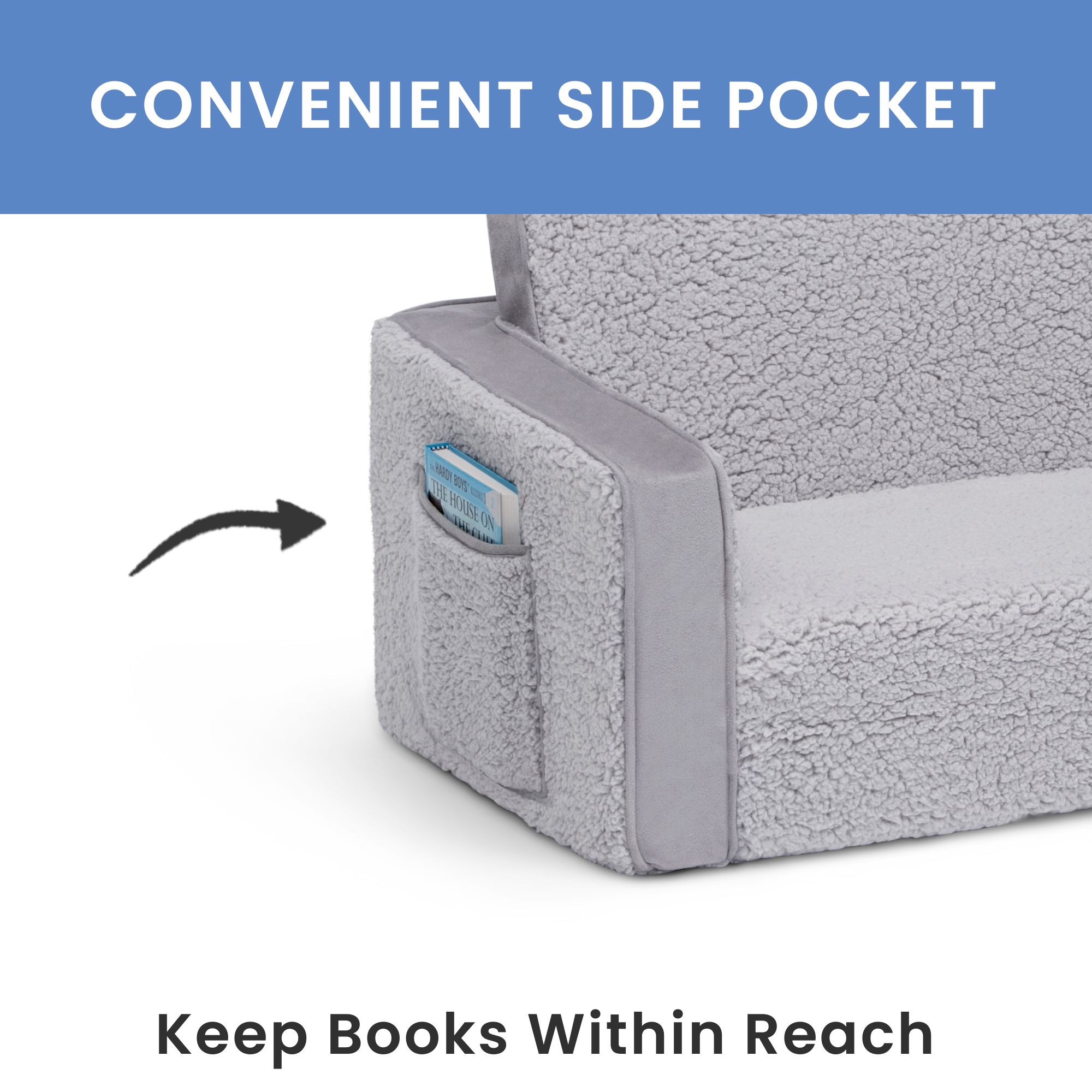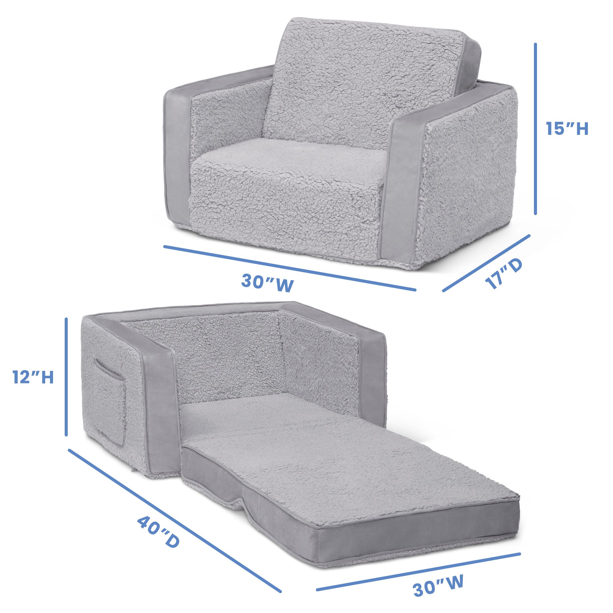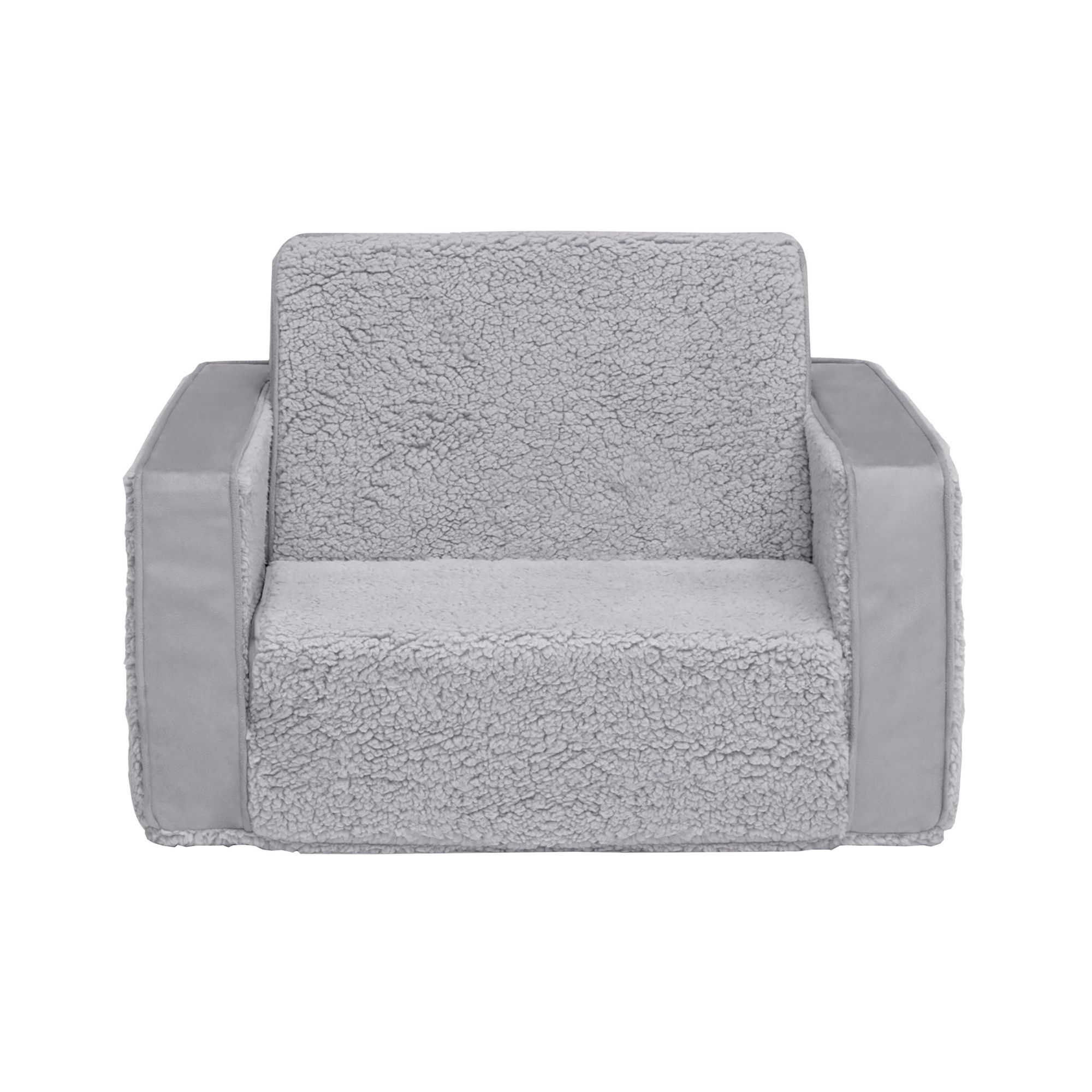 The Cozee Flip-Out Sherpa 2-in-1 Convertible Chair to Lounger by Delta Children is a cozy chair by day, laid-back lounger by night. This convertible seat easily flips open to reveal multiple ways for your child to relax. They’ll love to sit and read or watch their favorite movies on the chair, but when it’s time for a nap, this seat folds out into a comfy sleeper bed. Big enough to fit two small kids comfortably in chair mode, it’s light enough to move around the house and is ideal for your children to share during playtime or sleepovers. The super-soft sherpa and suede slipcover with easy-to-reach side pocket creates the ultimate retreat for your little one. The supportive foam construction will keep its shape and provides all-day comfort. Designed to ship in a super-small box, this lightweight foam kids’ chair and lounger may take up to 24 hours to fully expand once unboxed. Machine-washable slipcover zips off for easy cleaning.