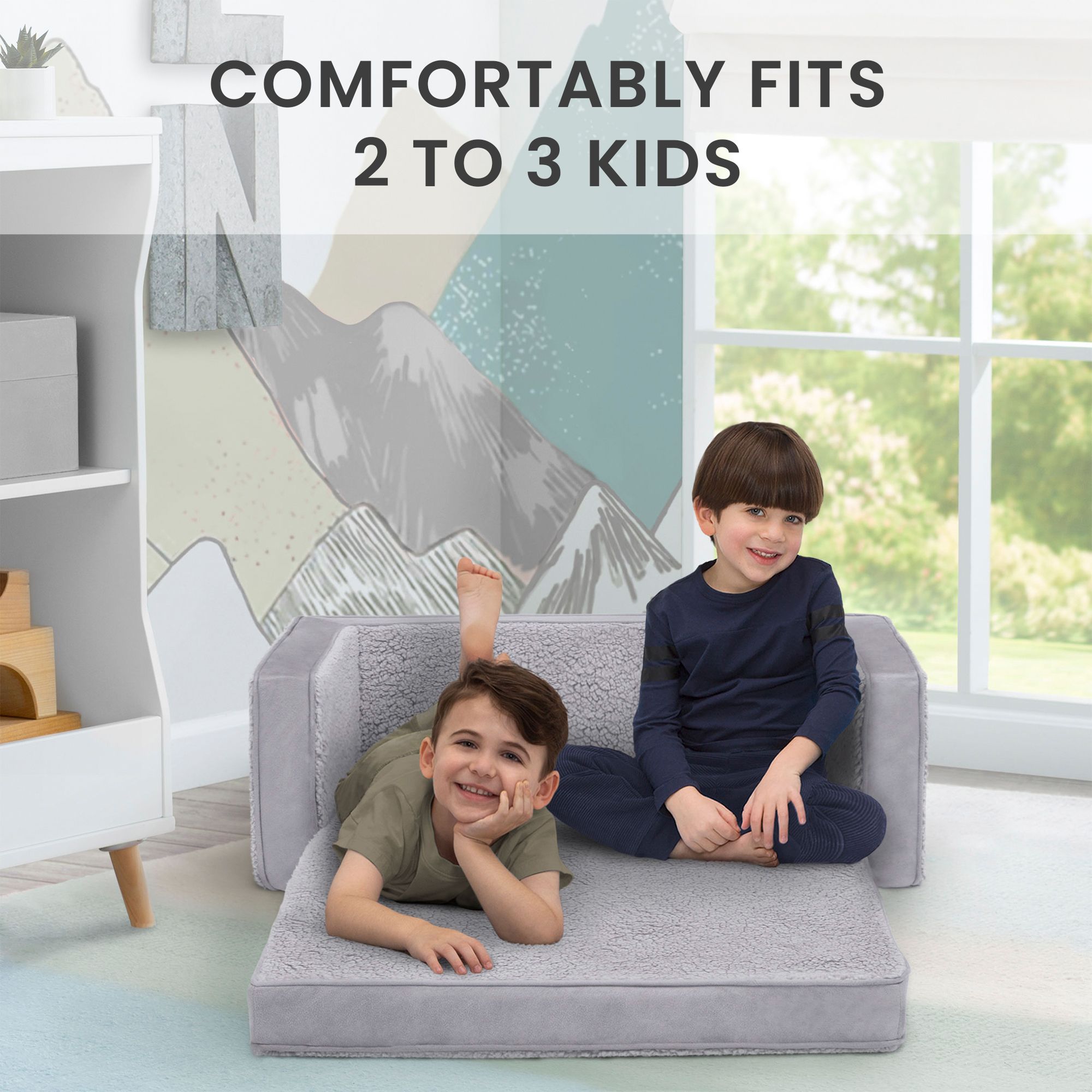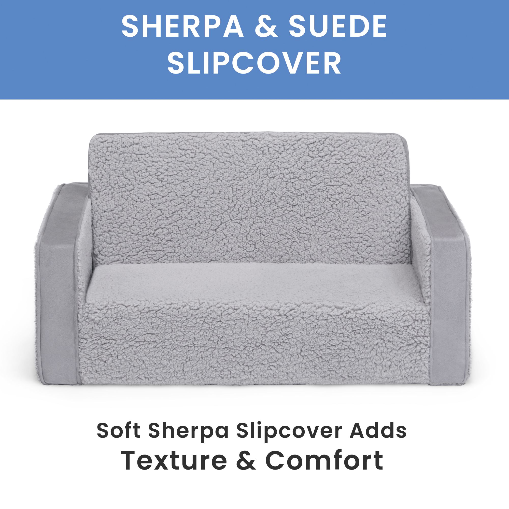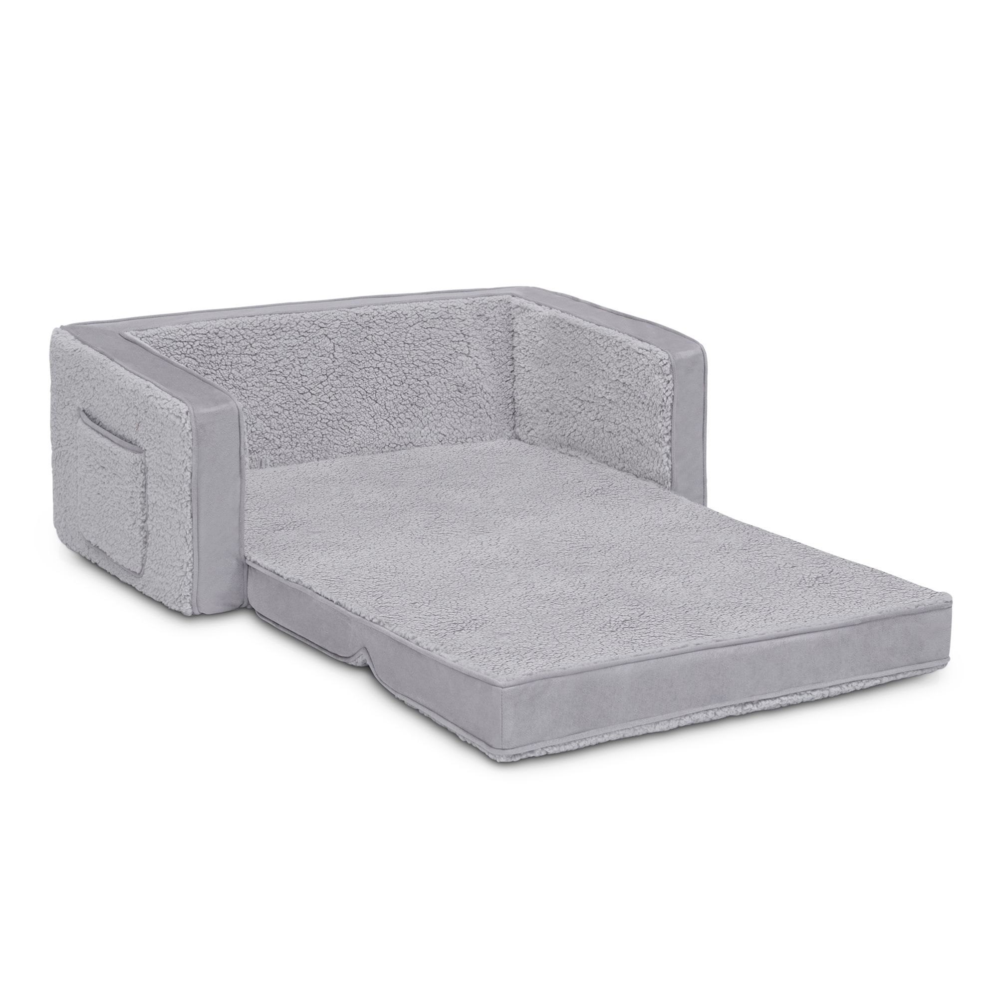 The Cozee Flip-Out Sherpa 2-in-1 Convertible Sofa to Lounger by Delta Children is a cozy couch by day, laid-back lounger by night. This convertible sofa easily flips open to reveal multiple ways for your child to relax. They’ll love to sit and read or watch their favorite movies on the sofa, but when it’s time for a nap, this seat folds out into a comfy sleeper bed. Big enough to fit three small kids comfortably in sofa mode, it’s light enough to move around the house and is ideal for your children to share during playtime or sleepovers. The super-soft sherpa and suede slipcover with easy-to-reach side pocket creates the ultimate retreat for your little one. The supportive foam construction will keep its shape and provides all-day comfort. Designed to ship in a super-small box, this lightweight foam kids’ sofa and lounger may take up to 24 hours to fully expand once unboxed. Machine-washable slipcover zips off for easy cleaning.
