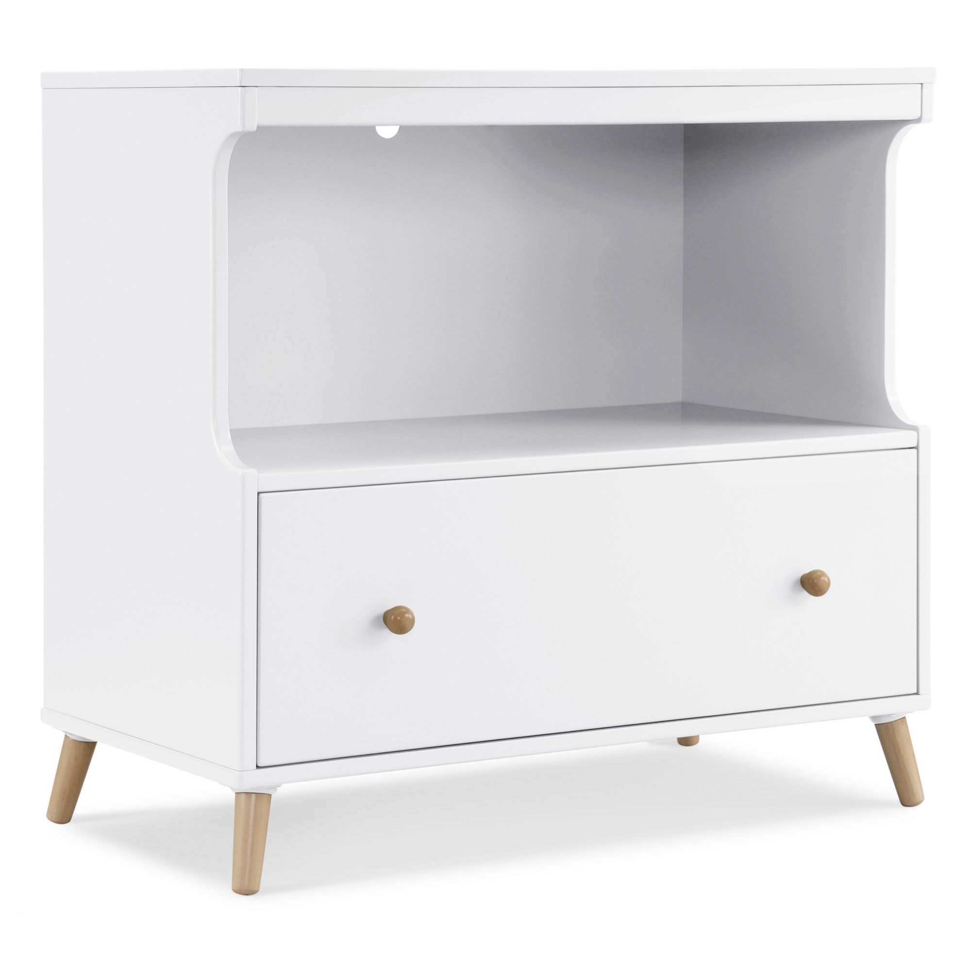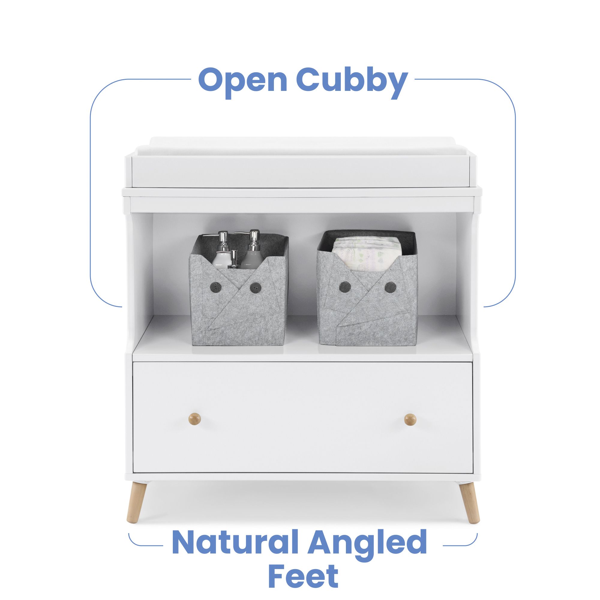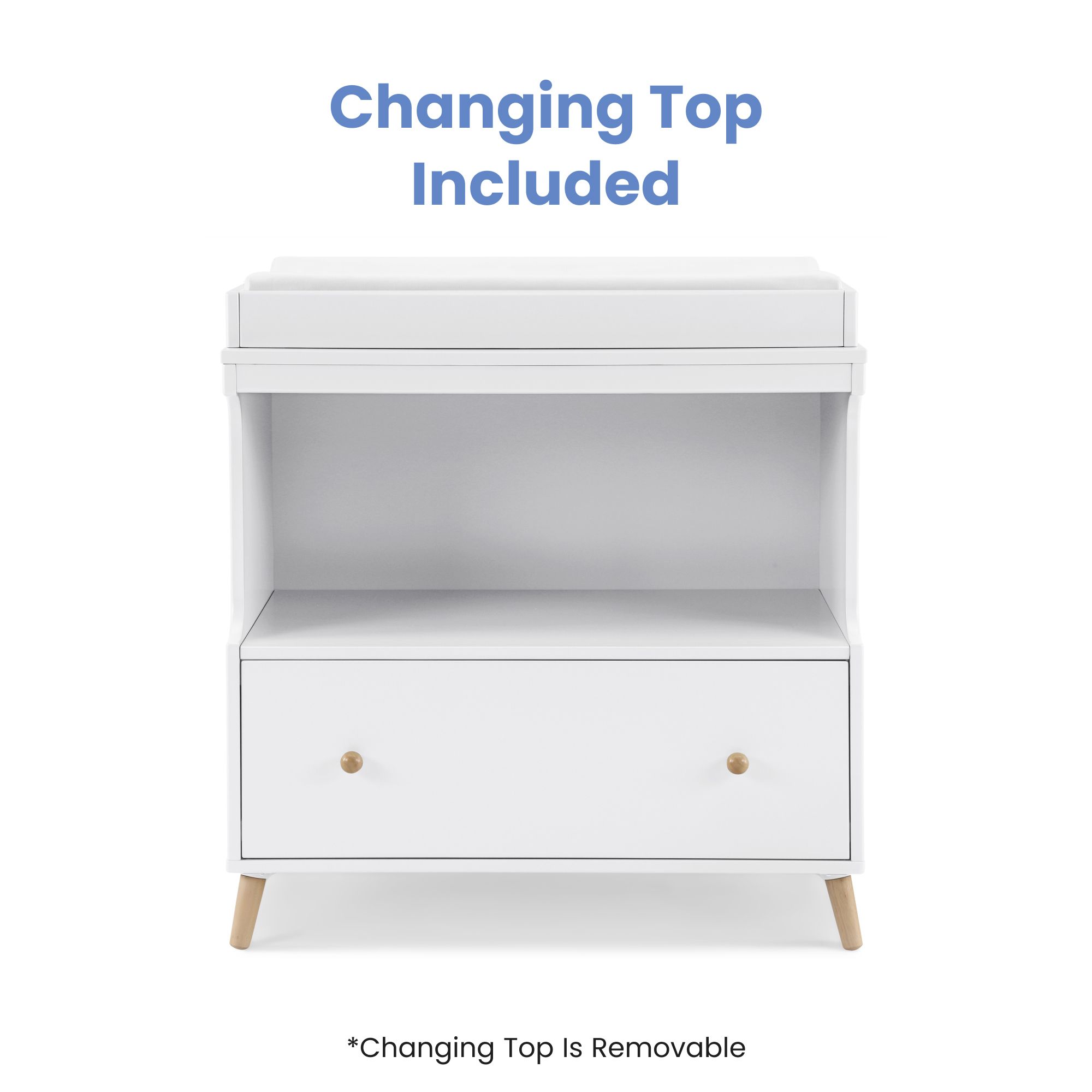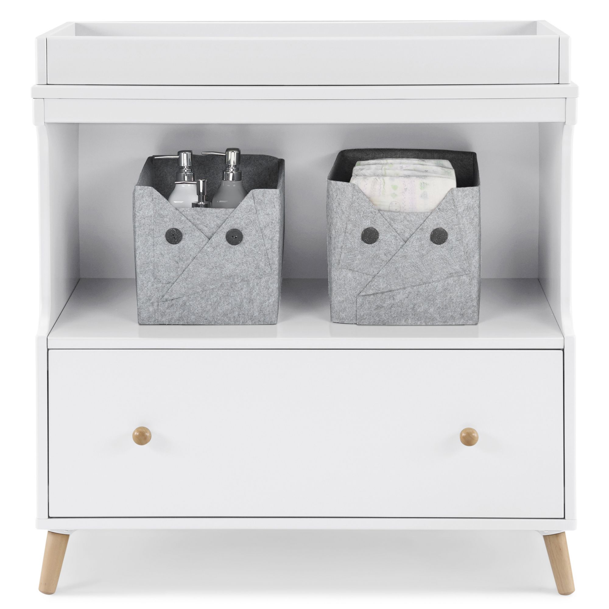 The Essex Convertible Changing Table with Drawer by Delta Children offers all the essentials—a secure place to change your baby, plus a drawer and an open cubby for all of your storage needs. A new take on iconic mid-century style, it features simple lines and angled legs in a natural finish. This convertible changing table includes a topper that keeps the changing pad firmly in place (changing pad sold separately). Best of all, its innovative two-in-one design allows the changing topper to be easily removed once your child is potty-trained, effortlessly converting the piece into a standalone dresser. A great option that will grow with your child, from nursery to big-kid room, the Essex Changing Table with Drawer by Delta Children is also ideal for shared bedrooms, or anywhere you need a space-saving storage piece.