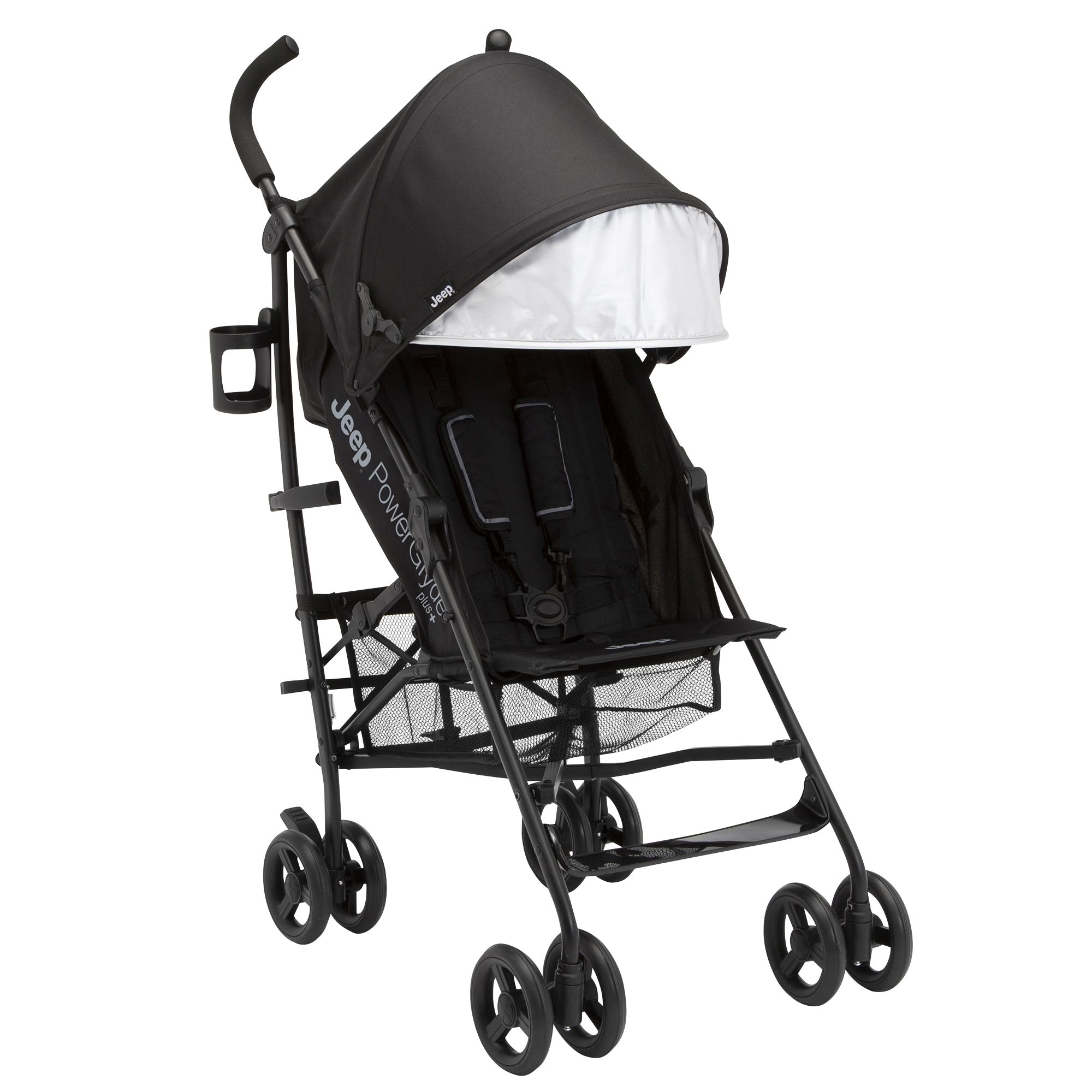 Wherever the road takes you, the Jeep PowerGlyde Plus Stroller by Delta Children will deliver the best ride ever. The Jeep PowerGlyde Plus offers the most advanced handling thanks to all-new front wheels that feature precision technology, making it easier than ever to glide, turn and maneuver any surface. Ideal for travel or everyday use, this extremely lightweight stroller with an aluminum frame weighs under 14 lbs. and features a compact umbrella fold with an auto lock design and carry handle. An extra-large extendable canopy with UPF 50+ sun visor will protect your child from the elements and a four-position reclining seat ensures baby is comfortable during walks, near and far. Some additional features of this lightweight stroller include: five-point safety harness, extra-large storage basket, cup holder and swivel front wheels. This stroller is recommended for infants six months up to 50 lbs.