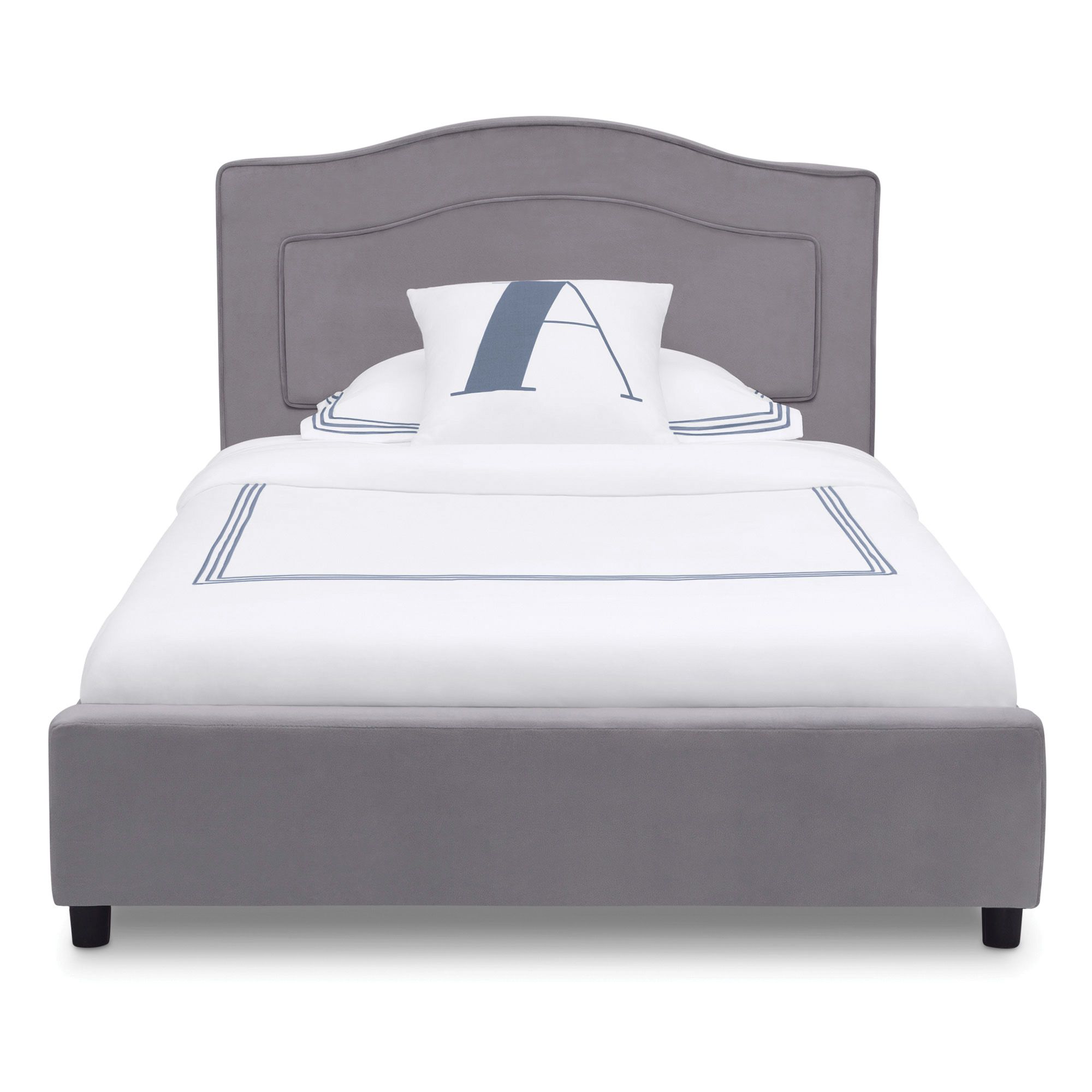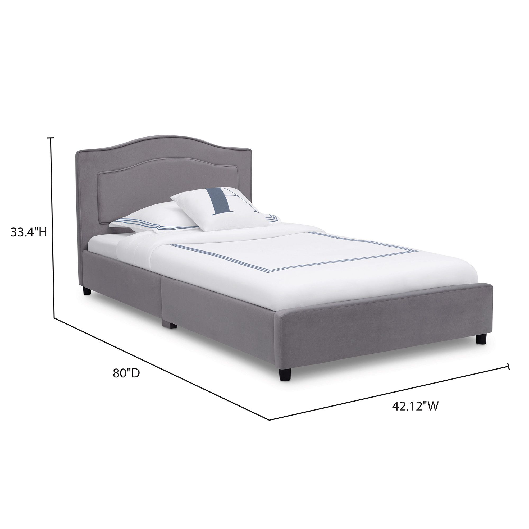 Inspire sweet dreams with this Upholstered Twin Bed by Delta Children. Perfect for your little one's bedroom, this kids' twin bed boasts velvety grey upholstery for a timeless look both you and your child will love. Generous padding ensures long-lasting comfort and support while sitting up to read or watch TV. The bed's durable wood platform frame with slats eliminates the need for a box spring. Twin mattress sold separately.