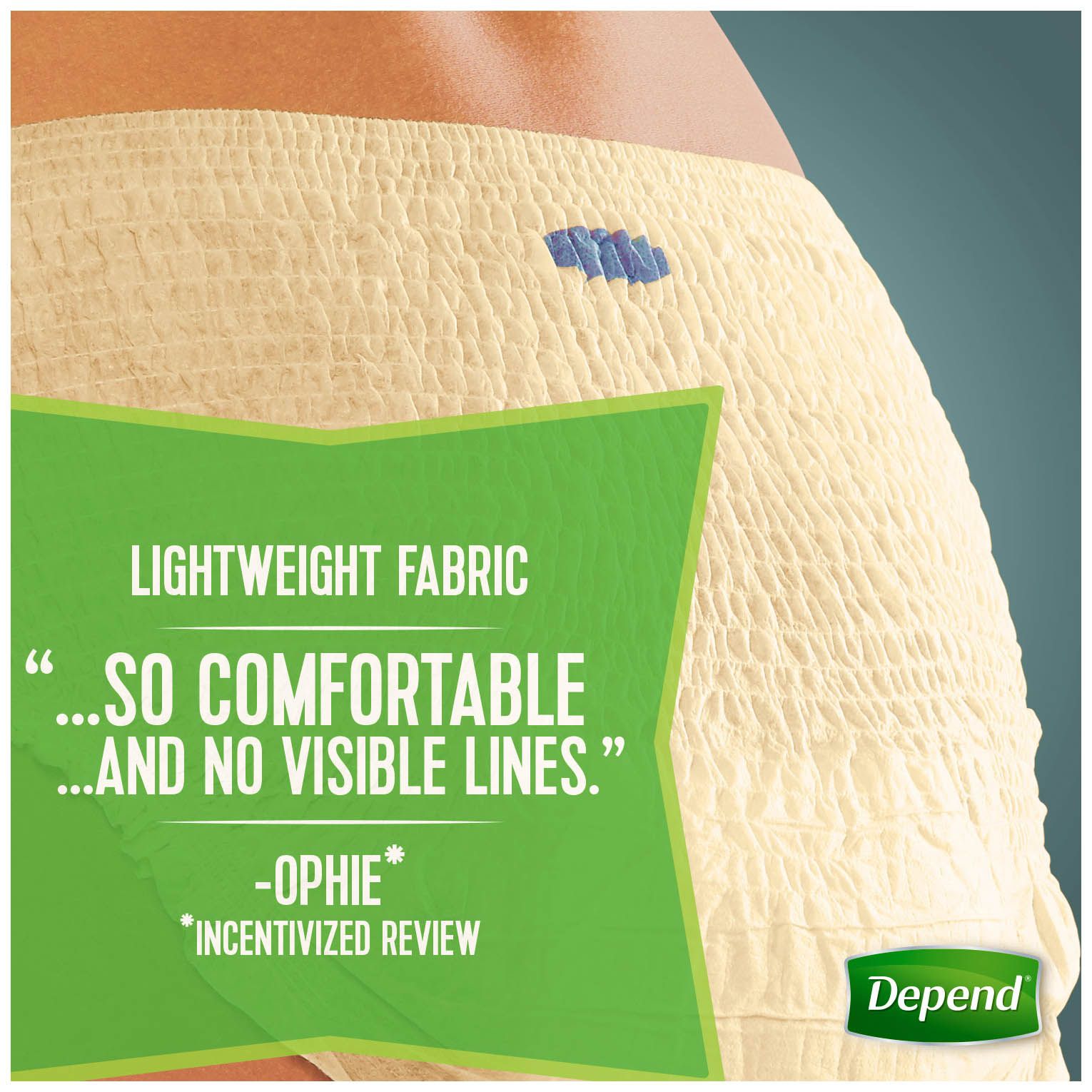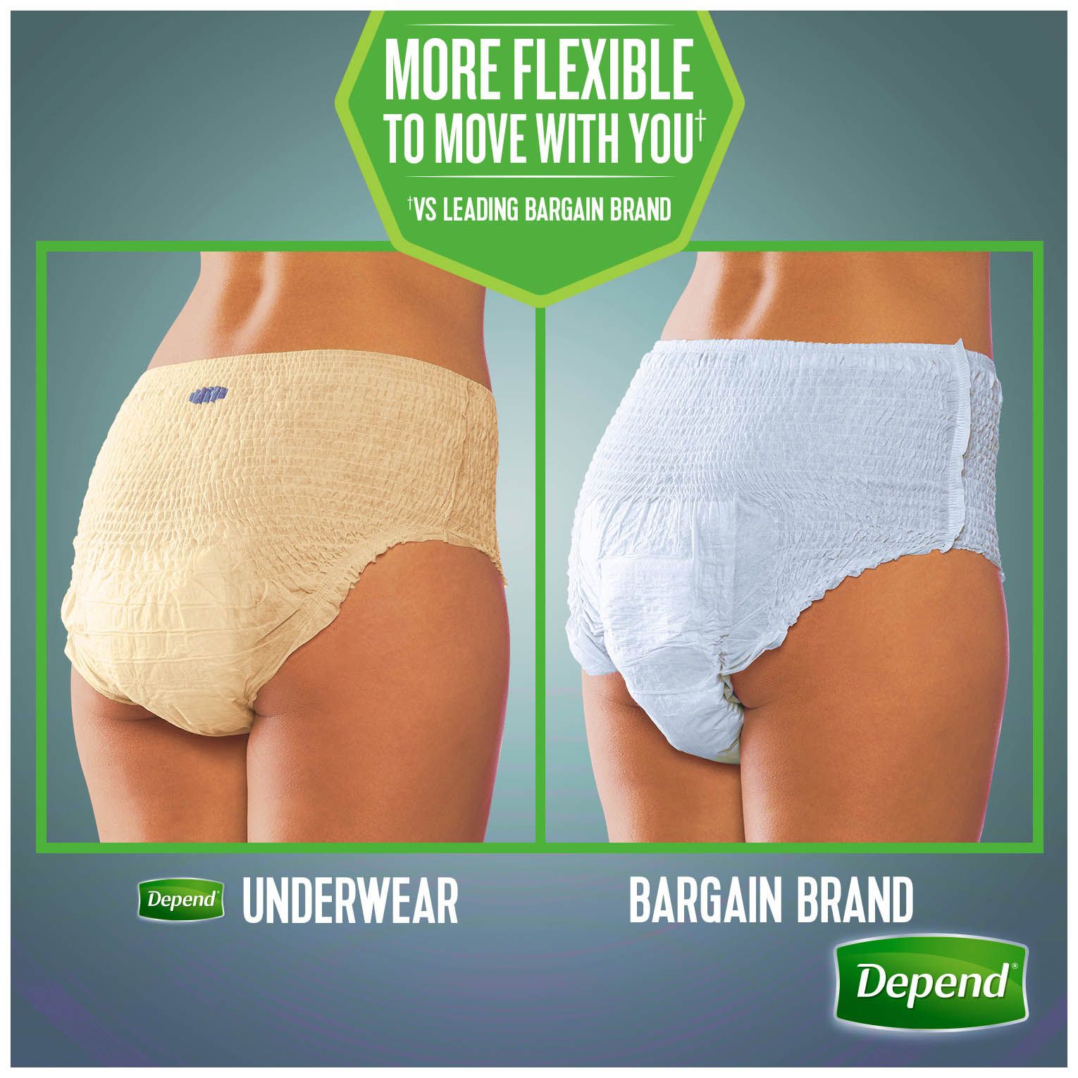 Incontinence underwear with maximum absorbency, odor control and soft, flexible fabric is Your Best Comfort and Protection Guaranteed* Material absorbs immediately, keeping you dry and protected from bladder leaks Comfortable, underwear-like fit with SureFit waistband Form-fitting elastic strands for a smooth, discreet fit under clothes that are flexible to move with you, unlike bulky adult diapers Soft incontinence underwear for women now in a feminine blush color with three new designs Depend adult incontinence products always ship in a discreet box FSA-eligible in the U.S. only