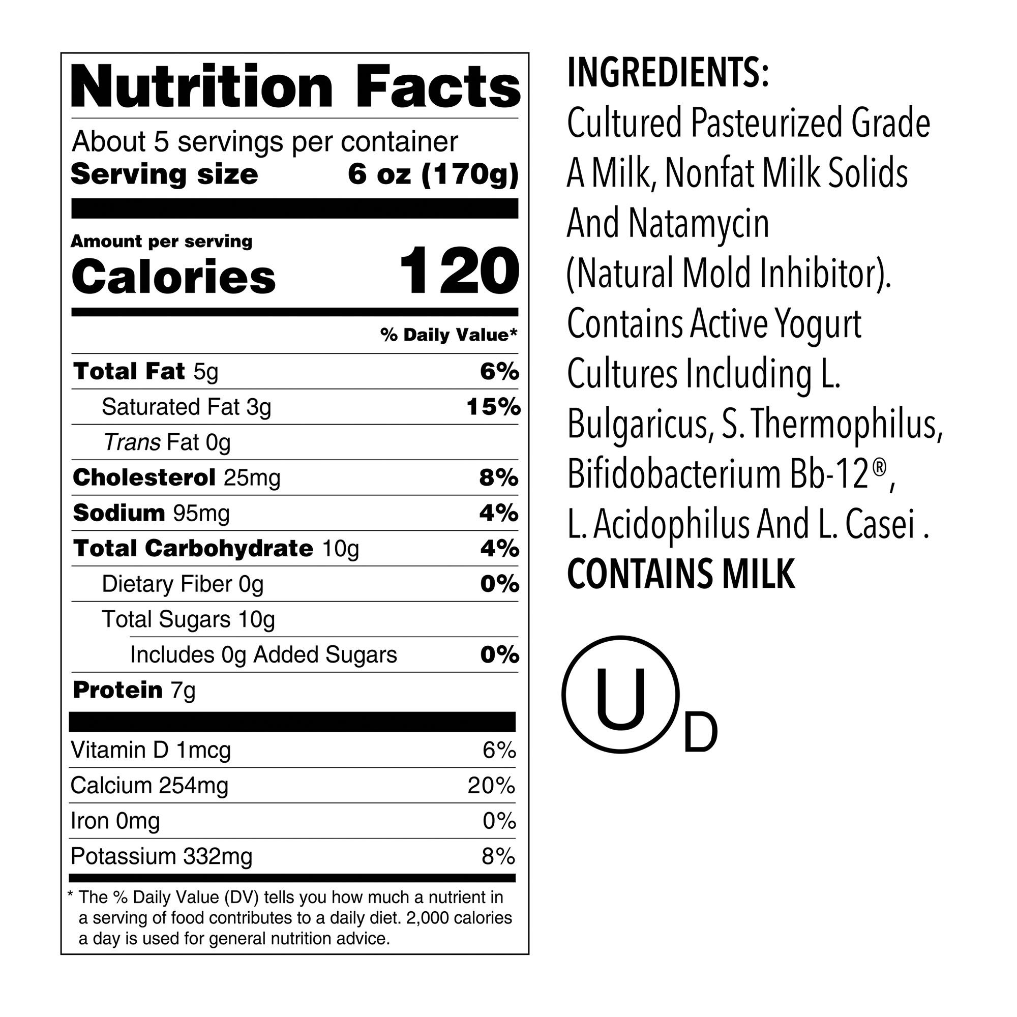 Ingredients: Cultured Pasteurized Grade A Milk, Nonfat Milk Solids And Natamycin (Natural Mold Inhibitor), Contains Active Yogurt Cultures Including L. Bulgaricus, S Thermophilus, Bifidobacterium Bb-12, L. Acidophilus And L. Casei.