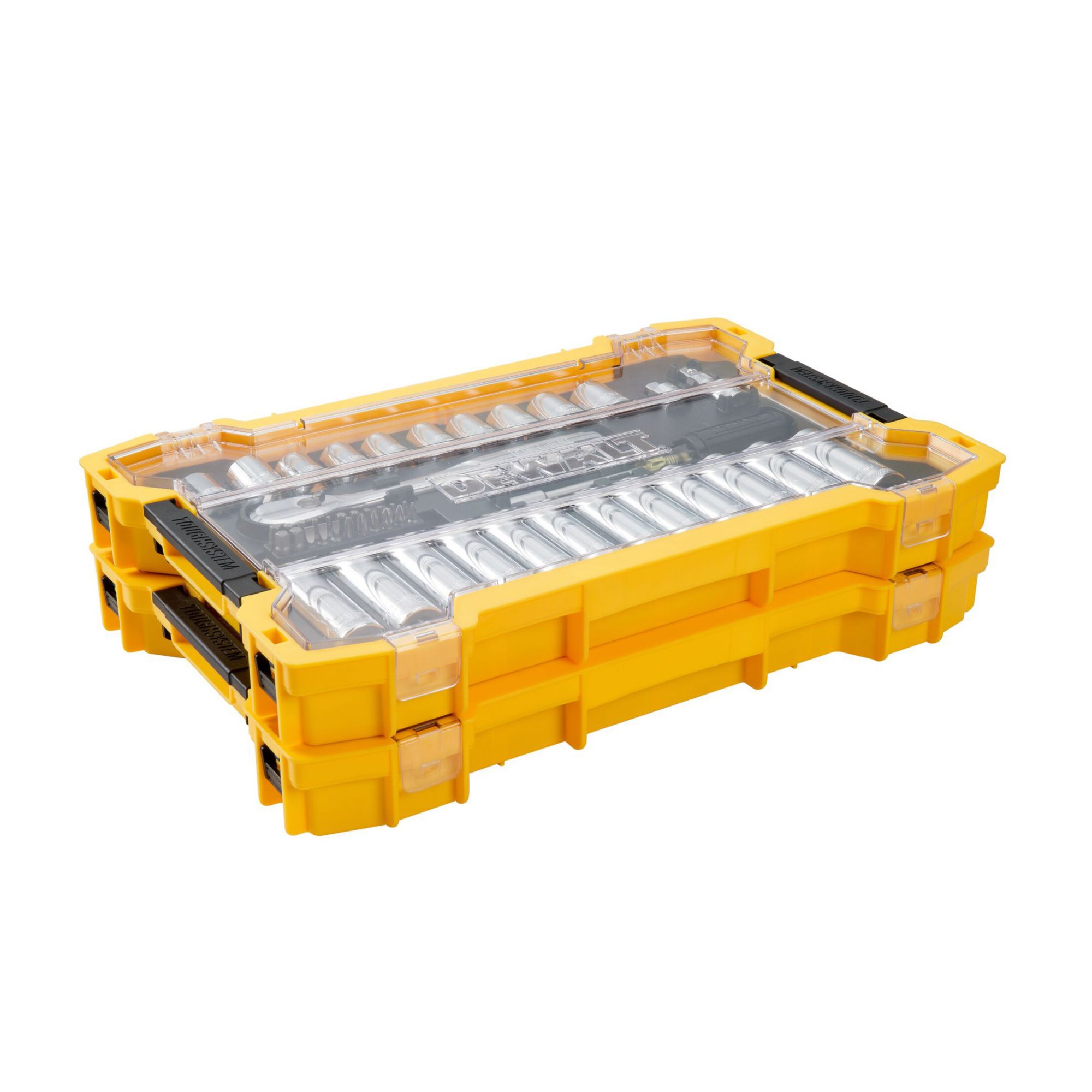 Stay Organized on the Jobsite: Two included ToughSystem® 2.0 shallow tool trays, 2 molded inserts, and 2 compatible lids High Maneuverability in Confined Spaces: 72-tooth count ratchet provides a 5° arc swing Comfortable Grip: With anti-slip driver handle Corrosion-Resistant: Each piece features a full-polish chrome design Quick Socket Retrieval: Clear identification on sockets with hard stamped markings Includes 1/4" sockets and deep sockets, 3/8" sockets and deep sockets, 1/4" and 3/8" extension bars, nut and specialty bits, 3/8" spark plug, hex keys, bit driver, socket adapter, ratchets