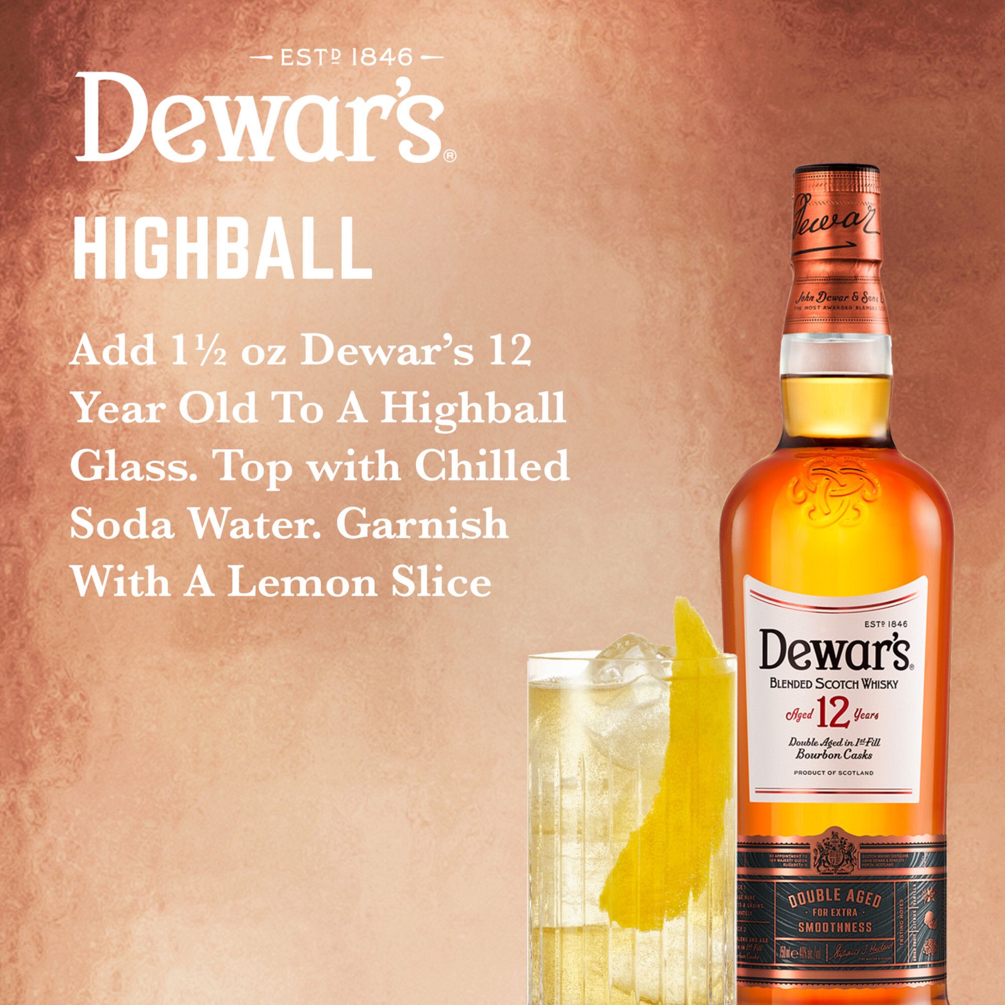 Dewar's 12 Year Old is a double-aged Blended Scotch Whisky to be experienced. This scotch liquor delivers a smooth rich taste with notes of dried fruit, citrus and vanilla. This all-round extra smooth blend won Double Gold at the 2021 San Francisco World Spirits Competition. After you've experienced Dewar's 12 Year Old neat, you can then go on to appreciate its more complex flavors in an Original Highball or try an Aromatic Highball, which is a rich, refreshing, sweet and herbaceous version of this now classic drink. You can also kick the flavorful experience up a notch by pairing this oak cask whisky with delectable foods like aged Gouda cheese, mixed nuts and bread pudding. The extra years spent aging in oak casks result in richer, fuller flavors and more rounded aromas for this scotch alcohol. And of course, it has Dewar's legendary smooth character. Simply put, Dewar's 12 Year Old is aged, blended and aged again. The extra step provides greater balance and smoothness. Enjoy Responsibly.