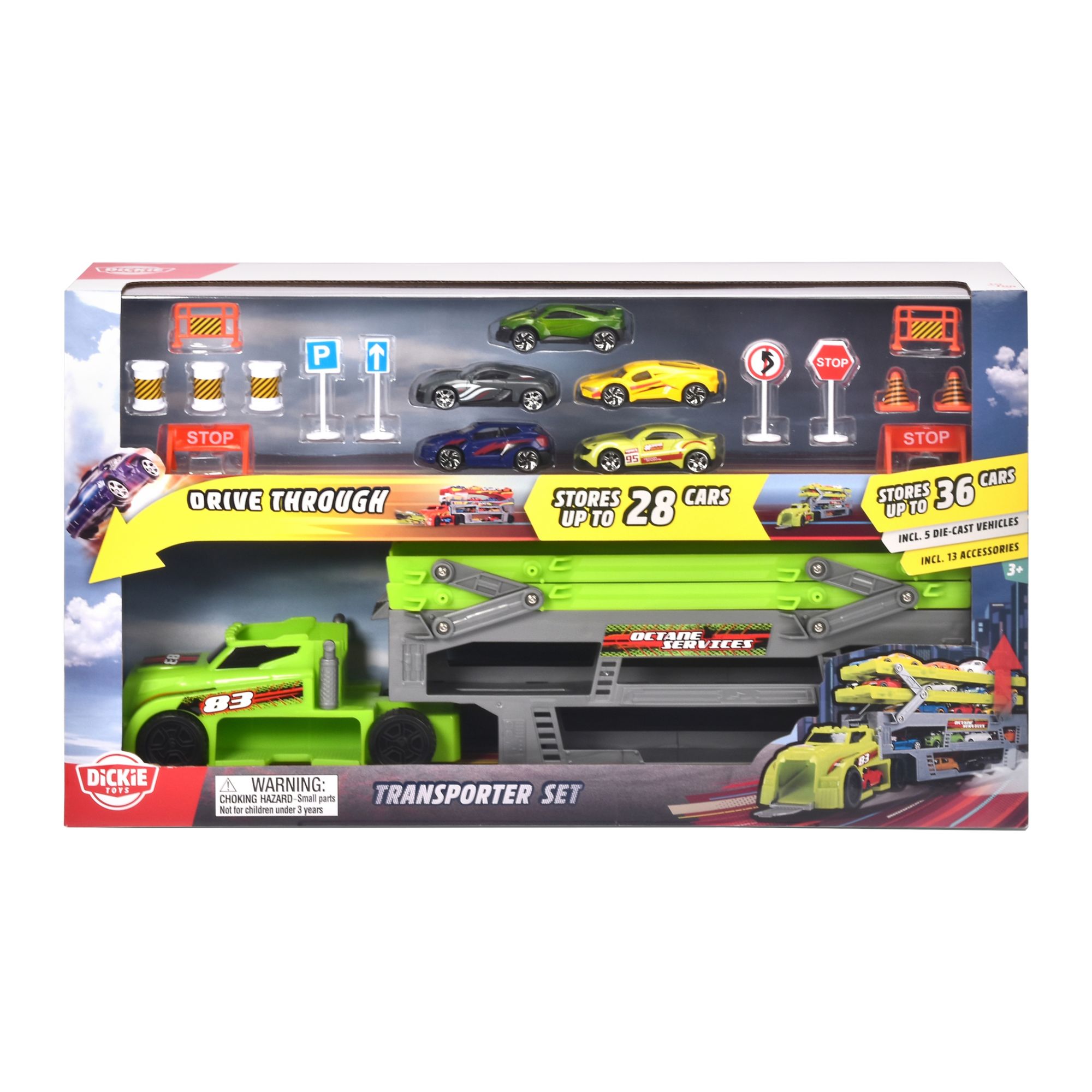 • Includes car transporter with five die-cast vehicles and 13 accessories