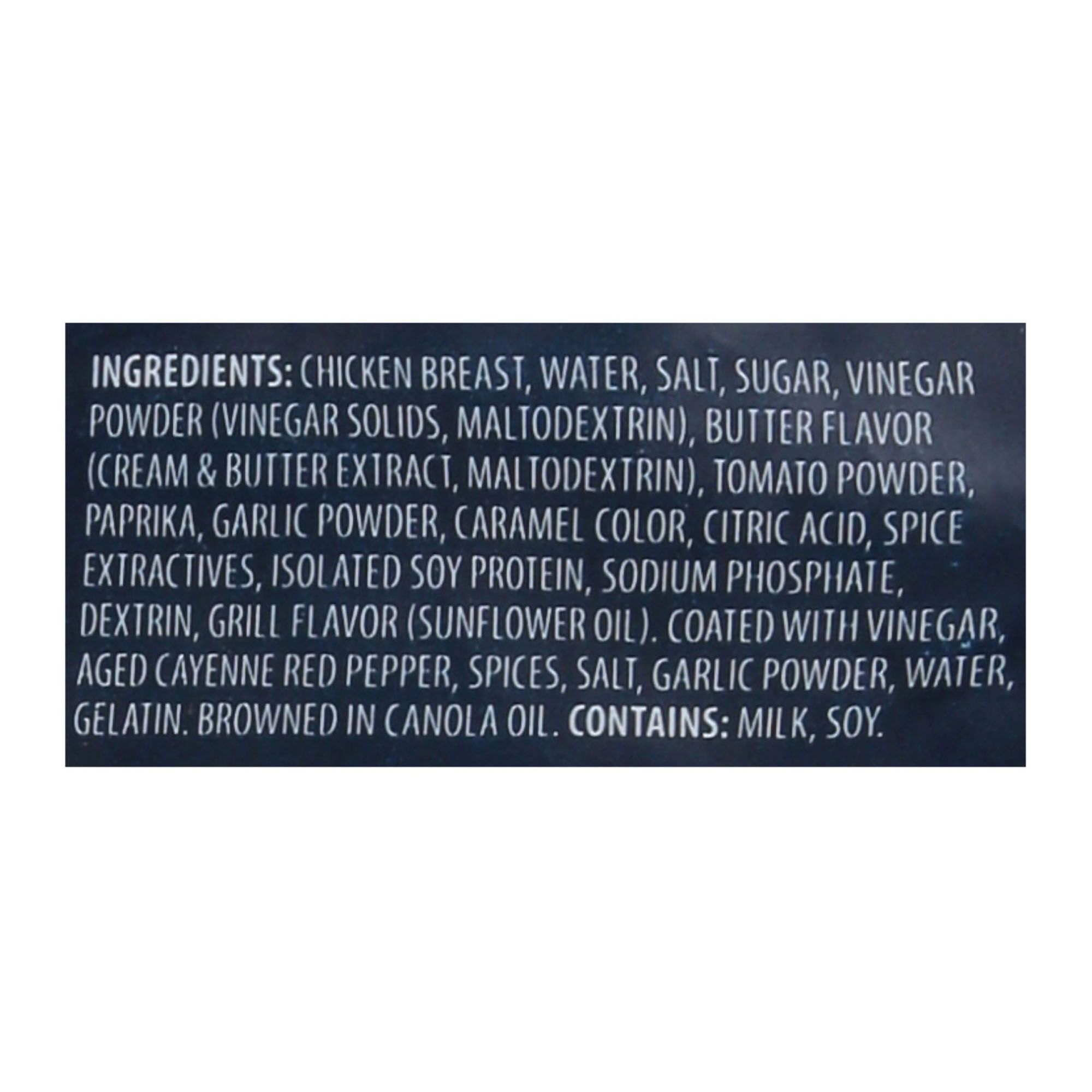 Ingredients: Chicken Breast, Water, Salt, Sugar, Vinegar Powder (Vinegar Solids, Maltodextrin), Butter Flavor (Cream & Butter Extract, Maltodextrin), Tomato Powder, Paprika, Garlic Powder, Caramel Color, Citric Acid, Spice Extractives, Isolated Soy Protein, Sodium Phosphate, Dextrin, Grill Flavor (Sunflower Oil), Coated with Vinegar, Aged Cayenne Red Pepper, Spices, Salt, Garlic Powder, Water, Gelatin, Browned in Canola Oil.