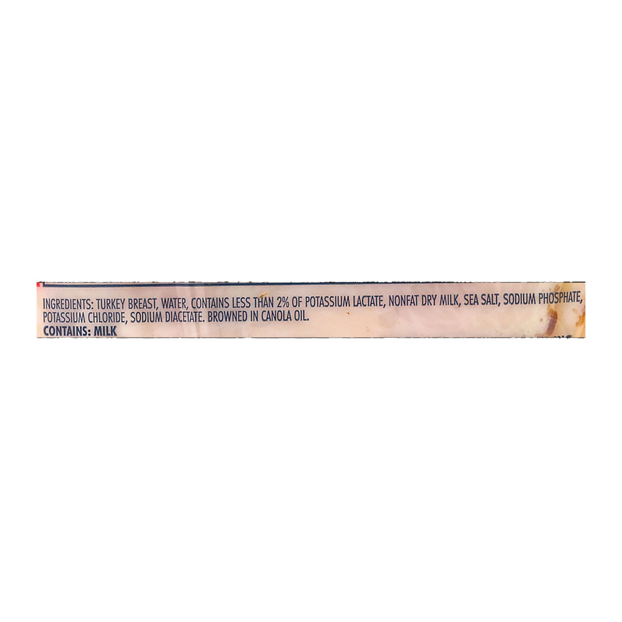 Ingredients: Turkey Breast, Water, Contains Less Than 2% Of Potassium Lactate, Nonfat Dry Milk, Sea Salt, Sodium Phosphate, Potassium Chloride, Sodium Diacetate. Browned In Canola Oil.