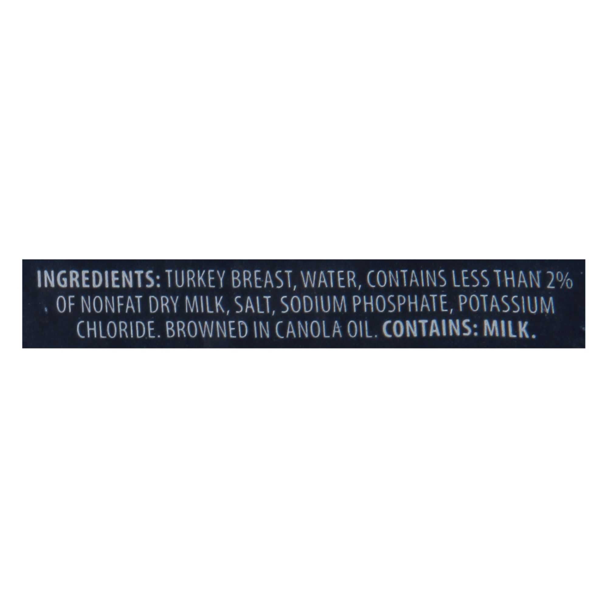 Ingredients: Turkey Breast, Water, Contains Less than 2% of Nonfat Dry Milk, Salt, Sodium Phosphate, Potassium Chloride, Browned in Canola Oil.